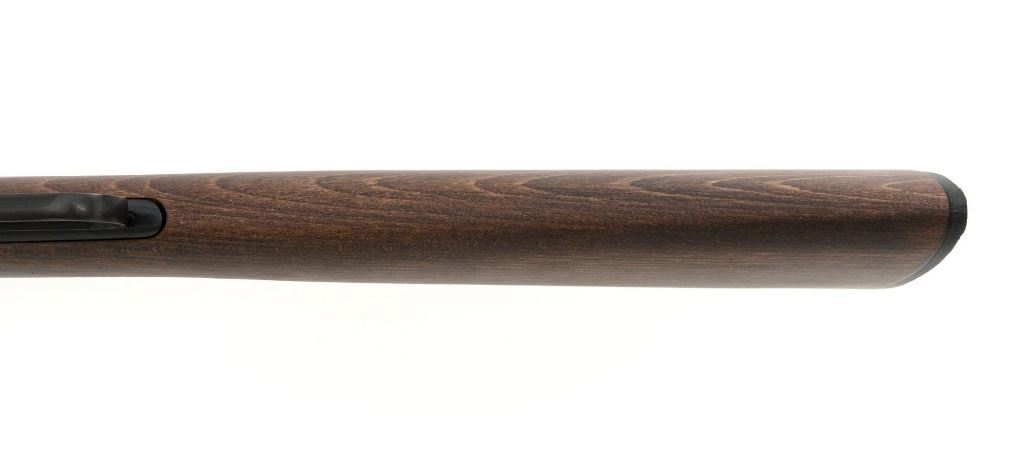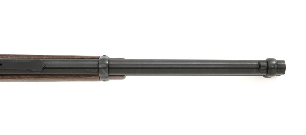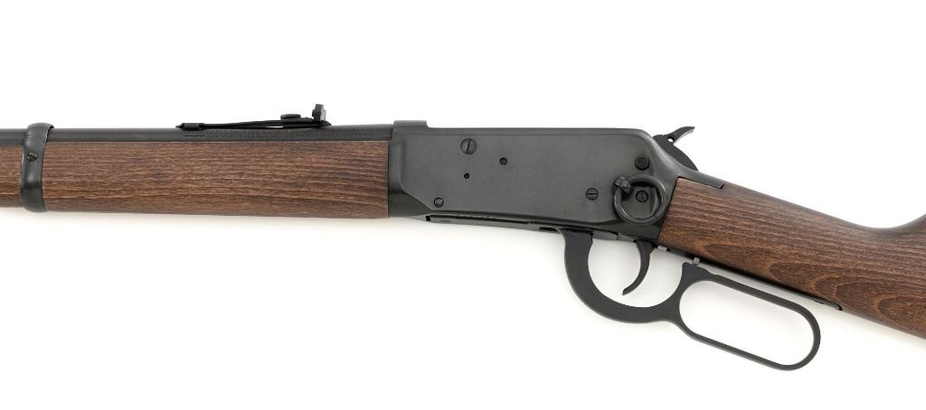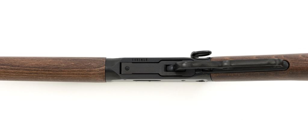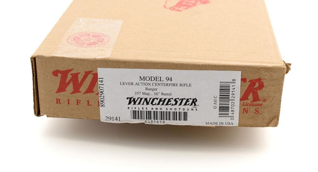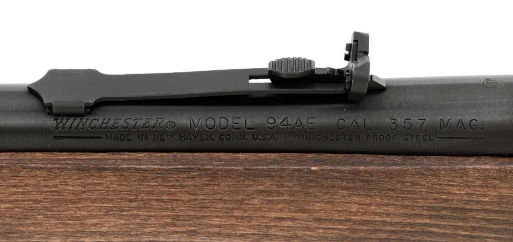 Winchester Model 94AE Ranger Compact Lever Action Carbine, #6481619, .357 Mag. cal., 16" barrel, with blue finish. Smooth satin oil finished walnut forend and straight grip stock, ends with a checkered plastic Winchester shotgun style buttplate, providing a 13.5" LOP. Carbine also features a factory dovetailed blade front sight, standard elevator rear sight with "U"-notched groove, cross bolt safety, saddle ring, factory drilled and tapped receiver. Factory markings are clear, with a sharp Winchester "WP" proof on top of the barrel. Includes factory cardboard box with matching end label, original hang tag, hammer extensions, cable lock, instruction manual, warranty card, and associated packaging materials. Carbine is in excellent condition, showing only a few light handling and storage marks. Action is crisp. Bore is mirror bright with excellent rifling. Est.: $800-$1,100. (Modern)