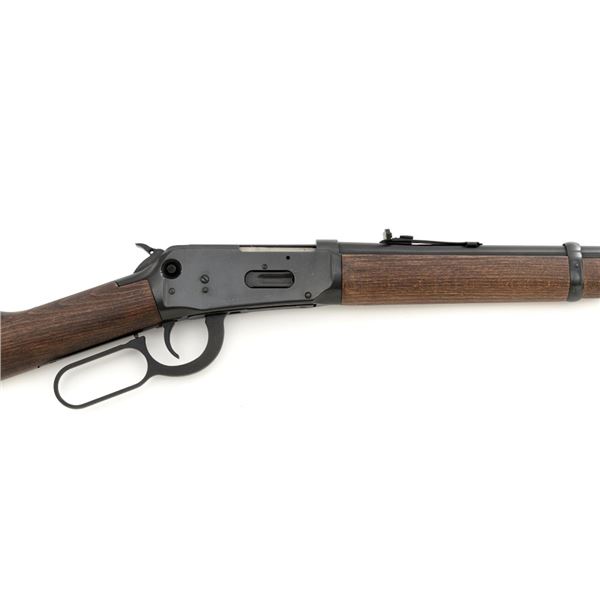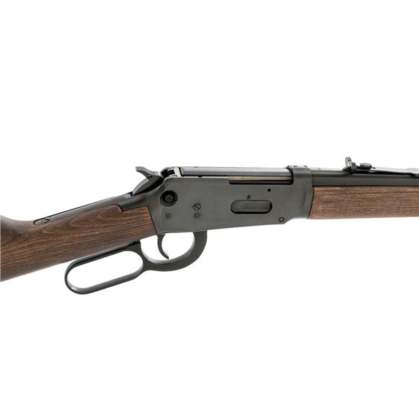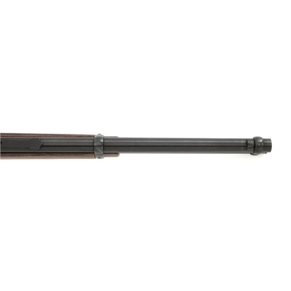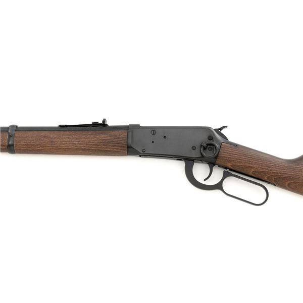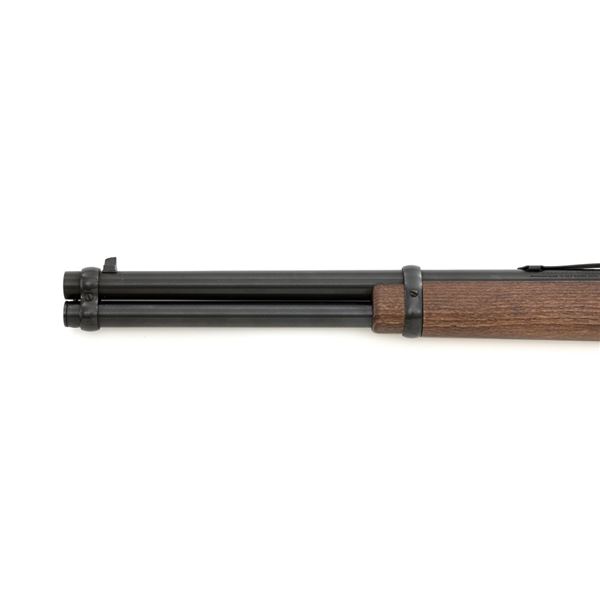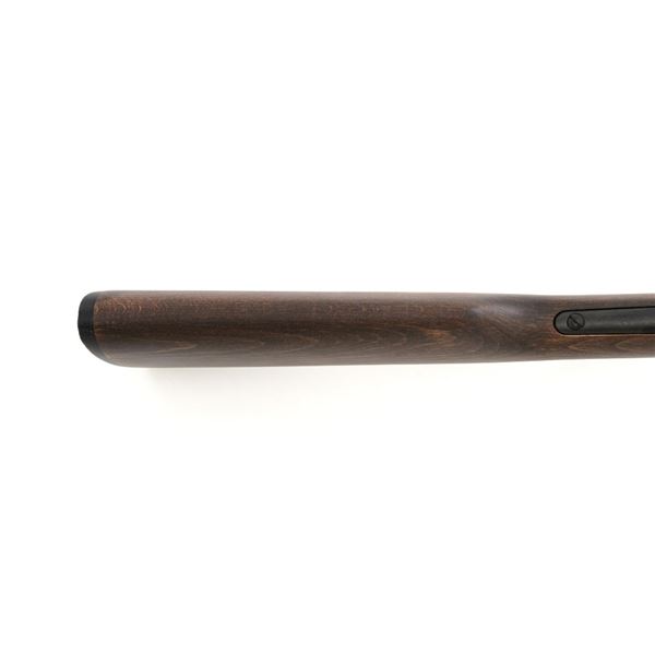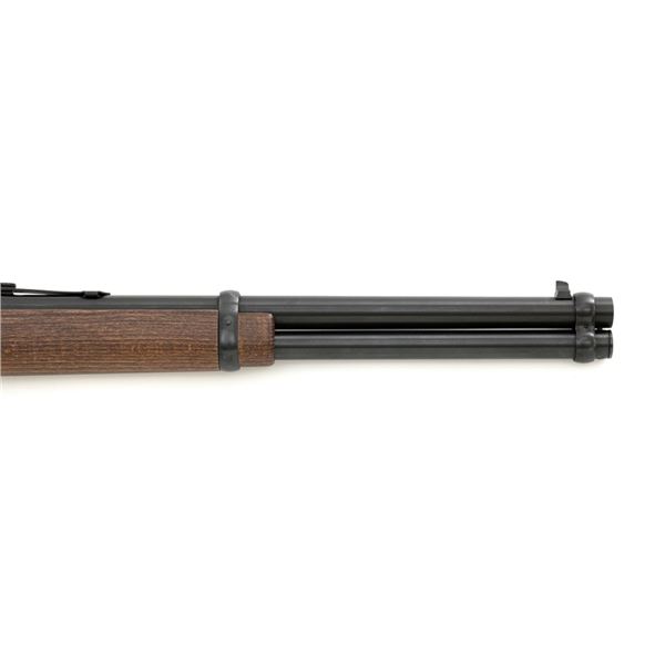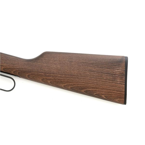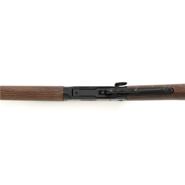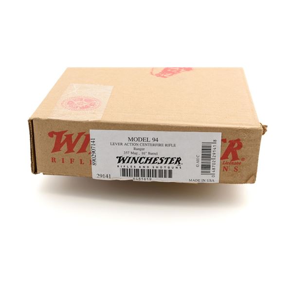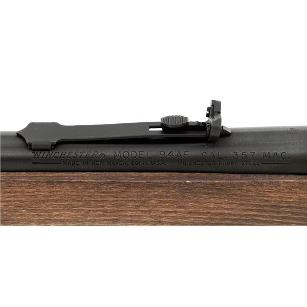 Winchester Model 94AE Ranger Compact Lever Action Carbine, #6481619, .357 Mag. cal., 16" barrel, with blue finish. Smooth satin oil finished walnut forend and straight grip stock, ends with a checkered plastic Winchester shotgun style buttplate, providing a 13.5" LOP. Carbine also features a factory dovetailed blade front sight, standard elevator rear sight with "U"-notched groove, cross bolt safety, saddle ring, factory drilled and tapped receiver. Factory markings are clear, with a sharp Winchester "WP" proof on top of the barrel. Includes factory cardboard box with matching end label, original hang tag, hammer extensions, cable lock, instruction manual, warranty card, and associated packaging materials. Carbine is in excellent condition, showing only a few light handling and storage marks. Action is crisp. Bore is mirror bright with excellent rifling. Est.: $800-$1,100. (Modern)