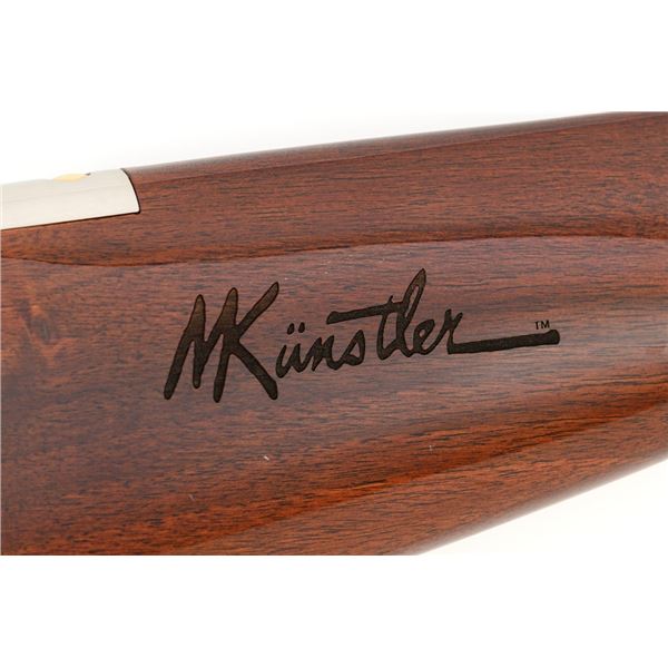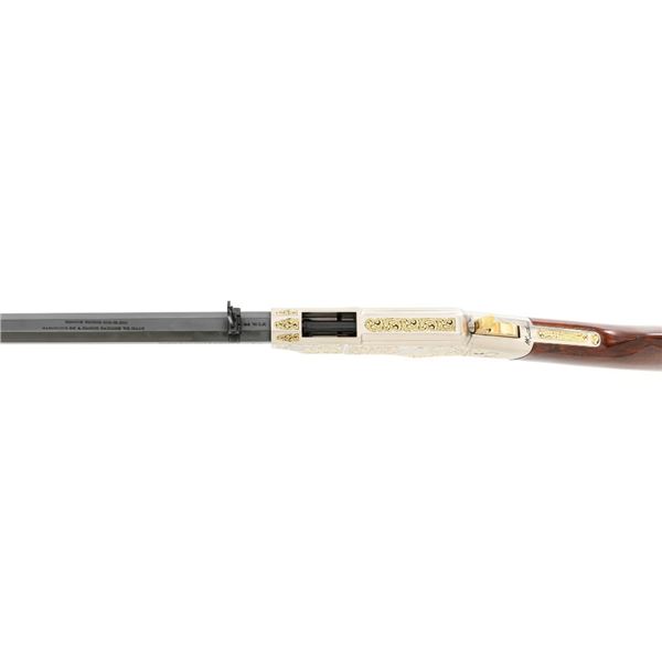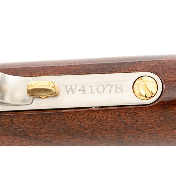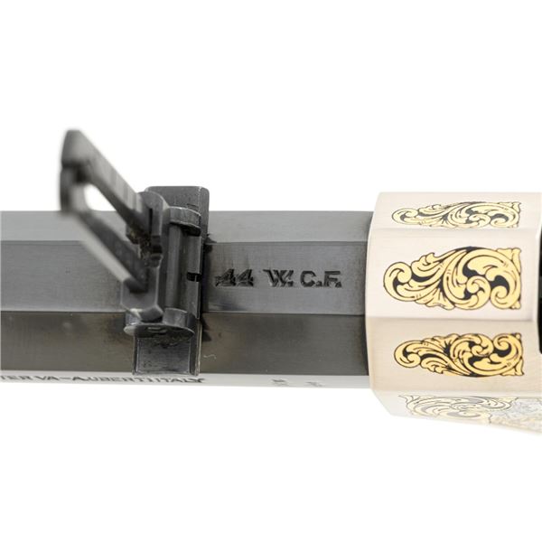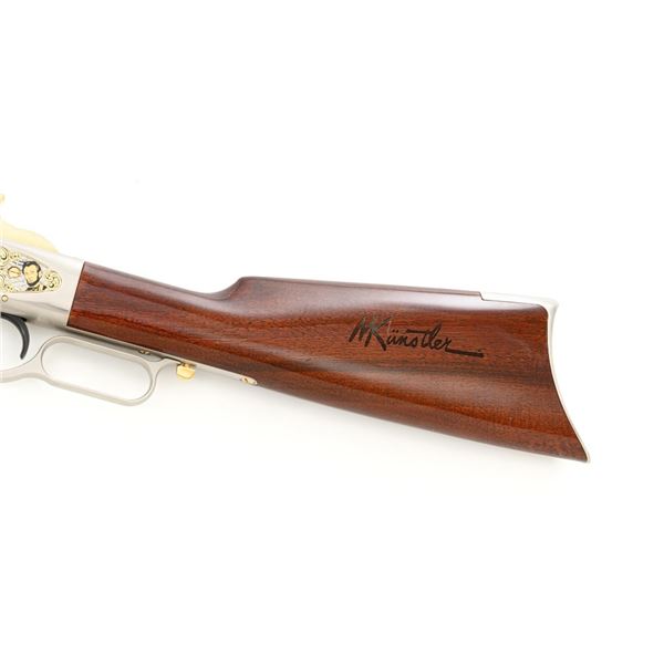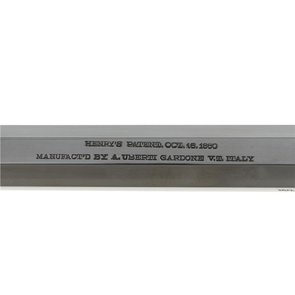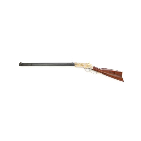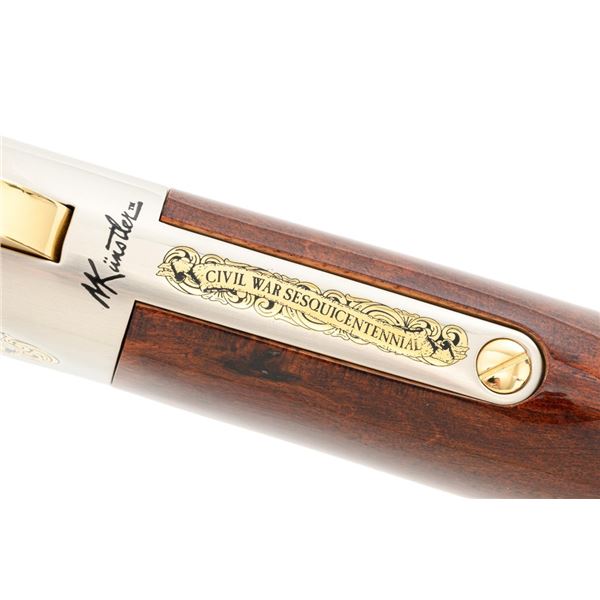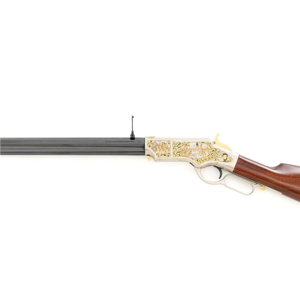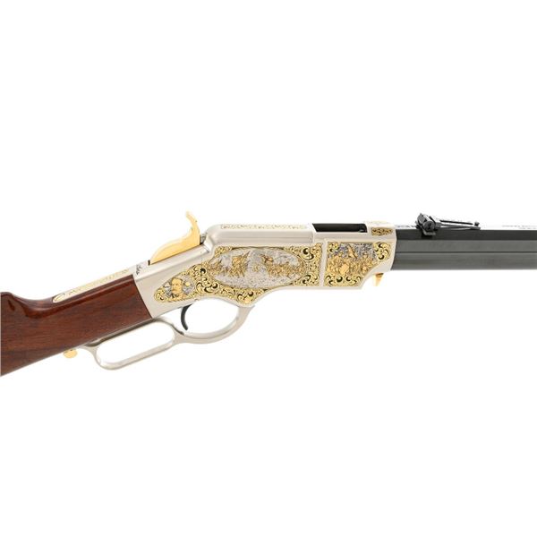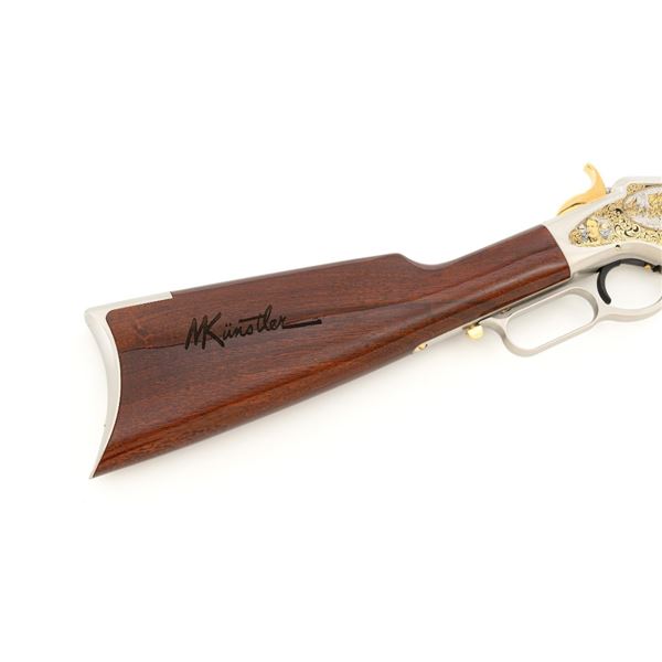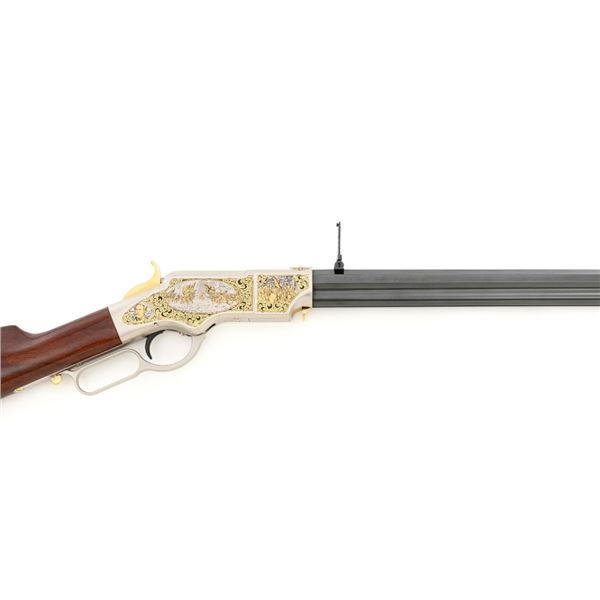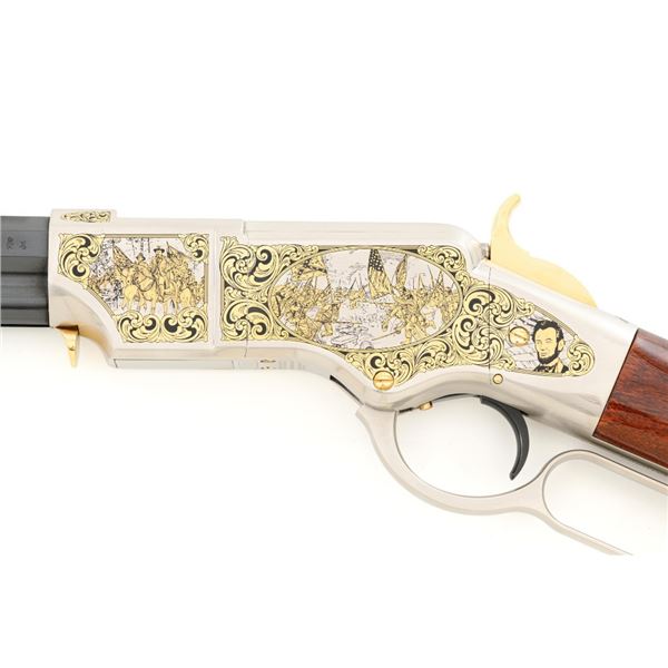 Uberti/America Remembers Henry Mort Kunstler Civil War Sesquicentennial Lever Action 1860 Henry Rifle, #W41078, .44 W.C.F. cal., 24" octagon barrel, blue finished barrel with coin finished receiver, Receiver displays attractive machine engraved Civil War scenes and 24K gold embellishment, with the artists laser cut signature at the rear of the receiver. Gloss finished smooth walnut buttstock with "M Kuntsler" carved signature on both sides. Sights include a blade front and ladder rear. Mfgd 2015. Rifle is in excellent overall condition, appearing unfired, with only light handling marks. Action functions smoothly. Bore is mirror bright with excellent rifling, appearing unfired. Distributed by America Remembers, the production was limited to only 300 rifles. Est.: $1,500-$2,000. (Modern)