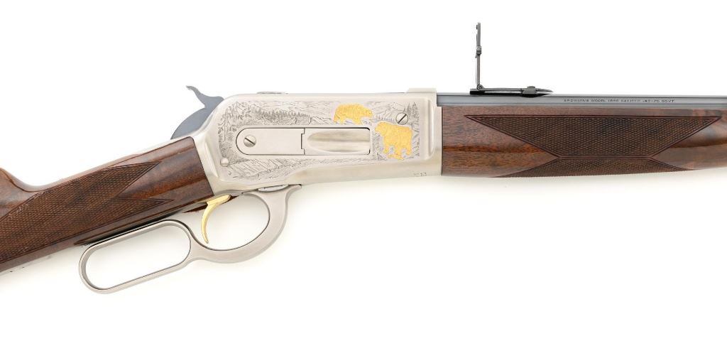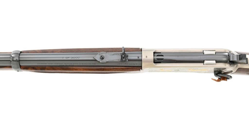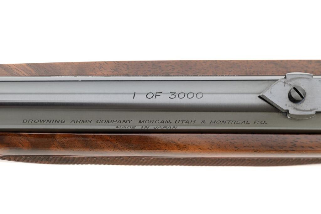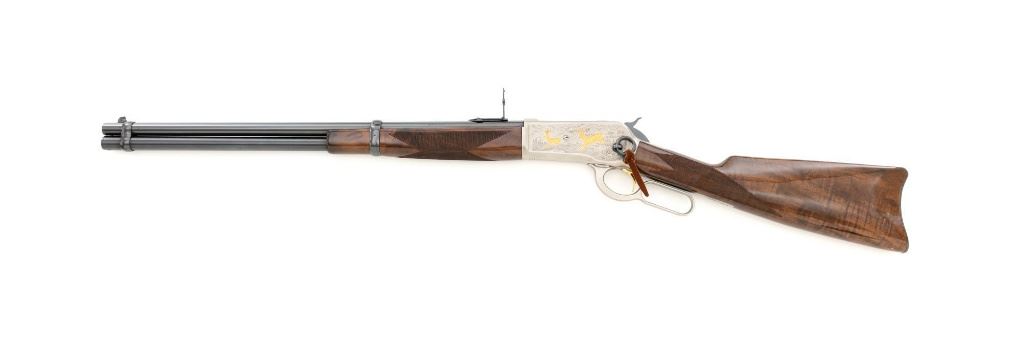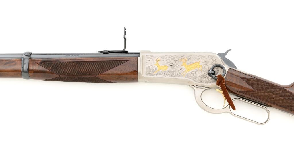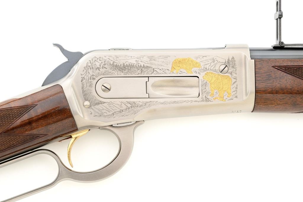 Browning Model 1886 Limited Edition High Grade Lever Action Saddle Ring Carbine, #02301NY6C7, .45-70 cal., 22" round barrel, blue finish on the barrel and magazine, and engraved French gray receiver. Receiver is finely engraved with games scenes on both sides. Left side depicts a couple of gold inlaid Mule Deer in the wild. Right side with gold inlaid Grizzly Bears. Lower left side is signed by the engraver "T. MOR". Gloss-finished, finely checkered, deluxe walnut straight grip stock and forend, ending with a smooth blue steel crescent buttplate, providing a 13.4" LOP. Carbine also features a pinned blade front sight, ladder rear sight, gold colored trigger, and blue steel saddle ring with leather thong. Factory markings are clear, with "MADE IN JAPAN" on the left side of the barrel, and "1 of 3000" on top of the barrel. Tang is marked "BROWNING MODEL 1886". Mfgd for only two years, 1992-93. Carbine is in excellent overall condition, retaining approx. 99%+ factory finish, with light handling marks only. Stock is in excellent condition with only minor storage marks. Action is crisp. Bore is mirror bright with excellent rifling, and appears to be unfired. Est.: $2,000-$3,000. (Modern)