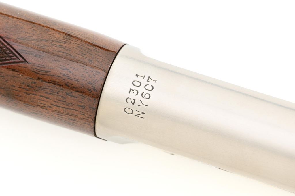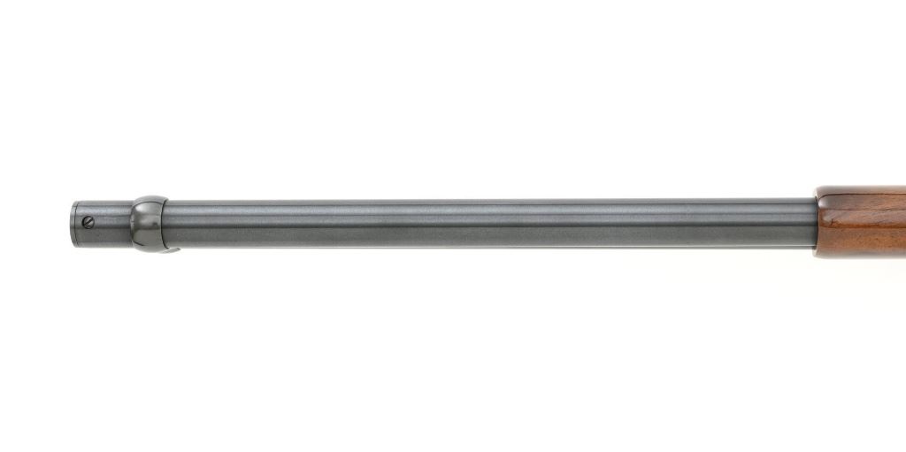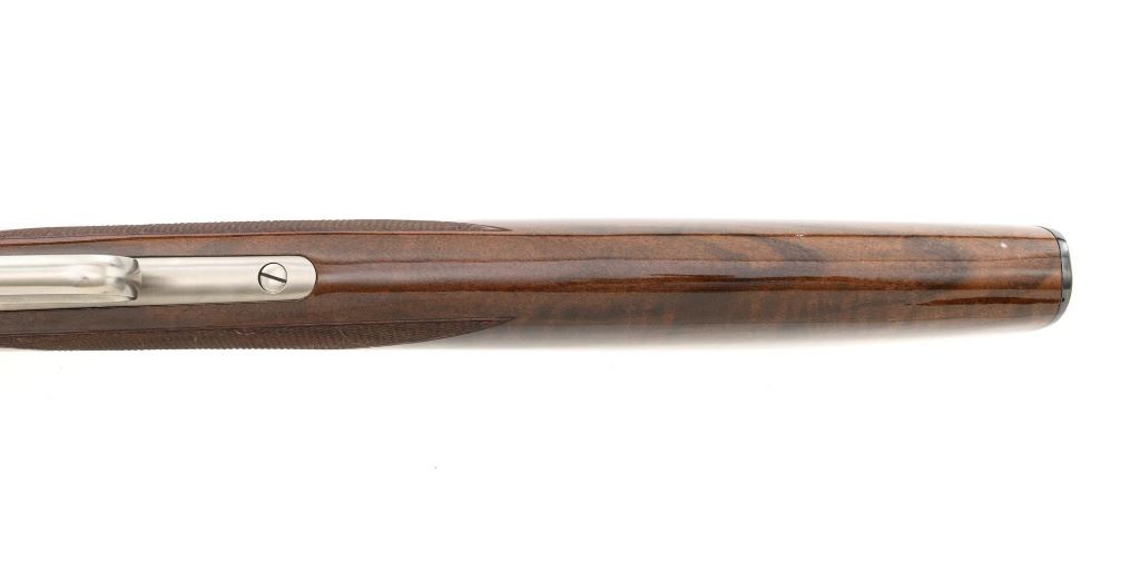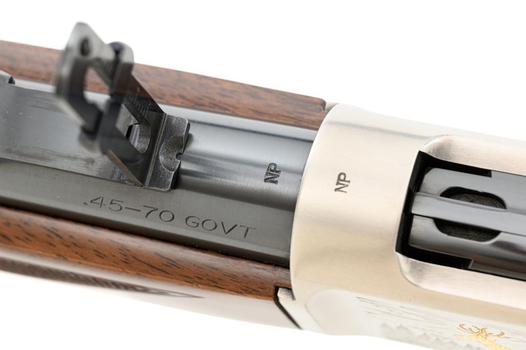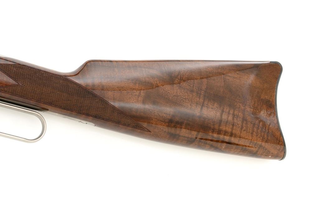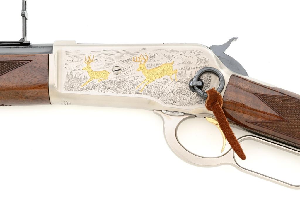 Browning Model 1886 Limited Edition High Grade Lever Action Saddle Ring Carbine, #02301NY6C7, .45-70 cal., 22" round barrel, blue finish on the barrel and magazine, and engraved French gray receiver. Receiver is finely engraved with games scenes on both sides. Left side depicts a couple of gold inlaid Mule Deer in the wild. Right side with gold inlaid Grizzly Bears. Lower left side is signed by the engraver "T. MOR". Gloss-finished, finely checkered, deluxe walnut straight grip stock and forend, ending with a smooth blue steel crescent buttplate, providing a 13.4" LOP. Carbine also features a pinned blade front sight, ladder rear sight, gold colored trigger, and blue steel saddle ring with leather thong. Factory markings are clear, with "MADE IN JAPAN" on the left side of the barrel, and "1 of 3000" on top of the barrel. Tang is marked "BROWNING MODEL 1886". Mfgd for only two years, 1992-93. Carbine is in excellent overall condition, retaining approx. 99%+ factory finish, with light handling marks only. Stock is in excellent condition with only minor storage marks. Action is crisp. Bore is mirror bright with excellent rifling, and appears to be unfired. Est.: $2,000-$3,000. (Modern)