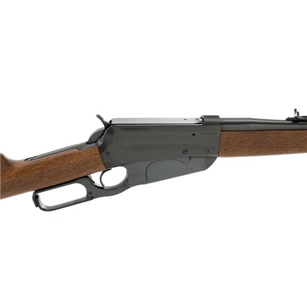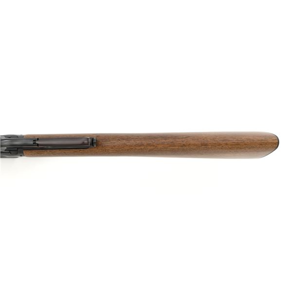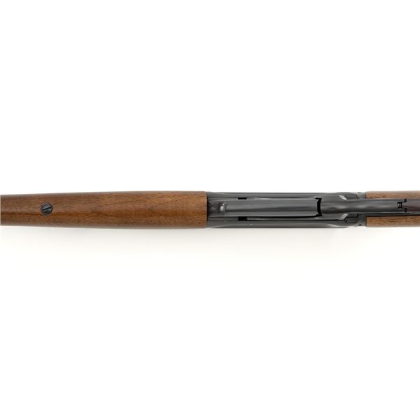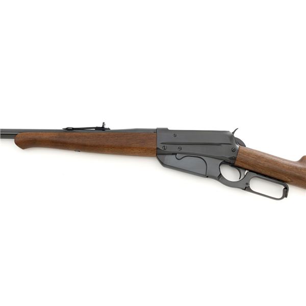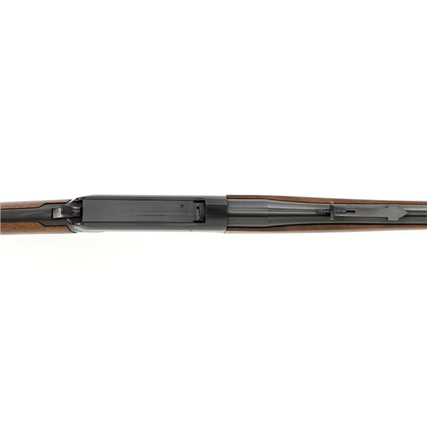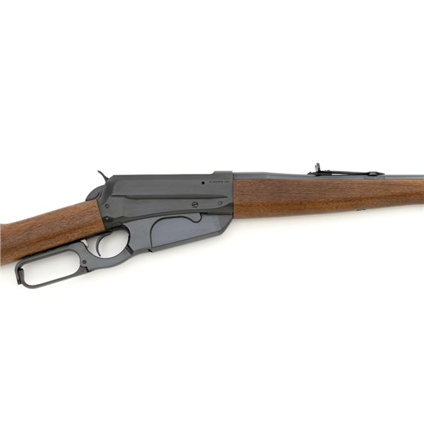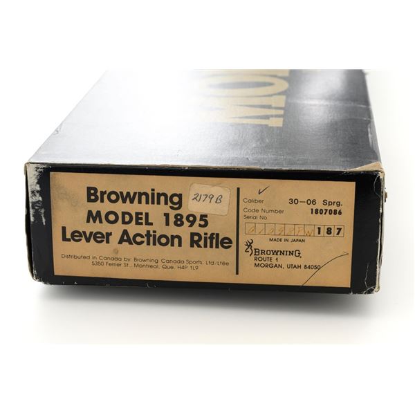 Browning Model 1895 Limited Edition Grade I Lever Action Rifle, #01098PW187, .30-06 cal., 24" barrel, with blue finish. Smooth walnut straight grip stock and Schnabel forend; buttstock ends with a matte blue steel shotgun buttplate, providing a 13.4" LOP. Sights include a brass tipped blade front and buckhorn rear. Marked "MADE IN JAPAN" on left side of the barrel. Includes factory cardboard box with matching end label, Browning brochure, and associated packaging materials. Rifle is in excellent overall condition, retaining approx. 99% factory finish, with intermittent light handling to the wood and metal. Action is crisp. Bore is mirror bright with excellent rifling, showing little use. Mfgd in only 1984, production on the Grade I was limited to 6,000 rifles in .30-06, with another 2,000 produced in .30-40 Krag. These rifles are long out of production and desirable in this high condition. Est.: $1,000-$1,500. (Modern)