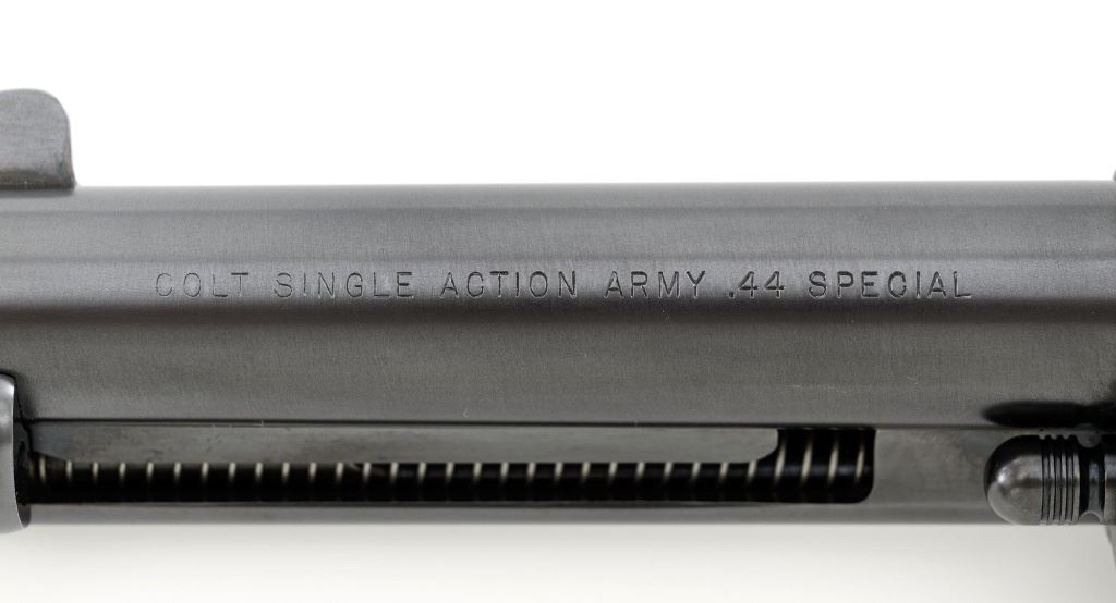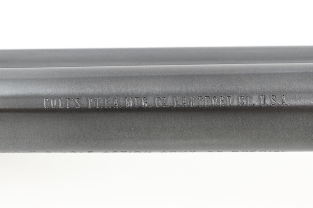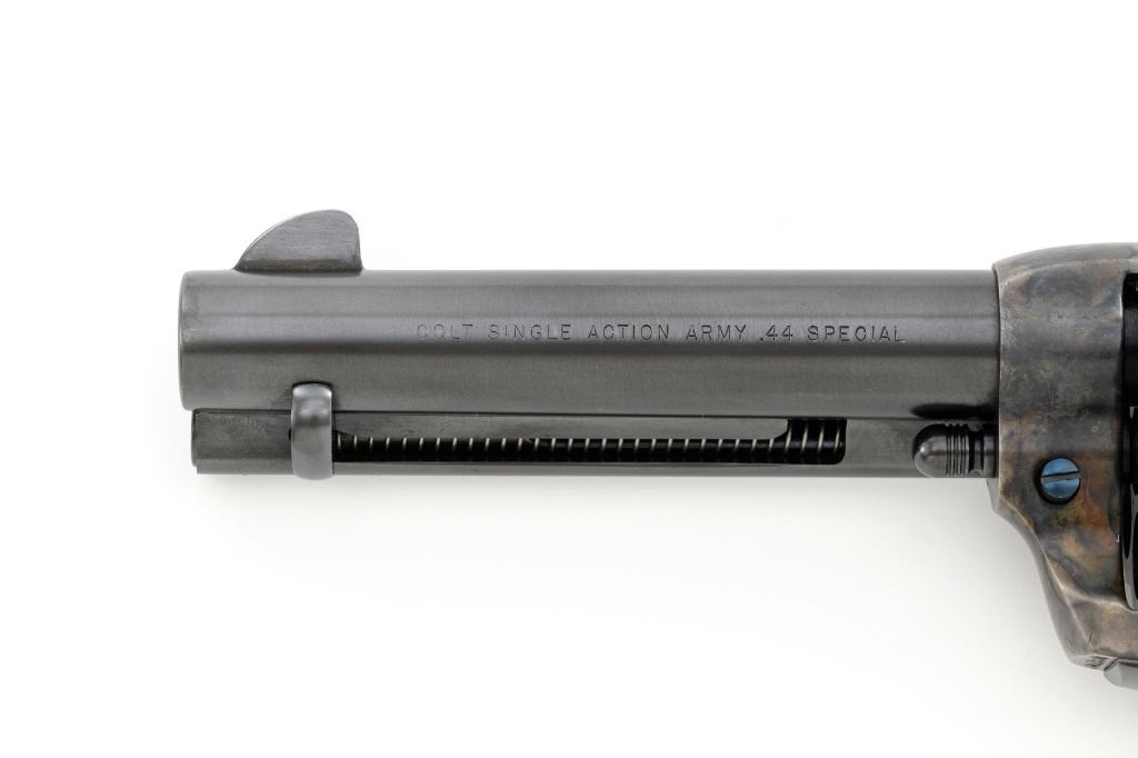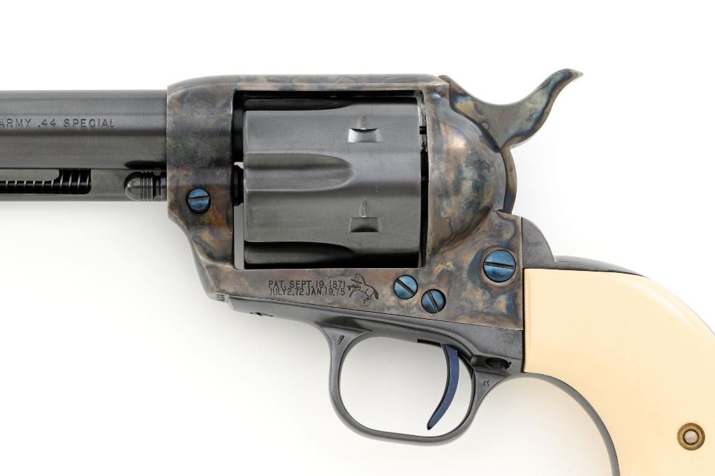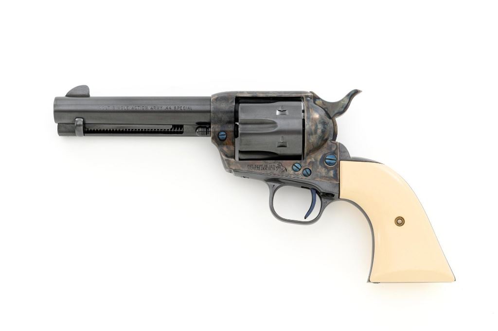 Custom Colt Single Action Army 3rd Generation Revolver, #SA62530, .44 Special cal., 4.75" replacement barrel, blue and color case hardened finish, smooth ivory micarta two-piece Hogue grips, blade front and fixed square-notch rear sights. This revolver features a single line Hartford barrel address and is unmarked inside the loading gate. Mfgd 1982. Revolver is in excellent overall condition as refinished, retaining approx. 98%-99% finish with bright fire blued screws, and showing only light handling marks. Frame and hammer display vivid color case hardening. Replacement grips are excellent and fit well. Action is crisp with good timing. Bright bore rates near excellent with well-defined rifling. The consignor indicates that the revolver was sent to Peacemaker Specialists in April, 1993 for installation of the replacement barrel and custom refinishing in the original 1880s Colt style. Est.: $2,000-$3,000. (Modern)