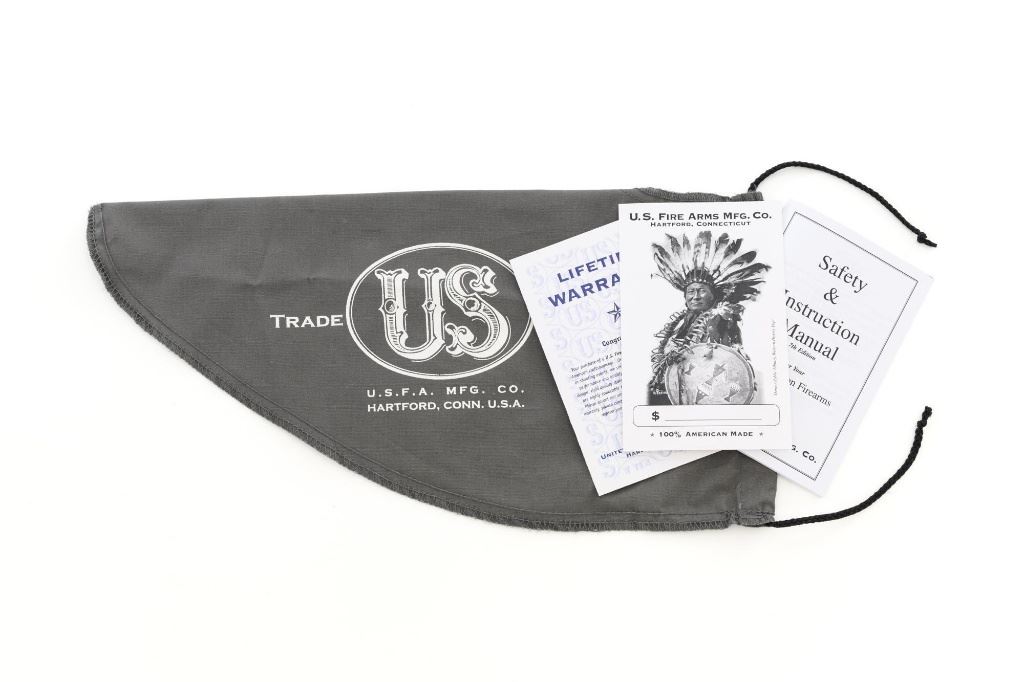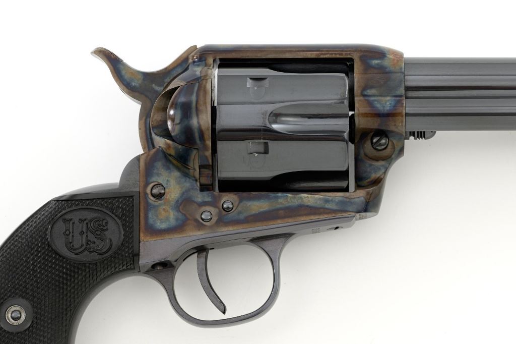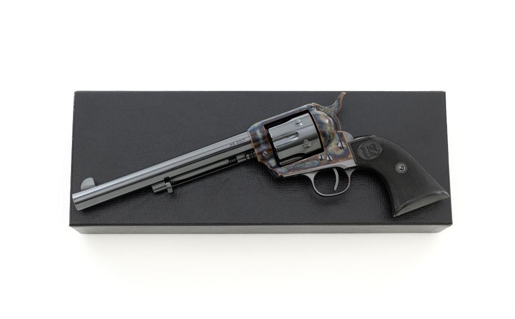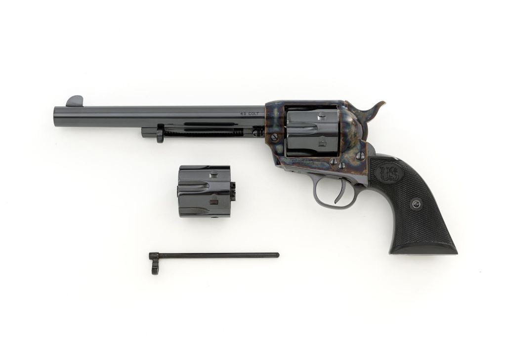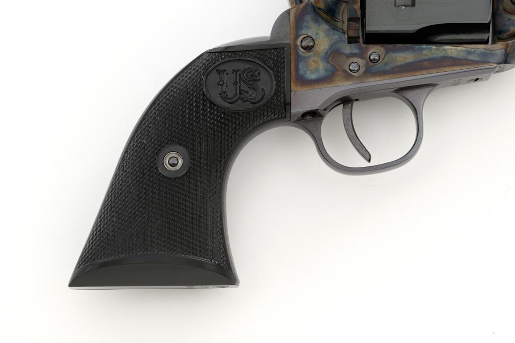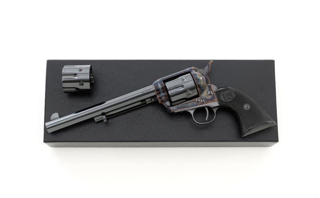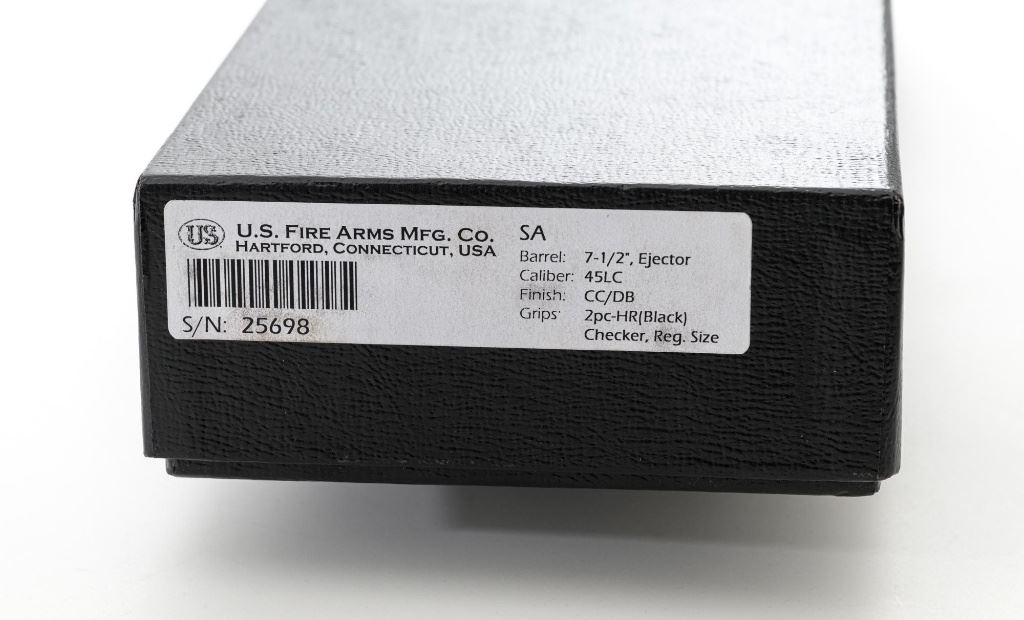 United States Fire Arms Manufacturing Co. Single Action Army Revolver, with Extra Cylinder, #25698, .45 Colt cal., 7.5" barrel, blue and color case hardened finish, checkered hard rubber two-piece "US" monogram grips, blade front and fixed square notch rear sights, with "Bullseye" ejector rod. Marked "757" inside the loading gate. Includes the factory two-piece box with matching end label, instruction manual, original ejector rod; extra cylinder chambered in .45 ACP cal., protective bag and associated packaging materials. Revolver is in excellent overall condition, showing little evidence of use, and retaining approx. 99%+ factory "Dome Blue" finish on the barrel, cylinder and straps. Frame and hammer display vivid "Old Armory Bone" color case hardened finish. Factory lettering is crisp. Grips are excellent with sharp checkering detail, showing little use. Action is crisp with excellent timing. Bore is mirror bright with excellent rifling. Prior to closing their doors in 2012, U.S.F.A. produced some of the finest reproduction SAA revolvers on the market. Hard to find in this high condition and desirable with the extra cylinder. Est.: $1,500-$2,500. (Modern)