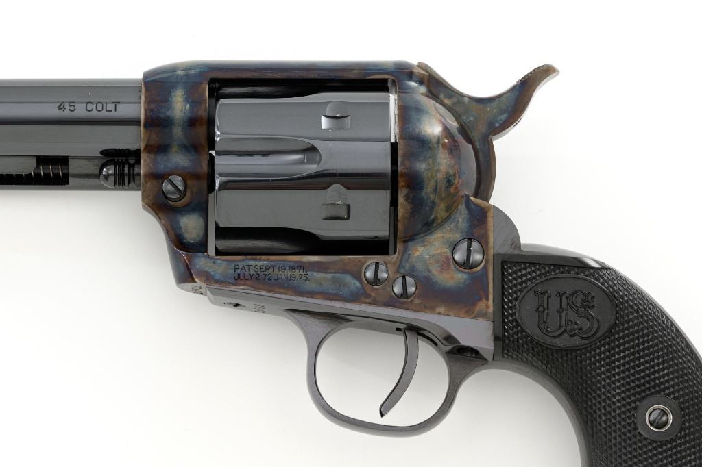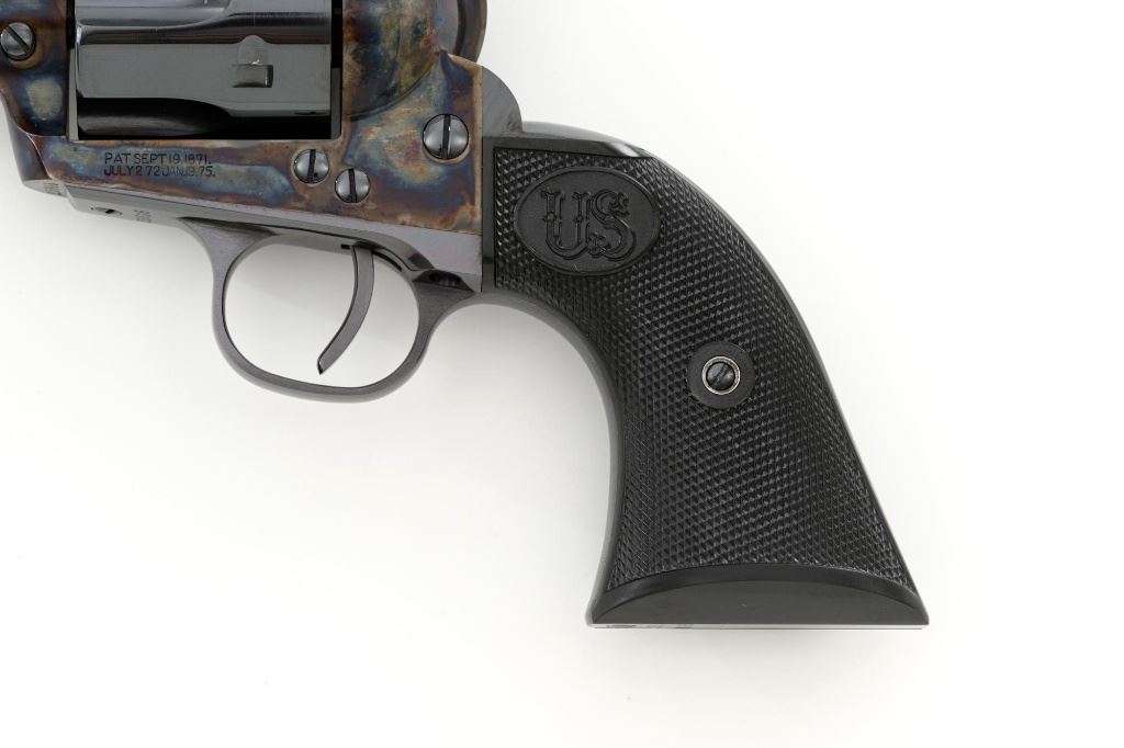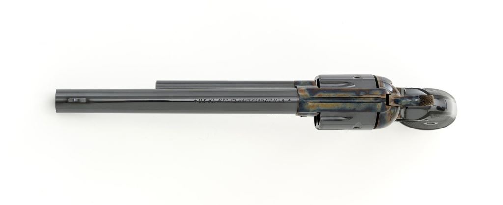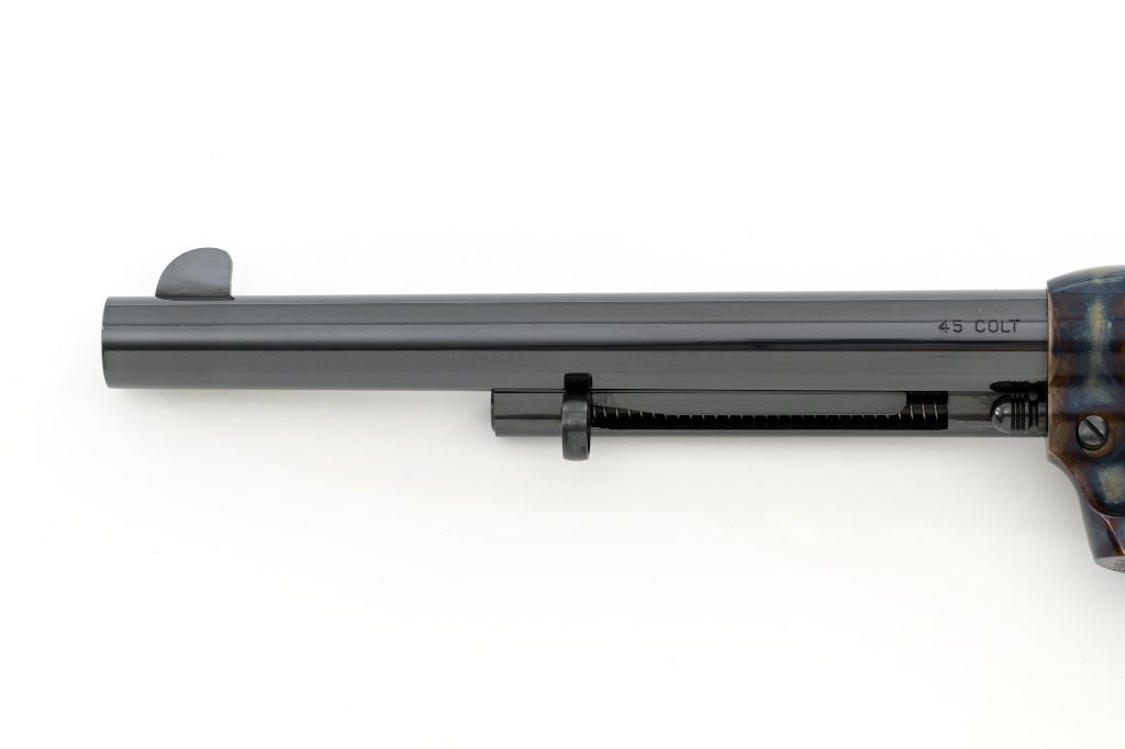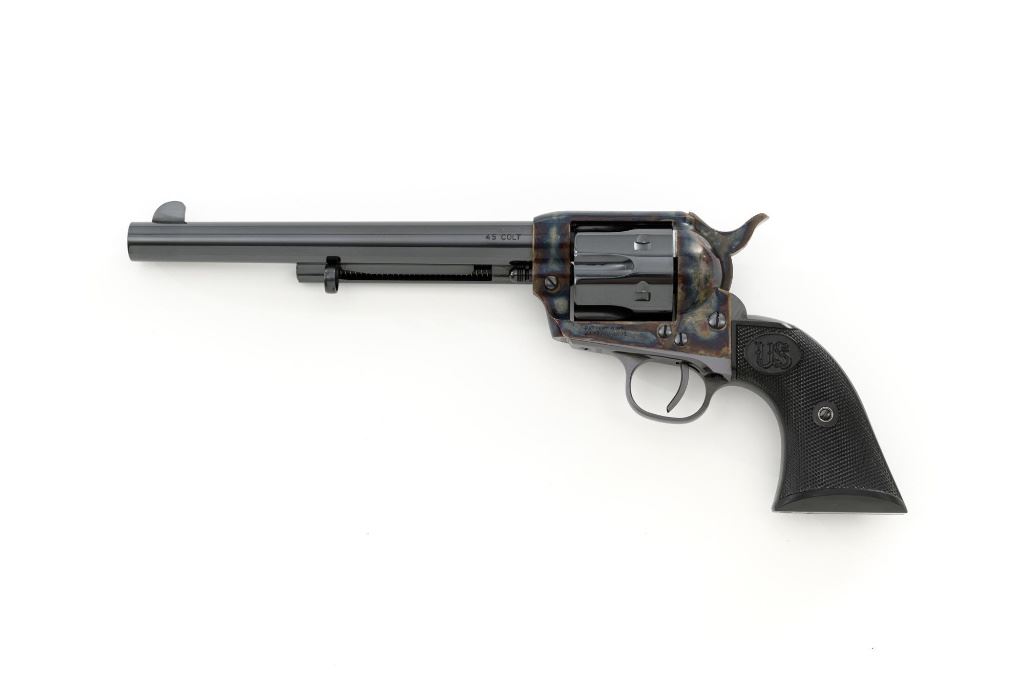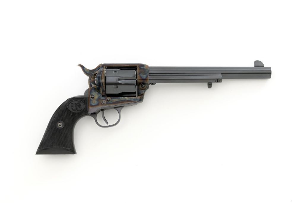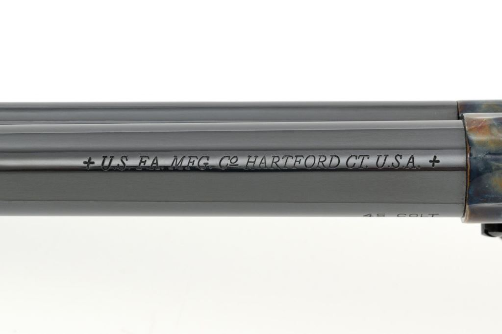 United States Fire Arms Manufacturing Co. Single Action Army Revolver, with Extra Cylinder, #25698, .45 Colt cal., 7.5" barrel, blue and color case hardened finish, checkered hard rubber two-piece "US" monogram grips, blade front and fixed square notch rear sights, with "Bullseye" ejector rod. Marked "757" inside the loading gate. Includes the factory two-piece box with matching end label, instruction manual, original ejector rod; extra cylinder chambered in .45 ACP cal., protective bag and associated packaging materials. Revolver is in excellent overall condition, showing little evidence of use, and retaining approx. 99%+ factory "Dome Blue" finish on the barrel, cylinder and straps. Frame and hammer display vivid "Old Armory Bone" color case hardened finish. Factory lettering is crisp. Grips are excellent with sharp checkering detail, showing little use. Action is crisp with excellent timing. Bore is mirror bright with excellent rifling. Prior to closing their doors in 2012, U.S.F.A. produced some of the finest reproduction SAA revolvers on the market. Hard to find in this high condition and desirable with the extra cylinder. Est.: $1,500-$2,500. (Modern)