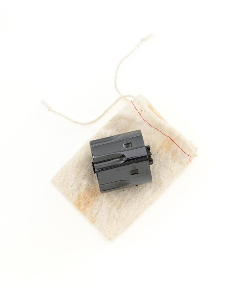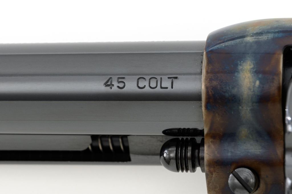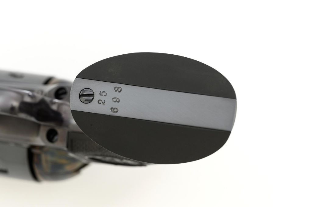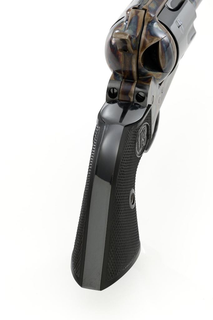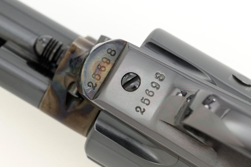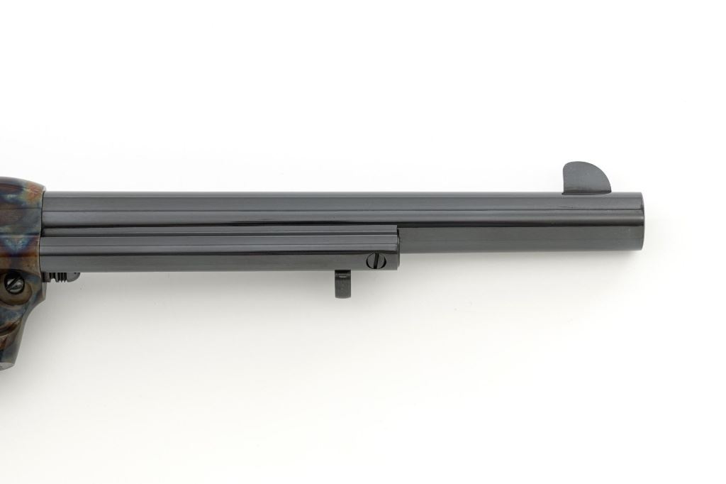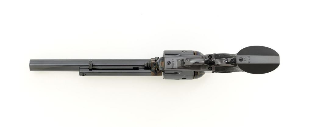 United States Fire Arms Manufacturing Co. Single Action Army Revolver, with Extra Cylinder, #25698, .45 Colt cal., 7.5" barrel, blue and color case hardened finish, checkered hard rubber two-piece "US" monogram grips, blade front and fixed square notch rear sights, with "Bullseye" ejector rod. Marked "757" inside the loading gate. Includes the factory two-piece box with matching end label, instruction manual, original ejector rod; extra cylinder chambered in .45 ACP cal., protective bag and associated packaging materials. Revolver is in excellent overall condition, showing little evidence of use, and retaining approx. 99%+ factory "Dome Blue" finish on the barrel, cylinder and straps. Frame and hammer display vivid "Old Armory Bone" color case hardened finish. Factory lettering is crisp. Grips are excellent with sharp checkering detail, showing little use. Action is crisp with excellent timing. Bore is mirror bright with excellent rifling. Prior to closing their doors in 2012, U.S.F.A. produced some of the finest reproduction SAA revolvers on the market. Hard to find in this high condition and desirable with the extra cylinder. Est.: $1,500-$2,500. (Modern)