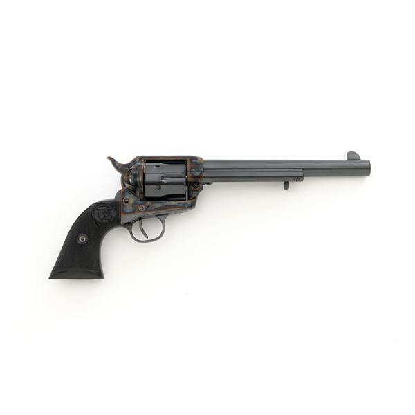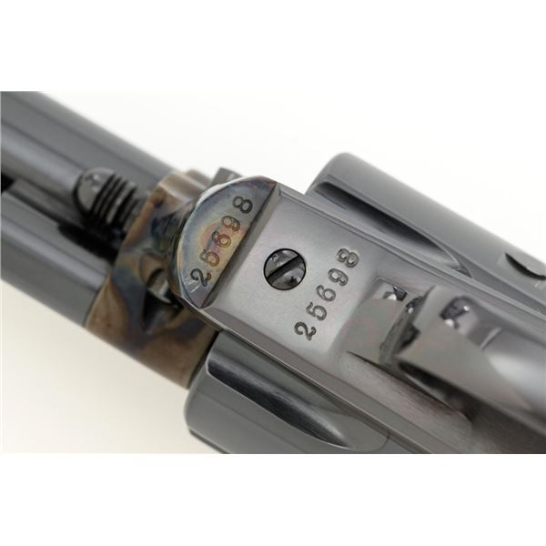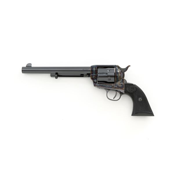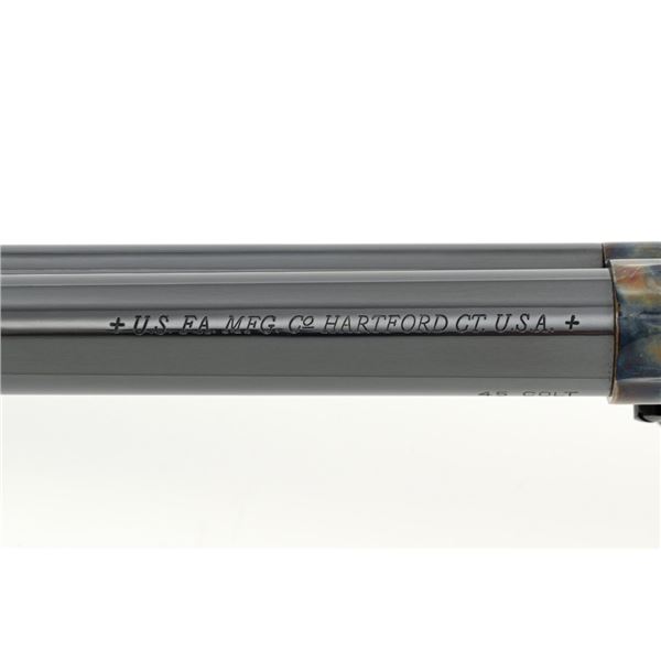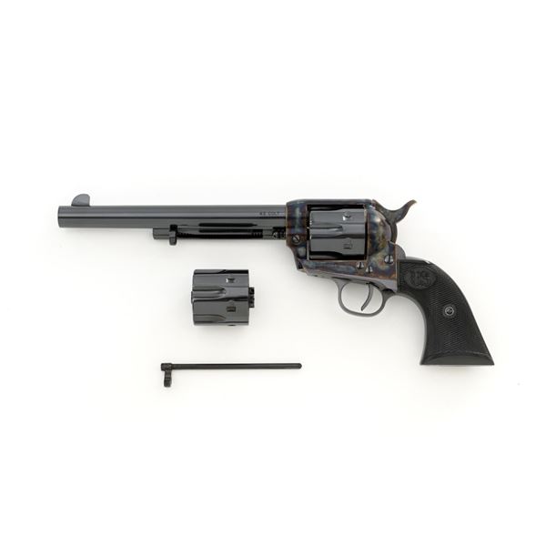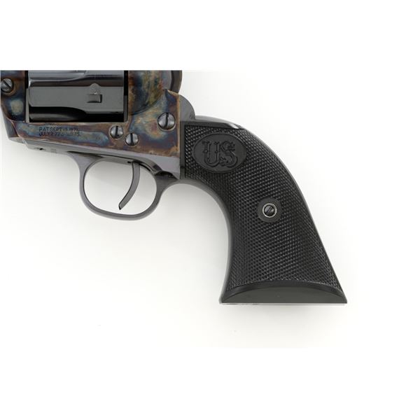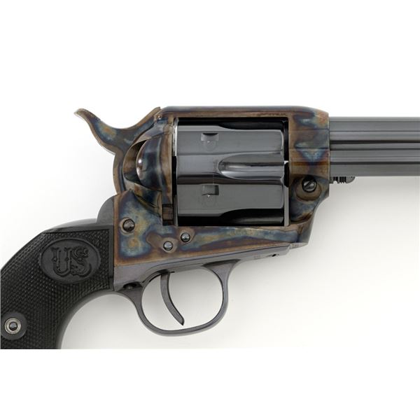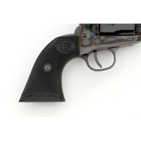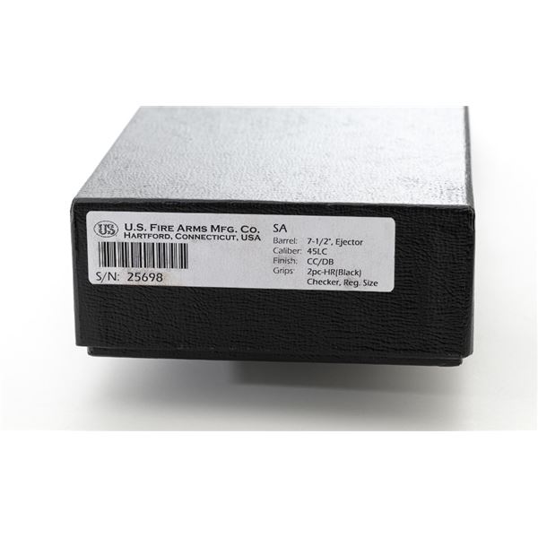 United States Fire Arms Manufacturing Co. Single Action Army Revolver, with Extra Cylinder, #25698, .45 Colt cal., 7.5" barrel, blue and color case hardened finish, checkered hard rubber two-piece "US" monogram grips, blade front and fixed square notch rear sights, with "Bullseye" ejector rod. Marked "757" inside the loading gate. Includes the factory two-piece box with matching end label, instruction manual, original ejector rod; extra cylinder chambered in .45 ACP cal., protective bag and associated packaging materials. Revolver is in excellent overall condition, showing little evidence of use, and retaining approx. 99%+ factory "Dome Blue" finish on the barrel, cylinder and straps. Frame and hammer display vivid "Old Armory Bone" color case hardened finish. Factory lettering is crisp. Grips are excellent with sharp checkering detail, showing little use. Action is crisp with excellent timing. Bore is mirror bright with excellent rifling. Prior to closing their doors in 2012, U.S.F.A. produced some of the finest reproduction SAA revolvers on the market. Hard to find in this high condition and desirable with the extra cylinder. Est.: $1,500-$2,500. (Modern)