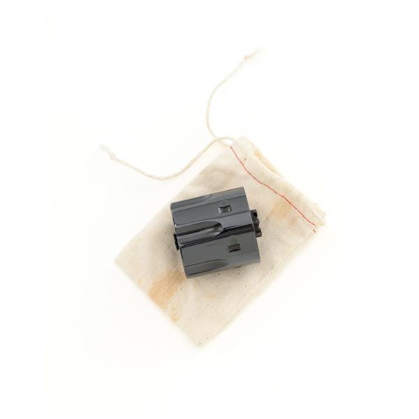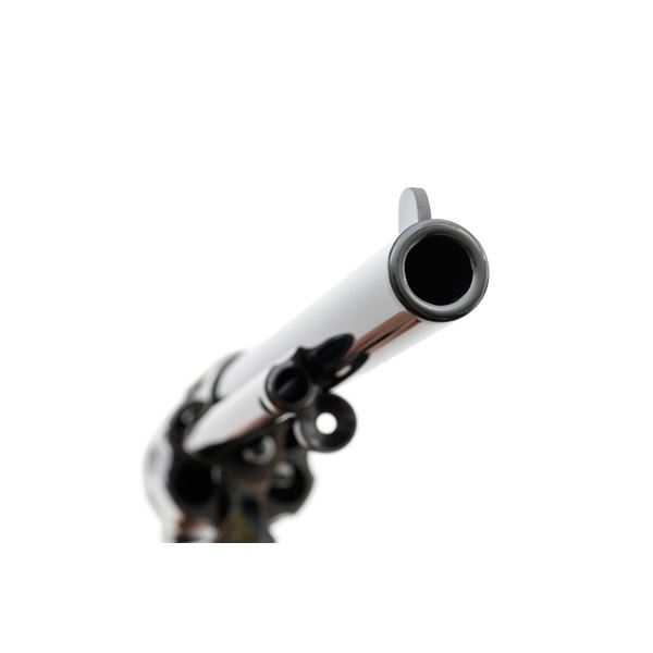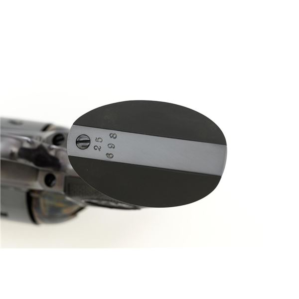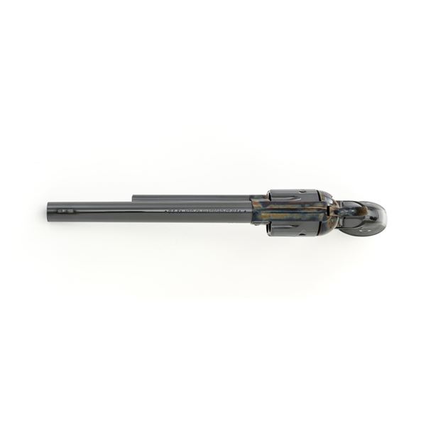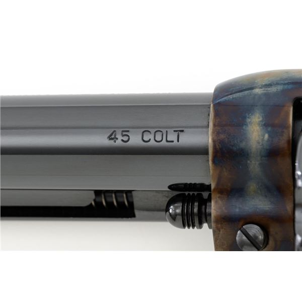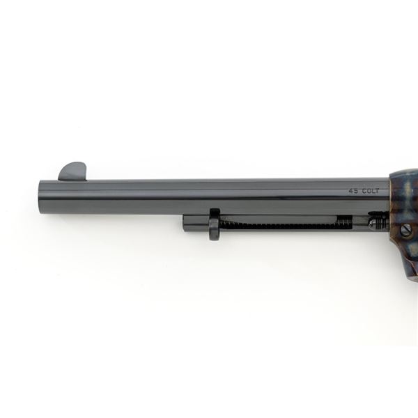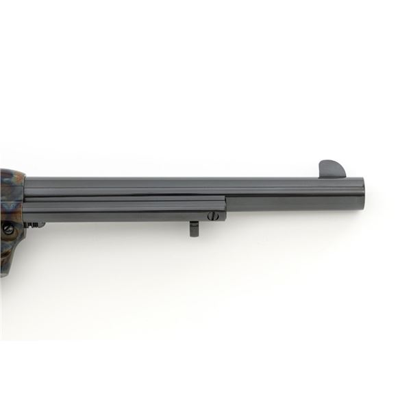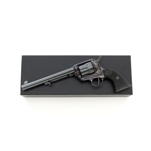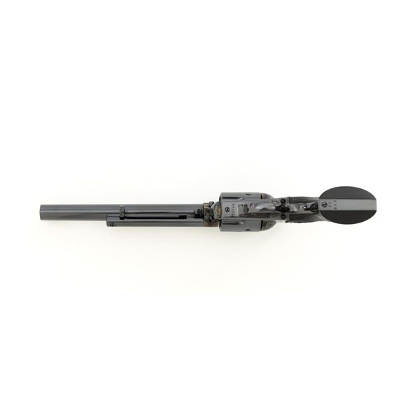 United States Fire Arms Manufacturing Co. Single Action Army Revolver, with Extra Cylinder, #25698, .45 Colt cal., 7.5" barrel, blue and color case hardened finish, checkered hard rubber two-piece "US" monogram grips, blade front and fixed square notch rear sights, with "Bullseye" ejector rod. Marked "757" inside the loading gate. Includes the factory two-piece box with matching end label, instruction manual, original ejector rod; extra cylinder chambered in .45 ACP cal., protective bag and associated packaging materials. Revolver is in excellent overall condition, showing little evidence of use, and retaining approx. 99%+ factory "Dome Blue" finish on the barrel, cylinder and straps. Frame and hammer display vivid "Old Armory Bone" color case hardened finish. Factory lettering is crisp. Grips are excellent with sharp checkering detail, showing little use. Action is crisp with excellent timing. Bore is mirror bright with excellent rifling. Prior to closing their doors in 2012, U.S.F.A. produced some of the finest reproduction SAA revolvers on the market. Hard to find in this high condition and desirable with the extra cylinder. Est.: $1,500-$2,500. (Modern)