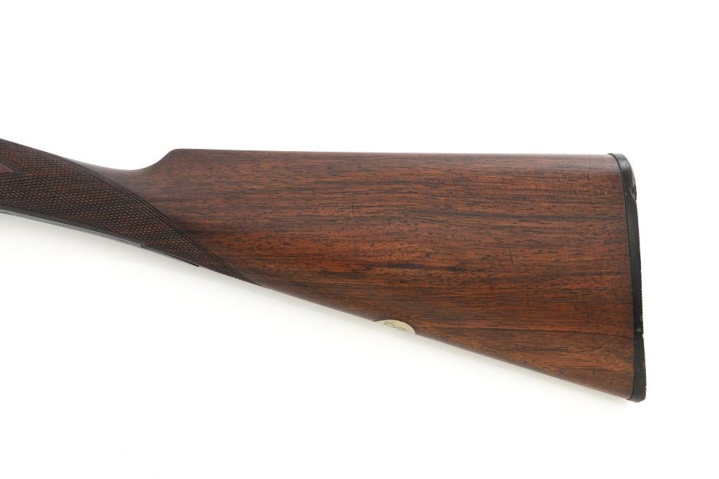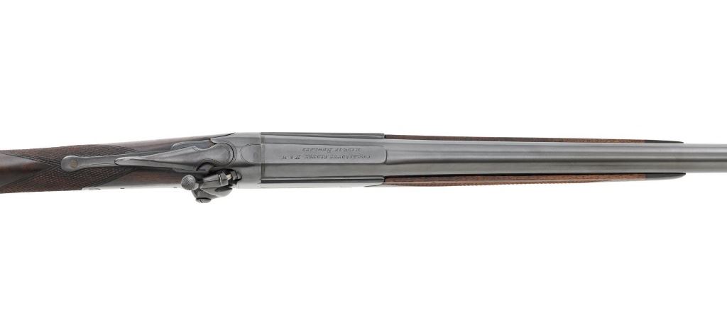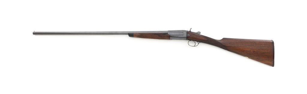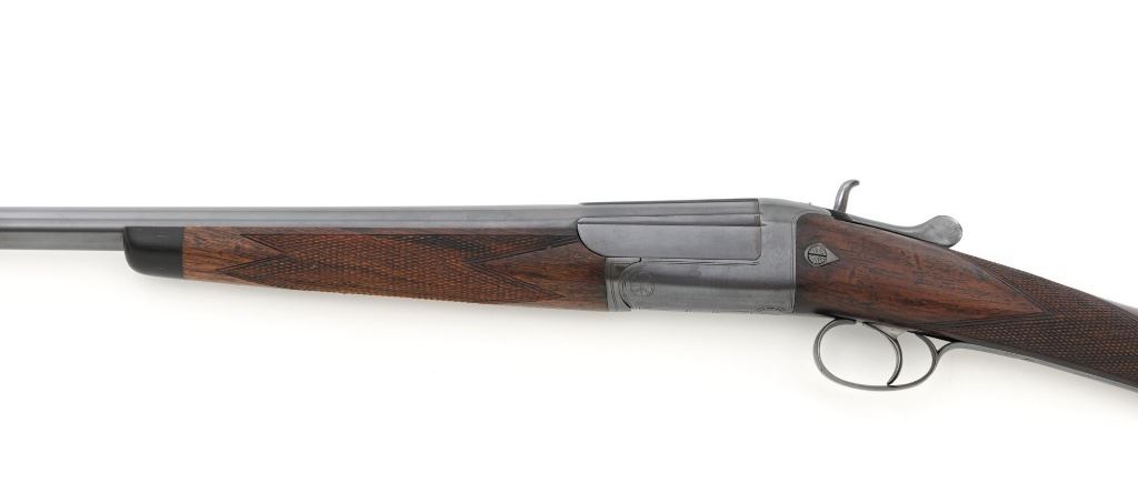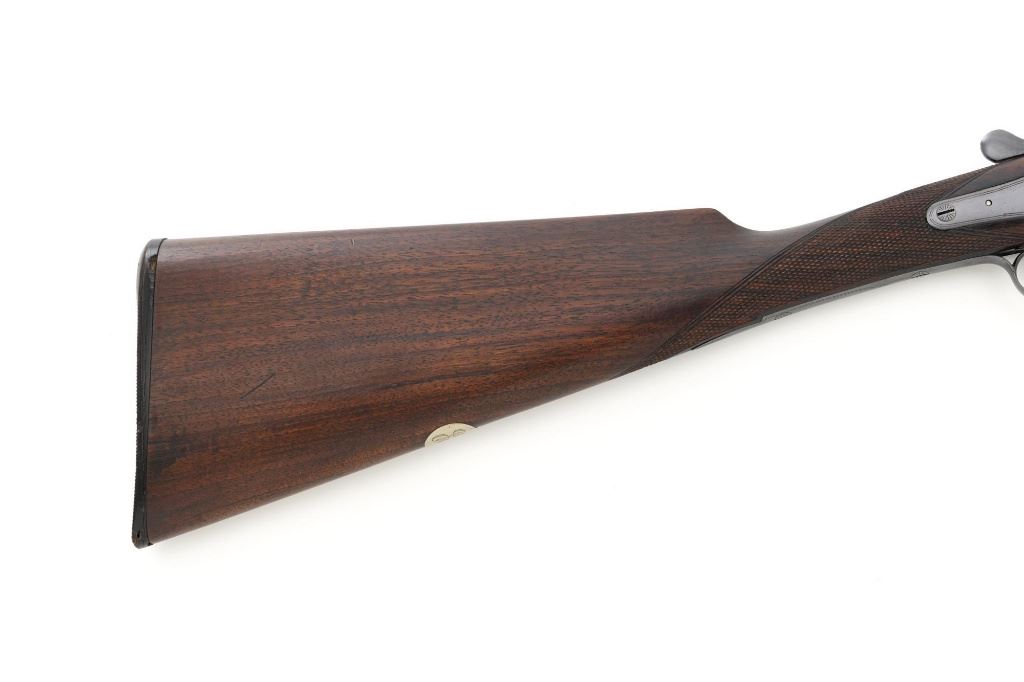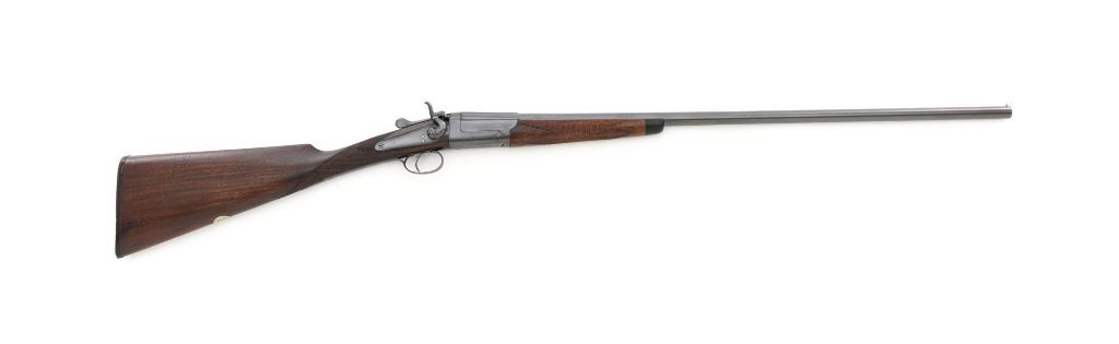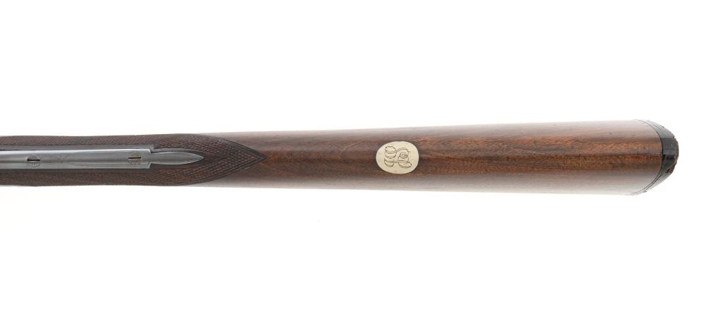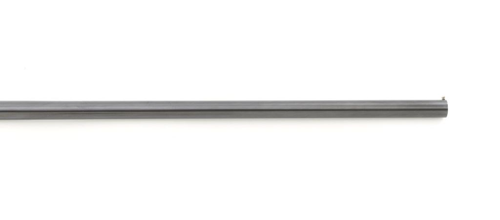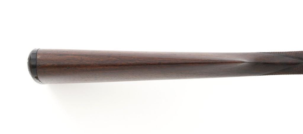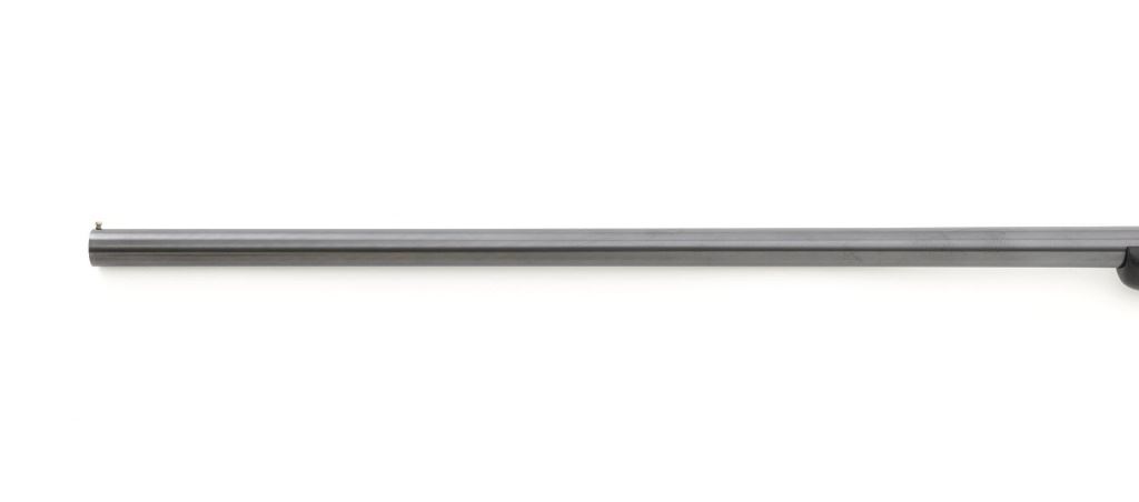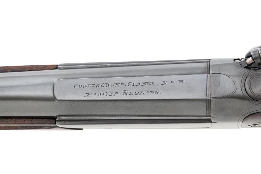British Cowles & Dunn 28 Gauge Single Barrel Shotgun, #90774, 28 ga., 27" barrel, 2.5" chamber, blued finish, rear of barrel engraved "Cowels & Dunn, Sydney N.S.W., Made in England", receiver has Birmingham proof marks, "28c" in diamond, "nitro proof 3/8", and marked "choke", all visible numbers matching, outside rebounding hammer, island lock, extractor, silver bead front sight, straight grip checkered walnut stock with horn buttplate, 14.25" LOP (14" to original wood), checkered walnut forend with black horn end cap, and silver oval roundel with engraved letters "JS" on lower edge of buttstock. No decorative engraving, just thin border lines on the receiver and lock. Condition is very good, retaining approx. 98% of a proper refinished bluing, showing only minor wear to the right side of the receiver at the hinge pin and thinning of the bluing on the lock. Action is tight and functions properly; bore is mostly bright, with light pitting around the forcing cone, and there is a small area of roughness and pitting about 7" from the muzzle. Stock shows a light oil refinish, still showing minor dings, light depressions, and scratches; checkering appears to have been freshened up, with sharp diamonds. Horn buttplate shows damage and small losses from insects. All the screws are properly indexed with clean slots. A neat little shotgun! Est.: $900-$1,200. (C&R)