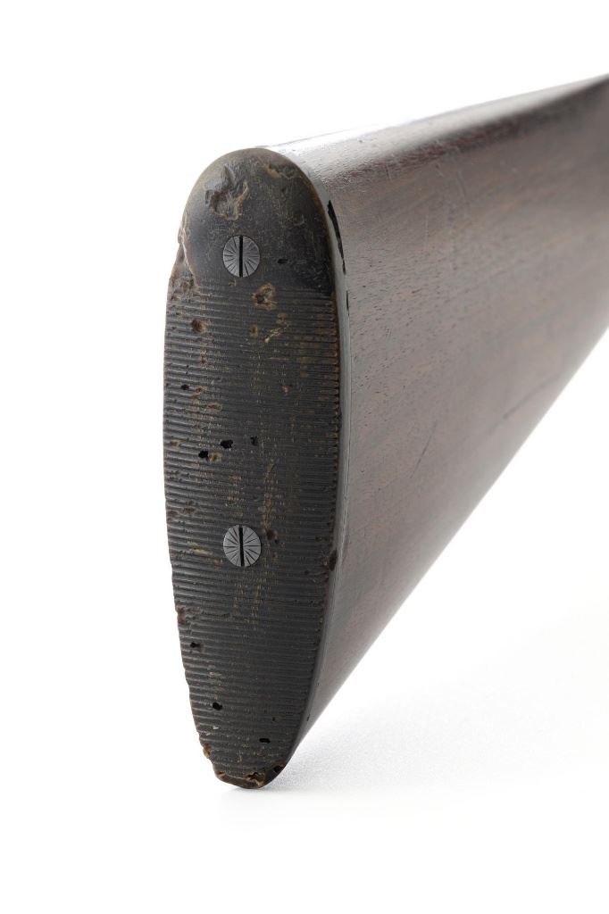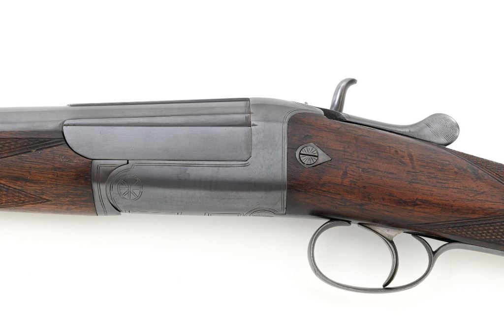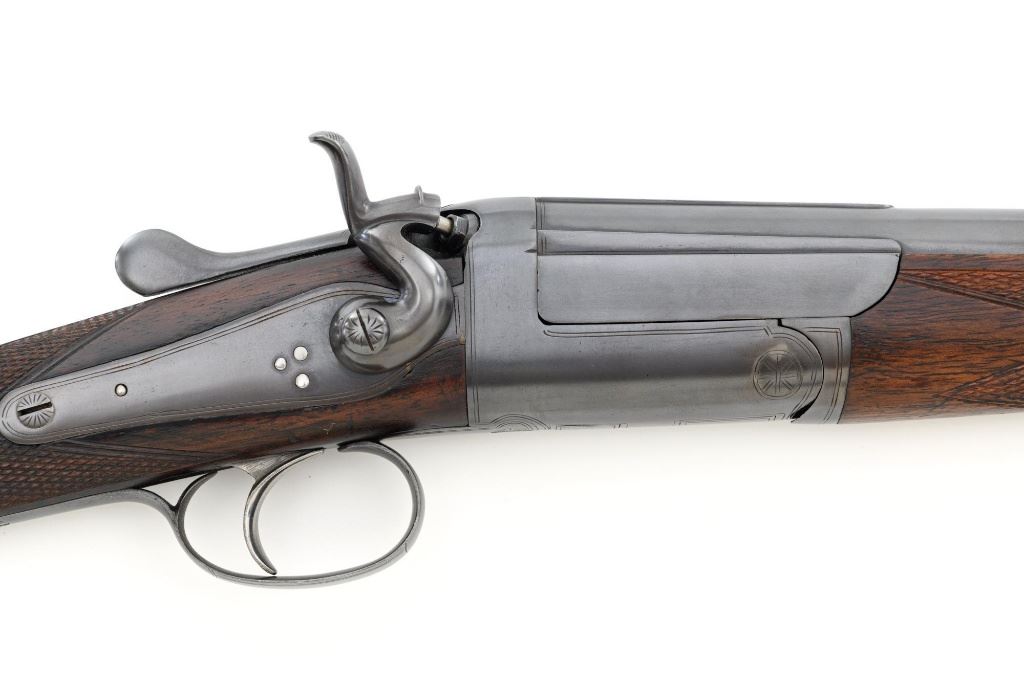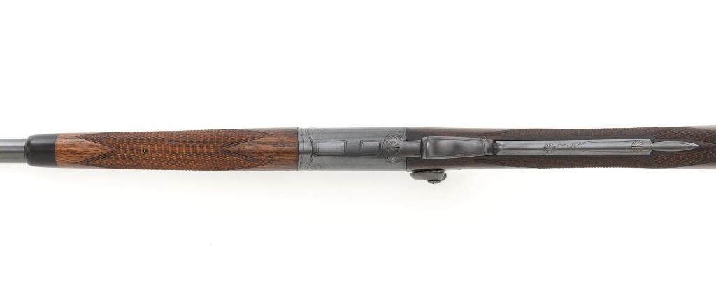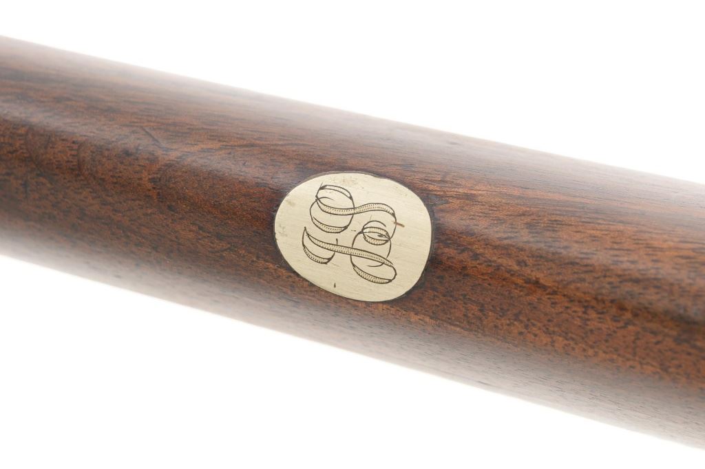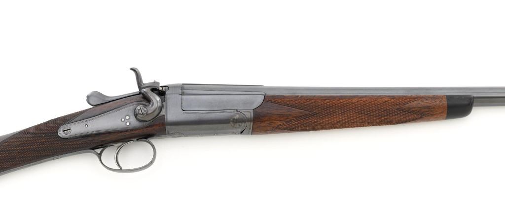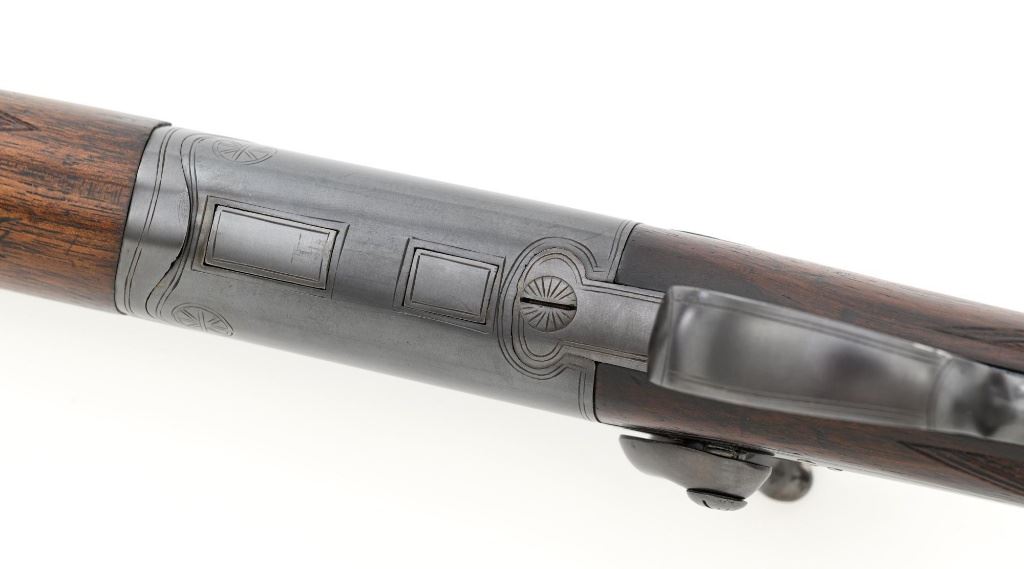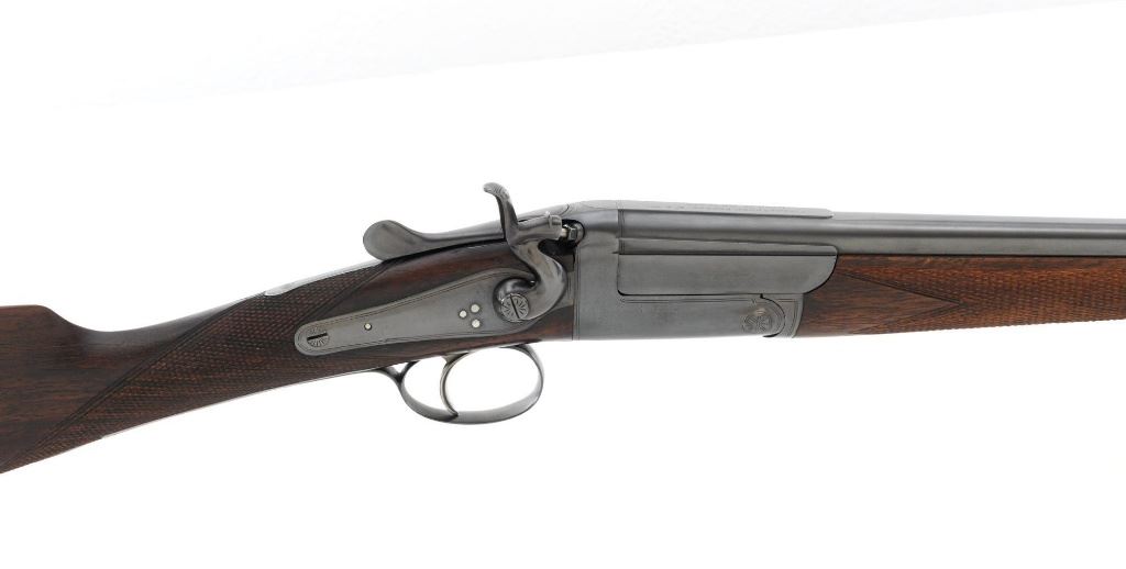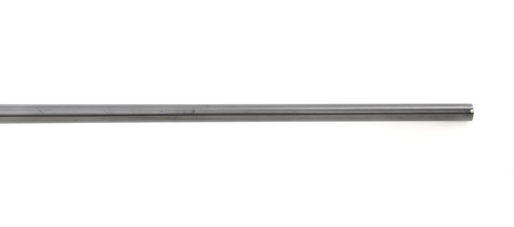 British Cowles & Dunn 28 Gauge Single Barrel Shotgun, #90774, 28 ga., 27" barrel, 2.5" chamber, blued finish, rear of barrel engraved "Cowels & Dunn, Sydney N.S.W., Made in England", receiver has Birmingham proof marks, "28c" in diamond, "nitro proof 3/8", and marked "choke", all visible numbers matching, outside rebounding hammer, island lock, extractor, silver bead front sight, straight grip checkered walnut stock with horn buttplate, 14.25" LOP (14" to original wood), checkered walnut forend with black horn end cap, and silver oval roundel with engraved letters "JS" on lower edge of buttstock. No decorative engraving, just thin border lines on the receiver and lock. Condition is very good, retaining approx. 98% of a proper refinished bluing, showing only minor wear to the right side of the receiver at the hinge pin and thinning of the bluing on the lock. Action is tight and functions properly; bore is mostly bright, with light pitting around the forcing cone, and there is a small area of roughness and pitting about 7" from the muzzle. Stock shows a light oil refinish, still showing minor dings, light depressions, and scratches; checkering appears to have been freshened up, with sharp diamonds. Horn buttplate shows damage and small losses from insects. All the screws are properly indexed with clean slots. A neat little shotgun! Est.: $900-$1,200. (C&R)