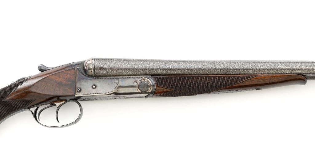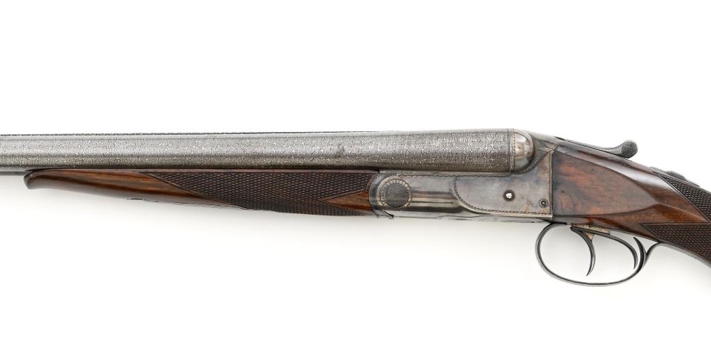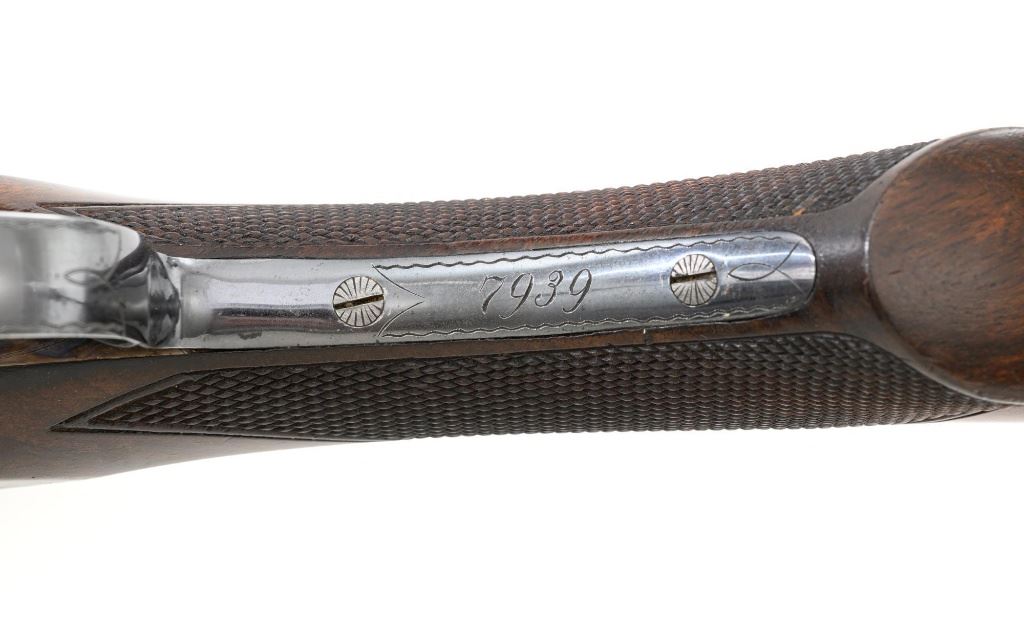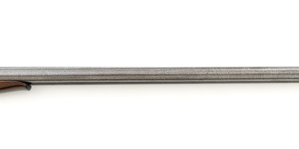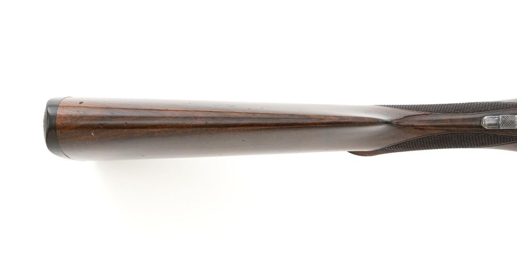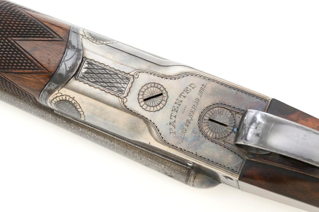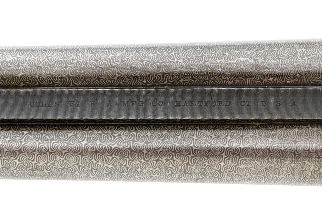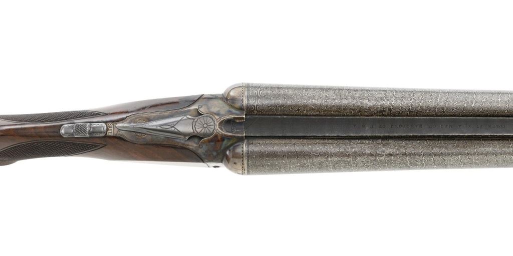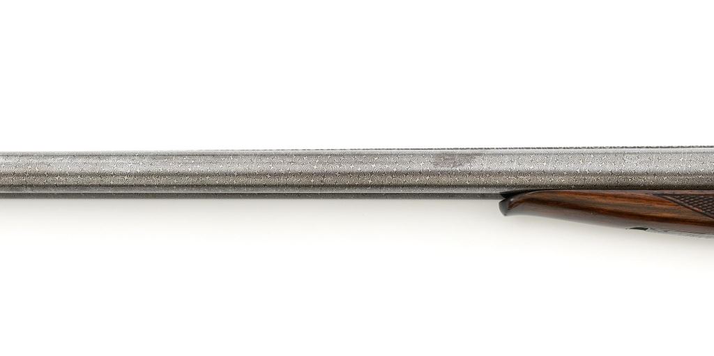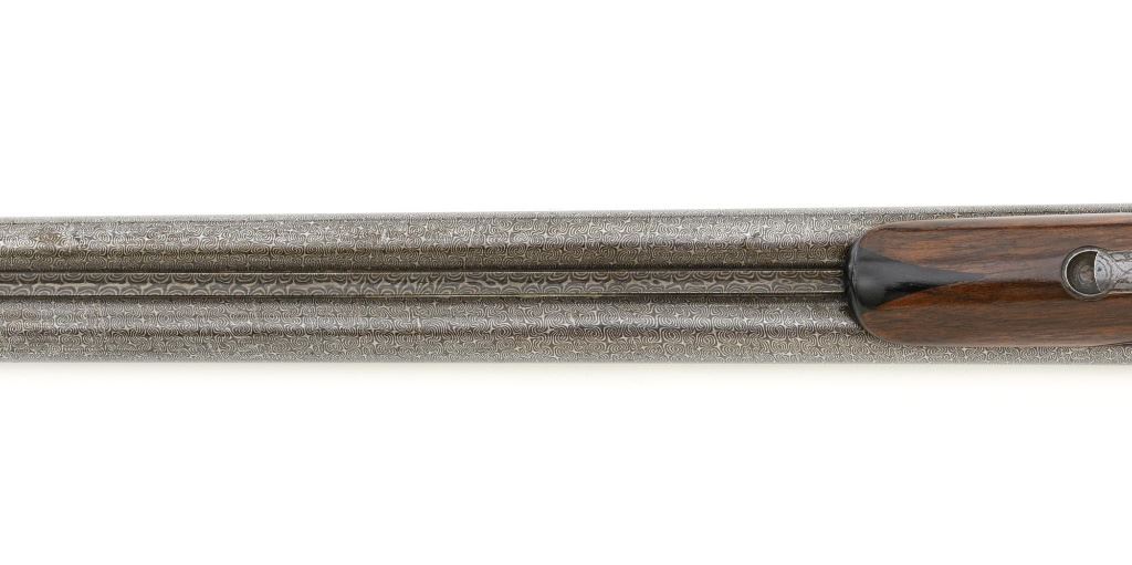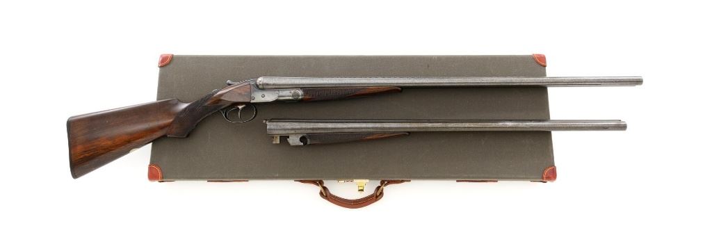 Late Colt Model 1883 Grade 1 Double Barrel Hammerless Shotgun with Two Pairs of Barrels, #7939. Both pairs of barrels are fitted and numbered to the receiver. Barrels are near 100% fine Damascus twist, with solid concave milled ribs and 2-5/8" chambers. The longer barrel is 30-3/8" in length and choked IM/IM; shorter barrel is 28-1/8" in length and choked IC/MOD. Action lockup is via double underlugs and dolls head extension. Features include double triggers, automatic safety, and simple extractors. Case hardened frame and forend irons retain 70%-80% color, with light scroll and border engraving; trigger guard and opening lever are blued. Both splinter forends and the flat pistol grip buttstock are of oil-finished "B" grade European walnut. Both splinter forends have Schnabel tips, ebony inserts, and the buttstock has no grip cap, a blank metal insert, and an original black rampant Colt buttplate. Grips on all three pieces have extensive hand checkering at 20 LPI. Stock dimensions are 13-1/2" x 1-7/8" x 3-1/8". Mfgd 1895 by Colt. The gun comes complete with a fitted green canvas hard case, and includes additional supporting data for the Model 1883, including an authentication letter from the office of the Colt historian. Condition of the gun is very good, all original with 70%-80% case colors still on the receiver, light handling marks to the wood, and nominal wear to the action, which closes tight and functions correctly. Right hand short barrel has some wear where a caustic material has touched the Damascus barrel; all four bores are mirror bright. Gun has thick, strong barrels, which are capable of shooting light loads, but has not been fired lately and should be cleaned and timed by a competent gunsmith. This gun is 130 years old but retains its original condition. From the award-winning Mike Lawler Colt shotgun collection. Est.: $2,500-$4,500. (Antique)