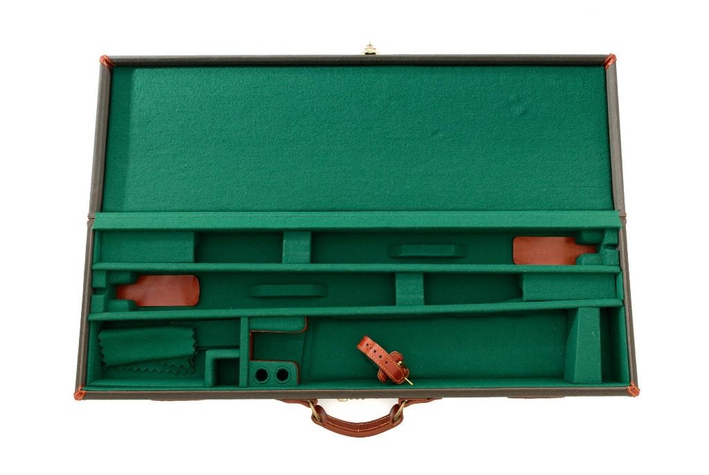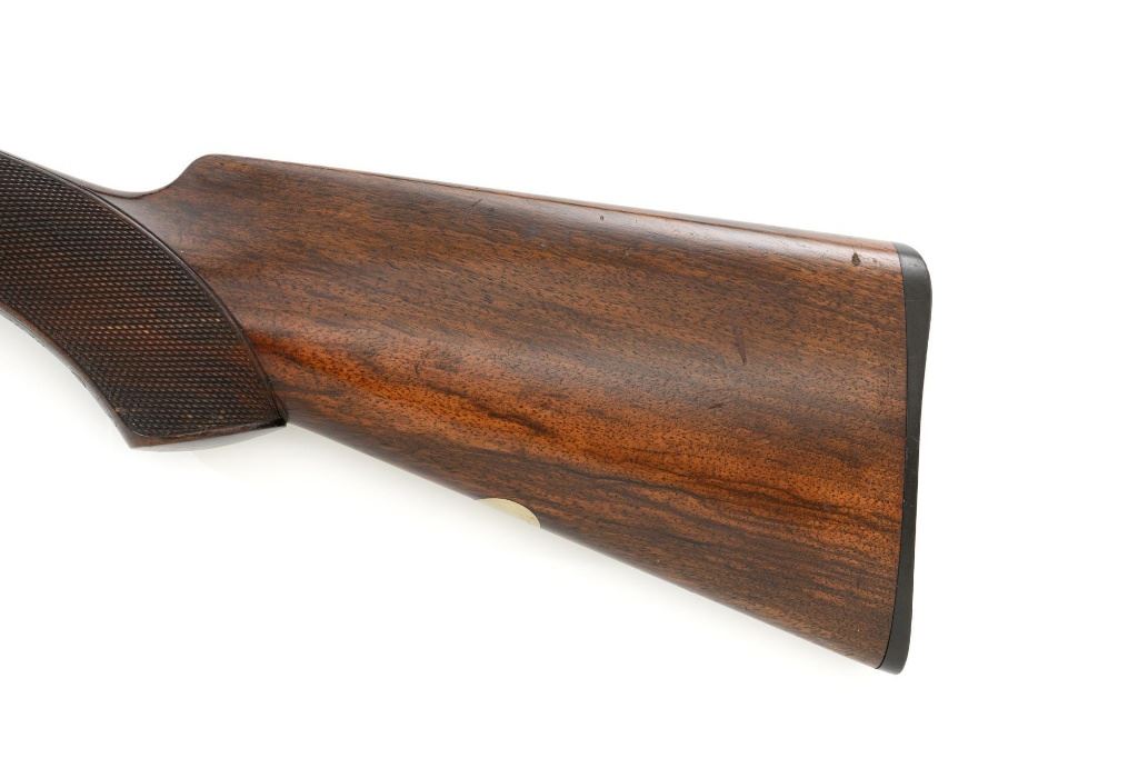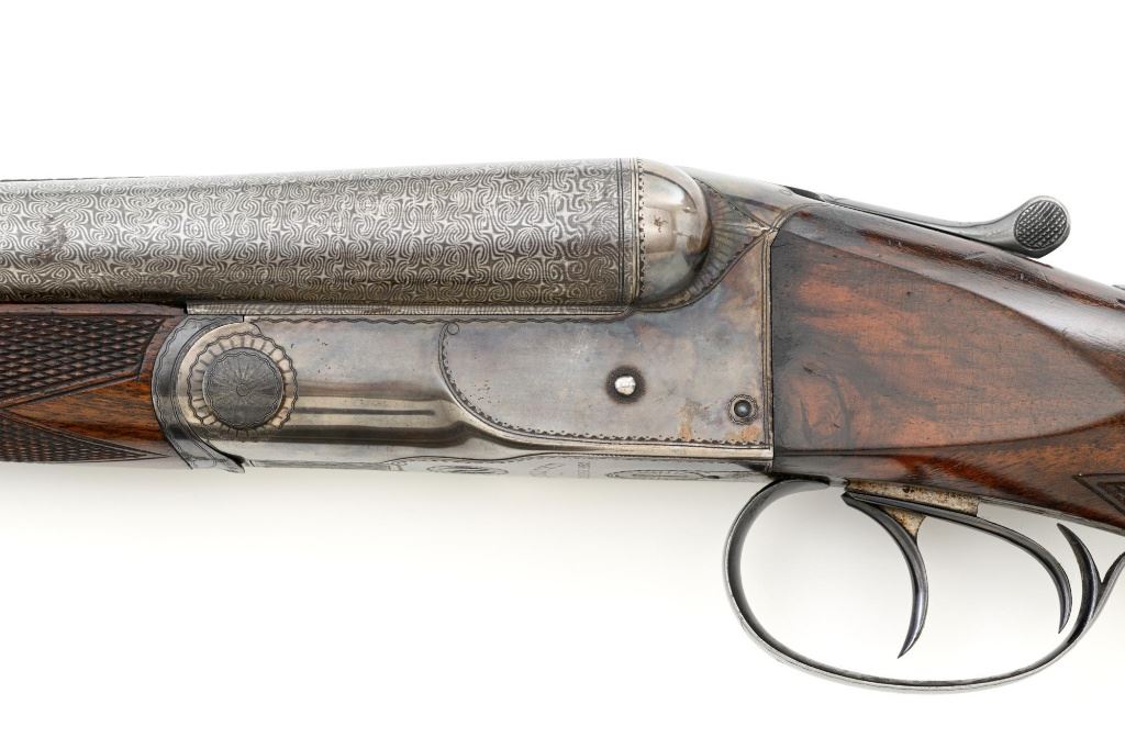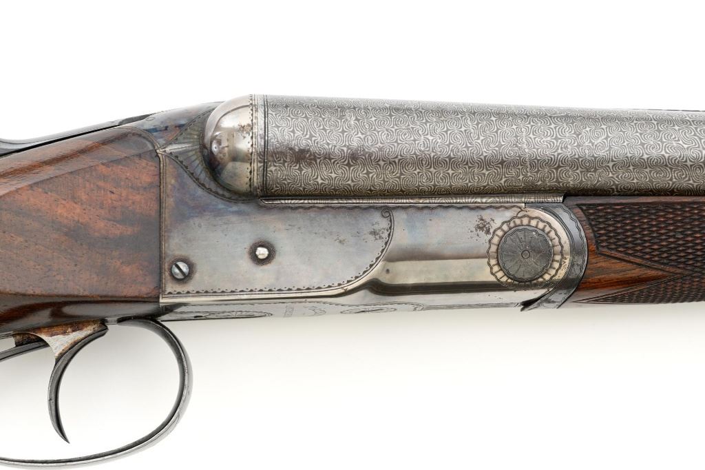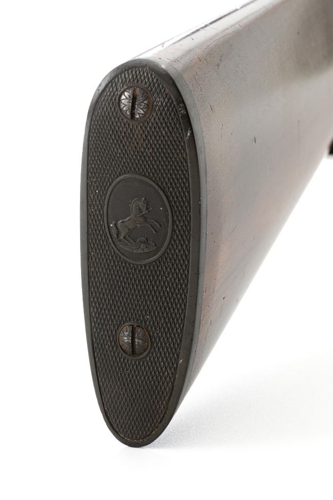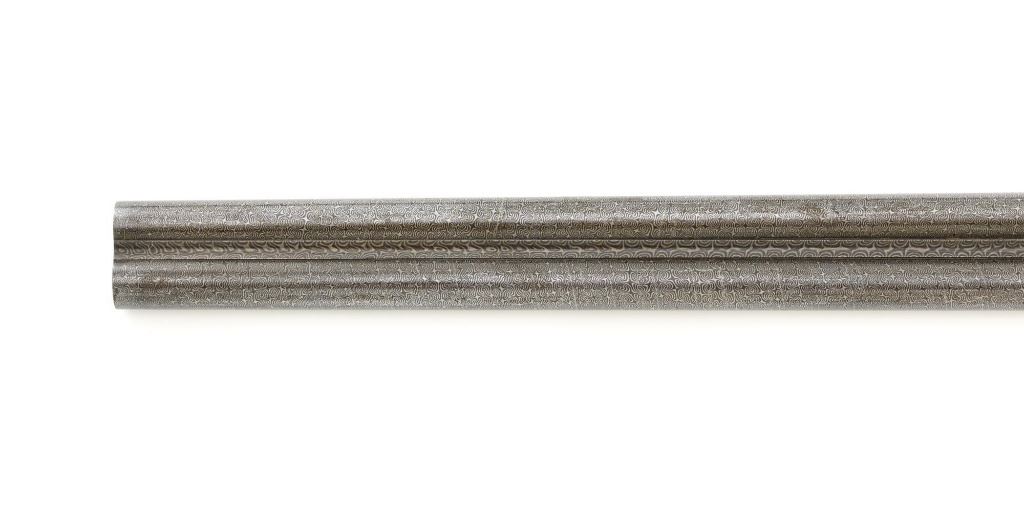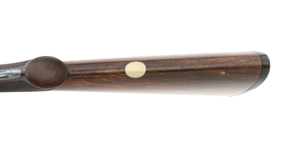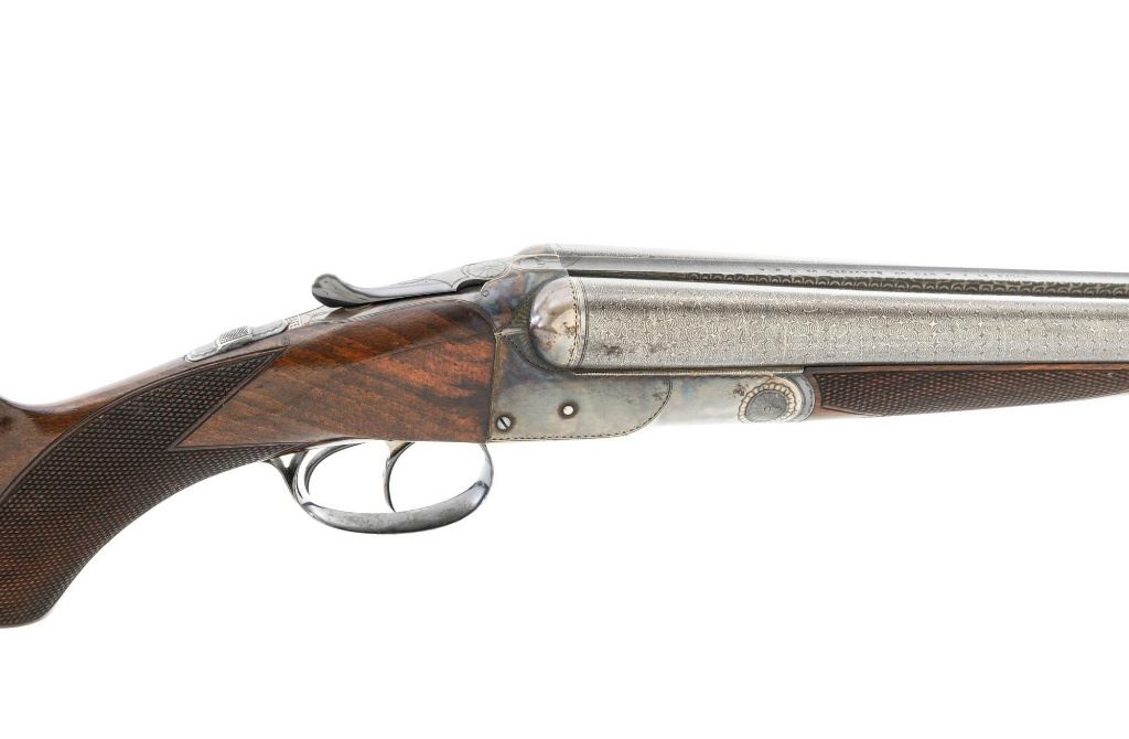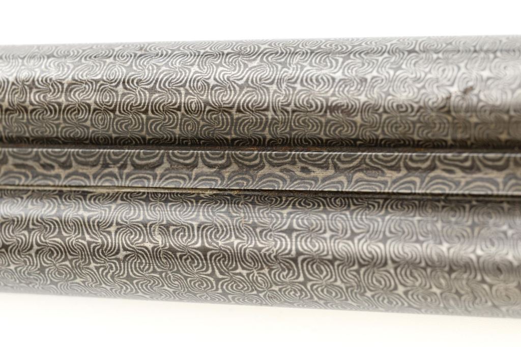 Late Colt Model 1883 Grade 1 Double Barrel Hammerless Shotgun with Two Pairs of Barrels, #7939. Both pairs of barrels are fitted and numbered to the receiver. Barrels are near 100% fine Damascus twist, with solid concave milled ribs and 2-5/8" chambers. The longer barrel is 30-3/8" in length and choked IM/IM; shorter barrel is 28-1/8" in length and choked IC/MOD. Action lockup is via double underlugs and dolls head extension. Features include double triggers, automatic safety, and simple extractors. Case hardened frame and forend irons retain 70%-80% color, with light scroll and border engraving; trigger guard and opening lever are blued. Both splinter forends and the flat pistol grip buttstock are of oil-finished "B" grade European walnut. Both splinter forends have Schnabel tips, ebony inserts, and the buttstock has no grip cap, a blank metal insert, and an original black rampant Colt buttplate. Grips on all three pieces have extensive hand checkering at 20 LPI. Stock dimensions are 13-1/2" x 1-7/8" x 3-1/8". Mfgd 1895 by Colt. The gun comes complete with a fitted green canvas hard case, and includes additional supporting data for the Model 1883, including an authentication letter from the office of the Colt historian. Condition of the gun is very good, all original with 70%-80% case colors still on the receiver, light handling marks to the wood, and nominal wear to the action, which closes tight and functions correctly. Right hand short barrel has some wear where a caustic material has touched the Damascus barrel; all four bores are mirror bright. Gun has thick, strong barrels, which are capable of shooting light loads, but has not been fired lately and should be cleaned and timed by a competent gunsmith. This gun is 130 years old but retains its original condition. From the award-winning Mike Lawler Colt shotgun collection. Est.: $2,500-$4,500. (Antique)