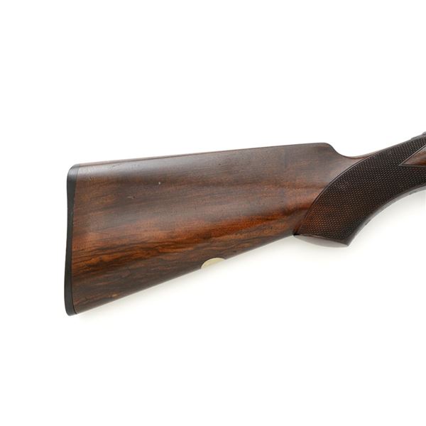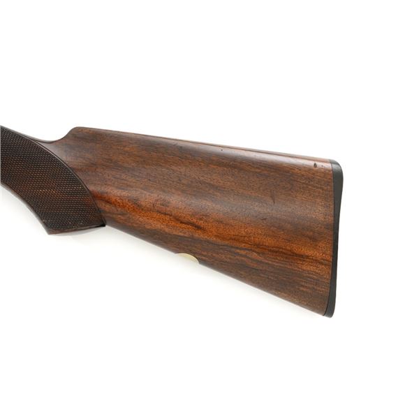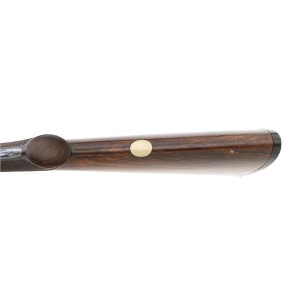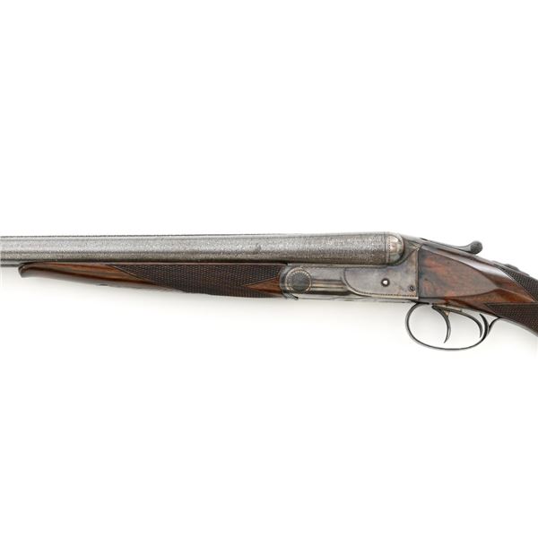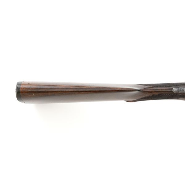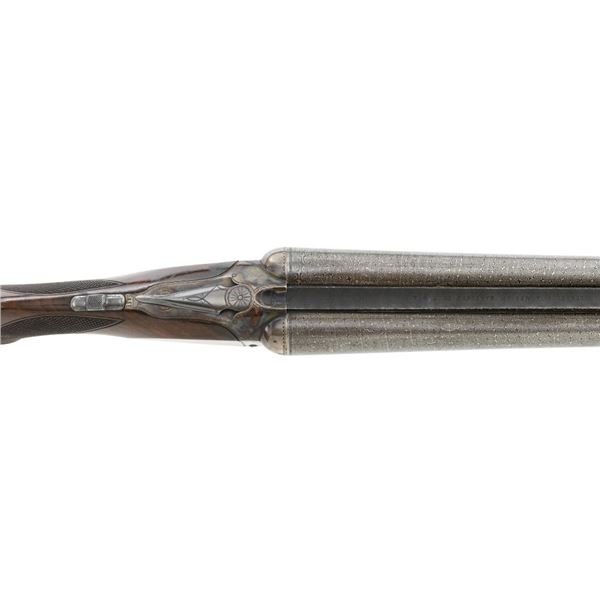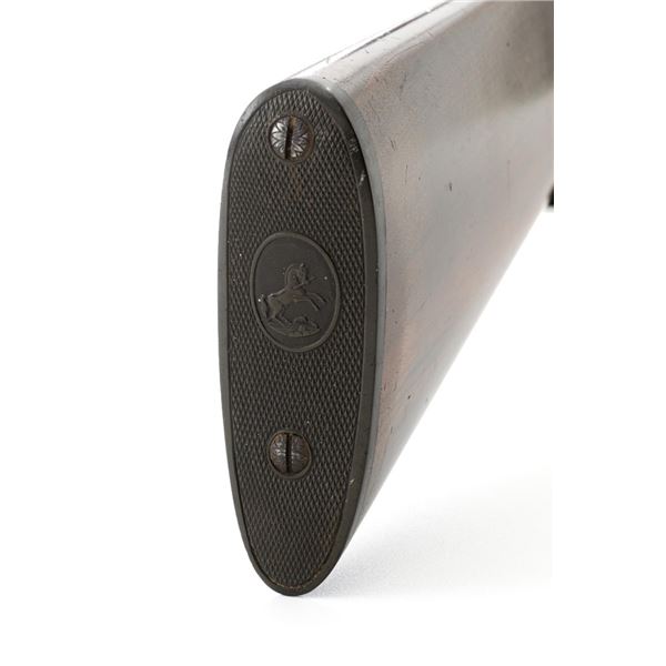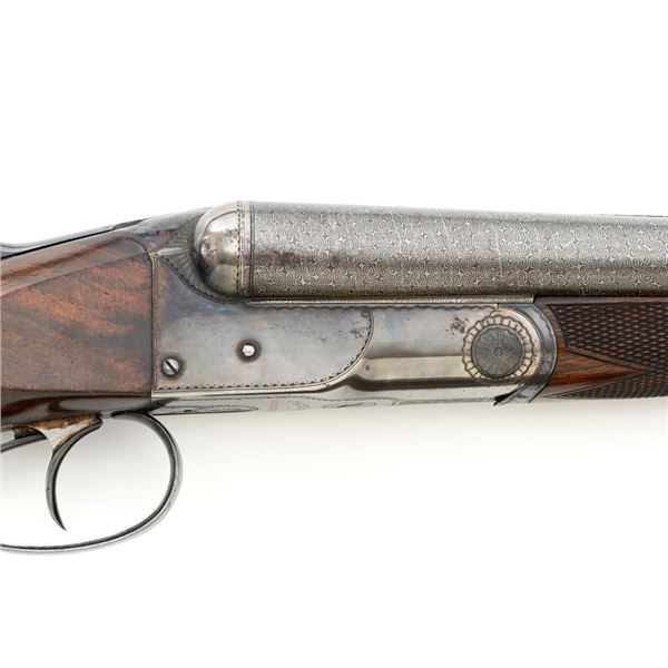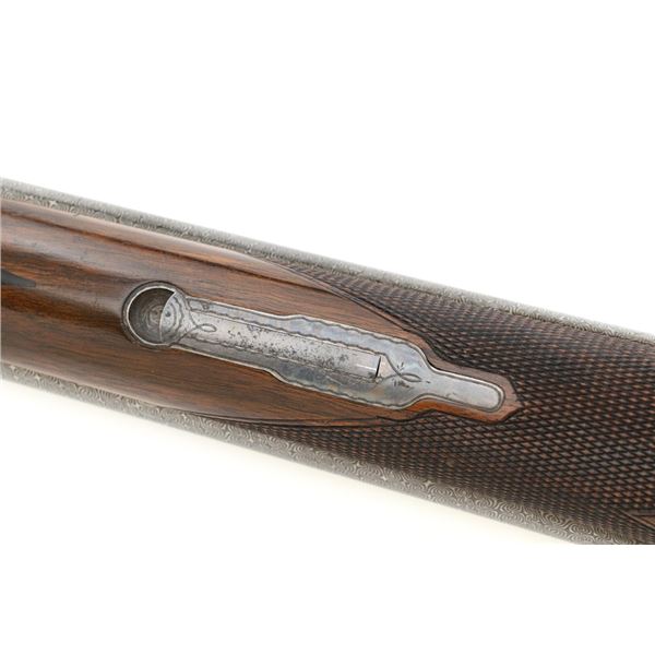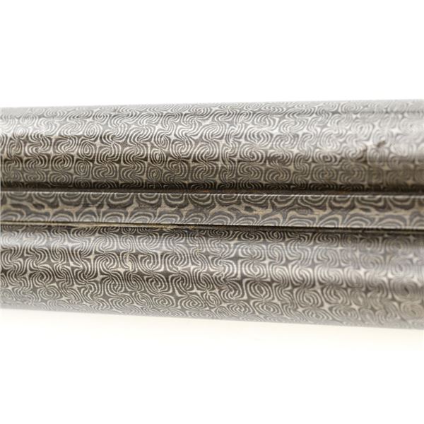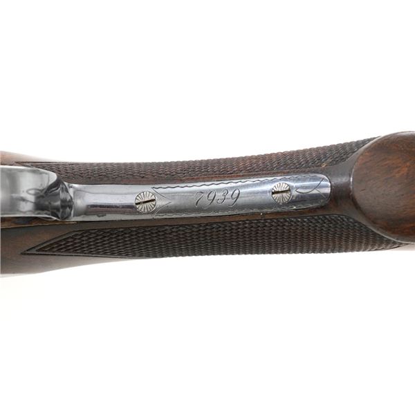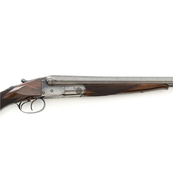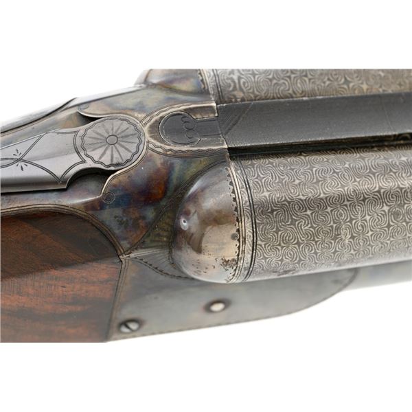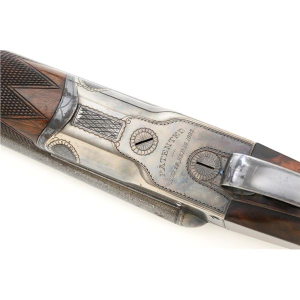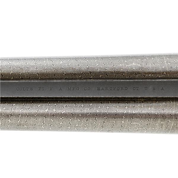 Late Colt Model 1883 Grade 1 Double Barrel Hammerless Shotgun with Two Pairs of Barrels, #7939. Both pairs of barrels are fitted and numbered to the receiver. Barrels are near 100% fine Damascus twist, with solid concave milled ribs and 2-5/8" chambers. The longer barrel is 30-3/8" in length and choked IM/IM; shorter barrel is 28-1/8" in length and choked IC/MOD. Action lockup is via double underlugs and dolls head extension. Features include double triggers, automatic safety, and simple extractors. Case hardened frame and forend irons retain 70%-80% color, with light scroll and border engraving; trigger guard and opening lever are blued. Both splinter forends and the flat pistol grip buttstock are of oil-finished "B" grade European walnut. Both splinter forends have Schnabel tips, ebony inserts, and the buttstock has no grip cap, a blank metal insert, and an original black rampant Colt buttplate. Grips on all three pieces have extensive hand checkering at 20 LPI. Stock dimensions are 13-1/2" x 1-7/8" x 3-1/8". Mfgd 1895 by Colt. The gun comes complete with a fitted green canvas hard case, and includes additional supporting data for the Model 1883, including an authentication letter from the office of the Colt historian. Condition of the gun is very good, all original with 70%-80% case colors still on the receiver, light handling marks to the wood, and nominal wear to the action, which closes tight and functions correctly. Right hand short barrel has some wear where a caustic material has touched the Damascus barrel; all four bores are mirror bright. Gun has thick, strong barrels, which are capable of shooting light loads, but has not been fired lately and should be cleaned and timed by a competent gunsmith. This gun is 130 years old but retains its original condition. From the award-winning Mike Lawler Colt shotgun collection. Est.: $2,500-$4,500. (Antique)