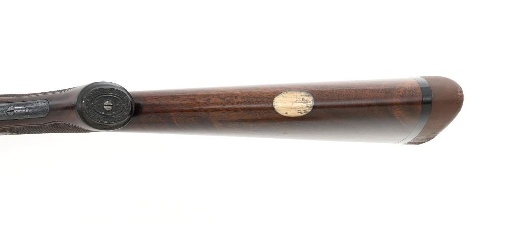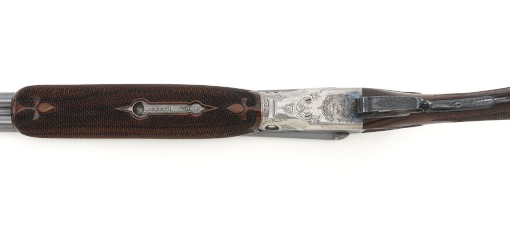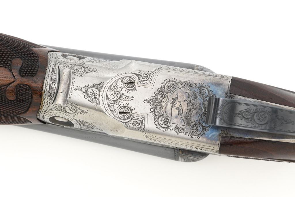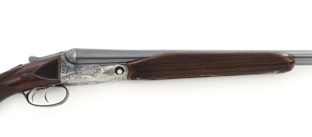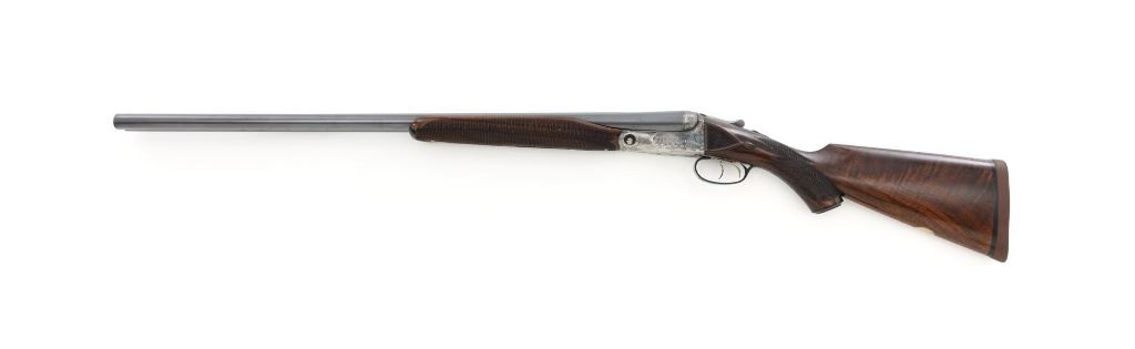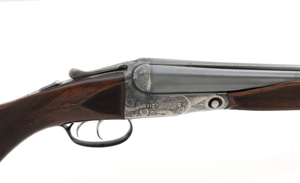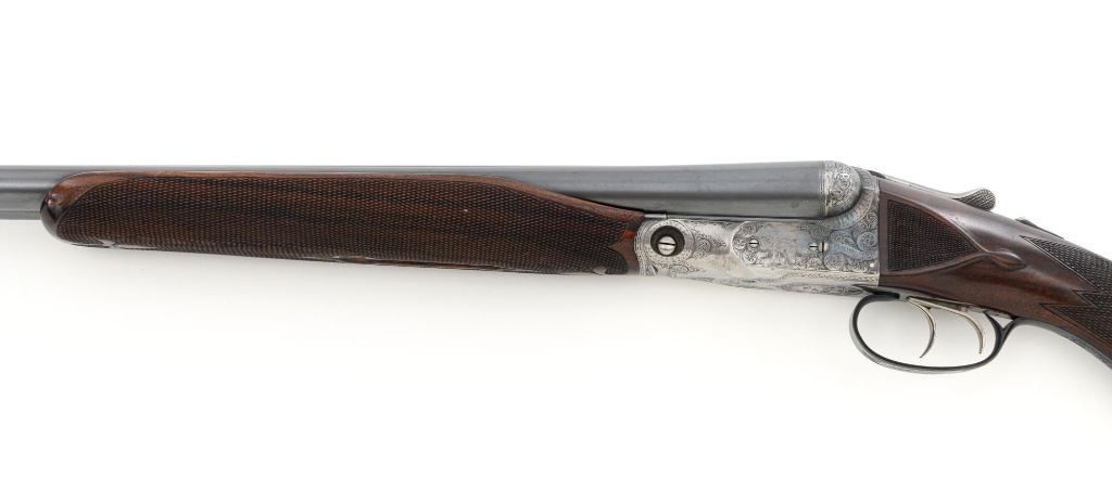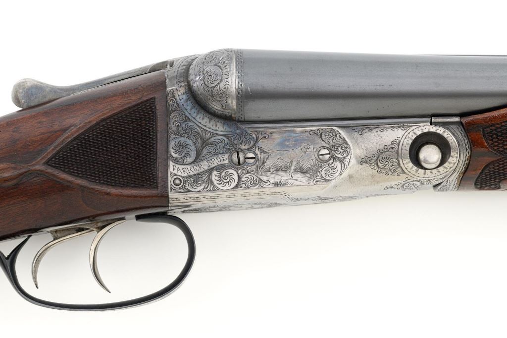 Parker Brothers DH Grade Side-by-Side Hammerless Shotgun, #217298. 12 ga., 28" "Titanic Steel" barrels have target beads, 2-3/4" chambers, concave matted rib, and are choked IC/MOD. Boxlock action utilizes a single underlug and dolls head rib extension for lockup and features double triggers, automatic safety, and simple extractors. Case hardened size 1-1/2 receiver is ornately engraved with a pointer on the left hand side, setter on the right, flushing pheasants on the bottom, and elaborate rose and scroll engraving surrounding the artwork. Beavertail forend and pistol grip buttstock are oil-finished "C" grade walnut, with extensive 21 and 26 LPI checkering, Parker Bros. gutta-percha grip cap, and brown "No-Shoc" recoil pad installed. Stock dimensions are 14-1/8" x 1-3/4" x 2-5/8". Gun was made in 1926 and looks to be an original, well-kept piece. Condition is very good, with 40%-50% case colors on the receiver, machine-turned water table, few handling marks to the wood, expected wear to the action, which closes tight and functions correctly; bores are mirror bright. Overall, there may have been some small repairs over the years, but the basic shotgun has been kept in its fundamental condition and should be ready for light field use today. Est.: $1,800-$2,400. (C&R)