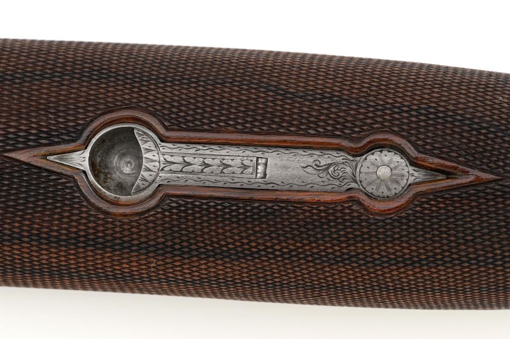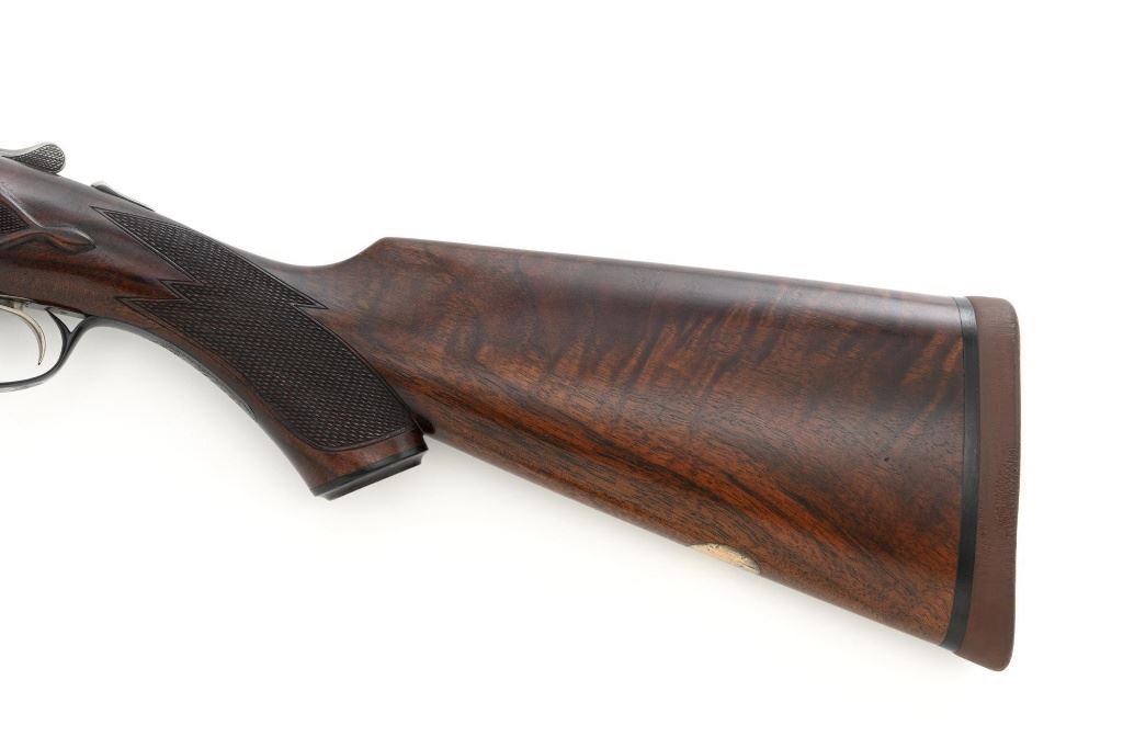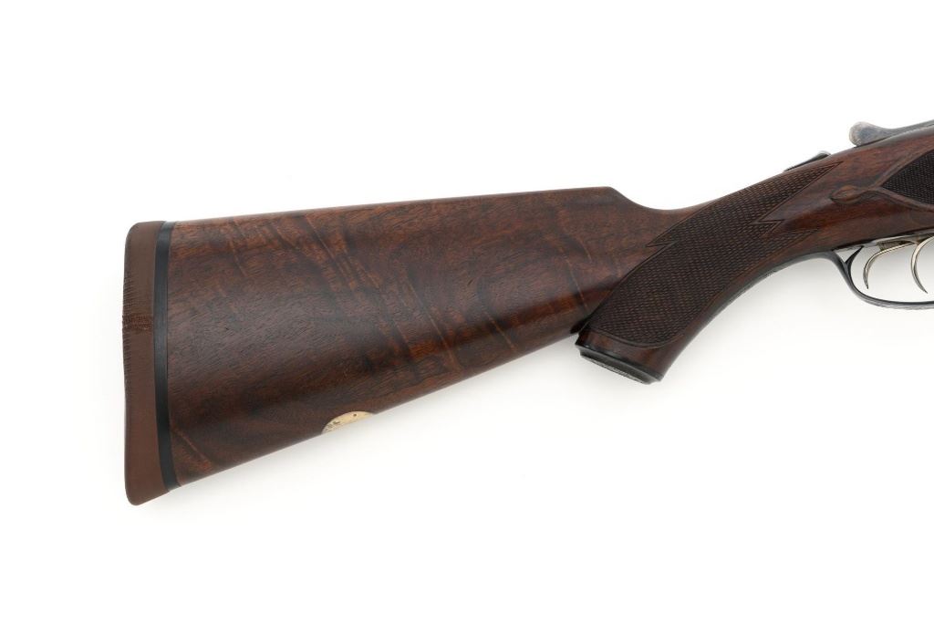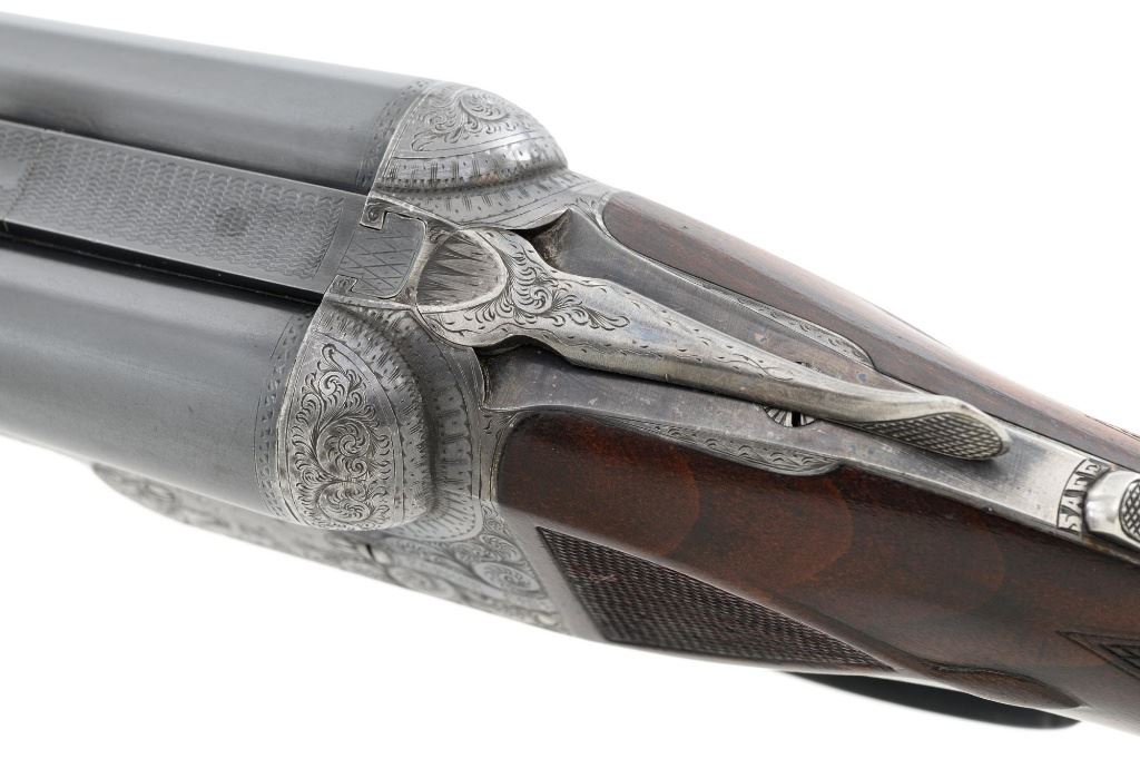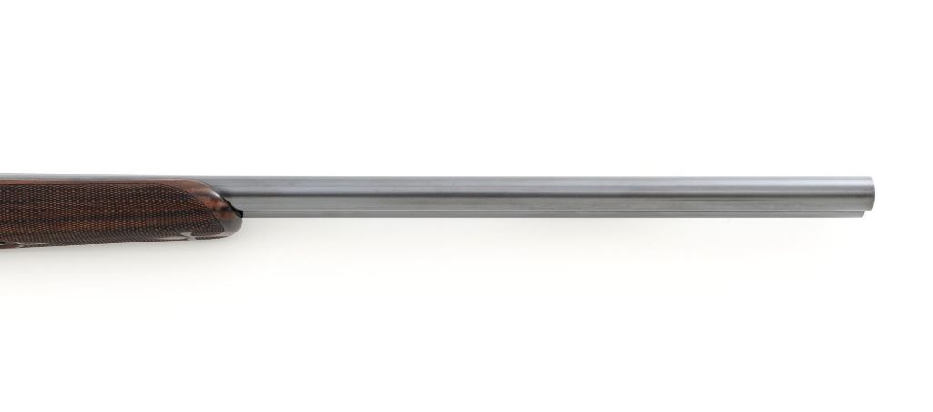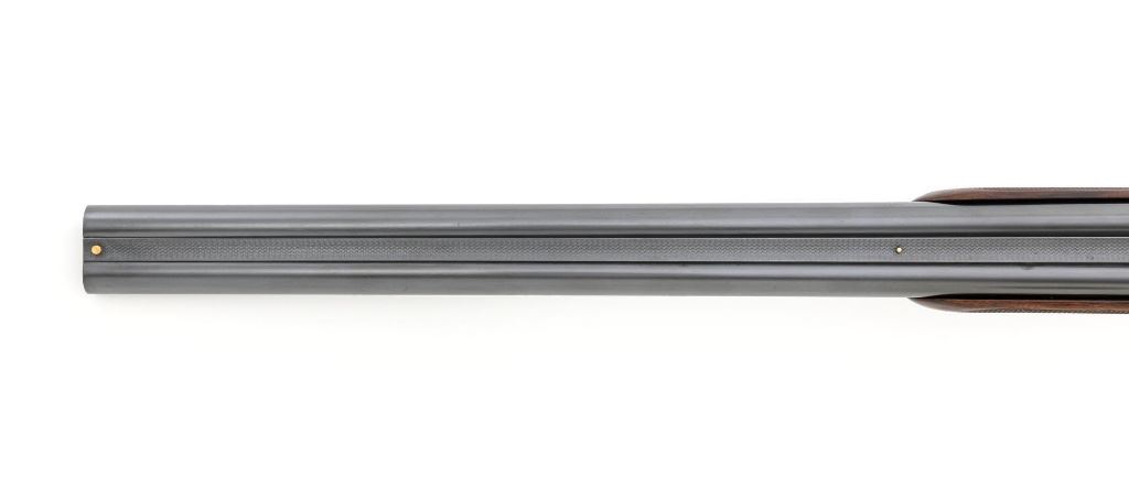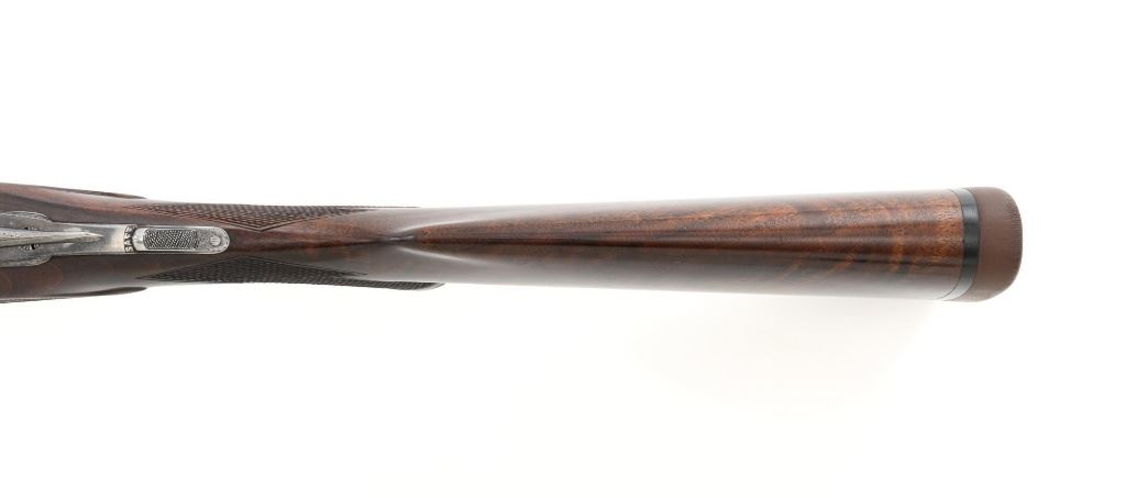 Parker Brothers DH Grade Side-by-Side Hammerless Shotgun, #217298. 12 ga., 28" "Titanic Steel" barrels have target beads, 2-3/4" chambers, concave matted rib, and are choked IC/MOD. Boxlock action utilizes a single underlug and dolls head rib extension for lockup and features double triggers, automatic safety, and simple extractors. Case hardened size 1-1/2 receiver is ornately engraved with a pointer on the left hand side, setter on the right, flushing pheasants on the bottom, and elaborate rose and scroll engraving surrounding the artwork. Beavertail forend and pistol grip buttstock are oil-finished "C" grade walnut, with extensive 21 and 26 LPI checkering, Parker Bros. gutta-percha grip cap, and brown "No-Shoc" recoil pad installed. Stock dimensions are 14-1/8" x 1-3/4" x 2-5/8". Gun was made in 1926 and looks to be an original, well-kept piece. Condition is very good, with 40%-50% case colors on the receiver, machine-turned water table, few handling marks to the wood, expected wear to the action, which closes tight and functions correctly; bores are mirror bright. Overall, there may have been some small repairs over the years, but the basic shotgun has been kept in its fundamental condition and should be ready for light field use today. Est.: $1,800-$2,400. (C&R)