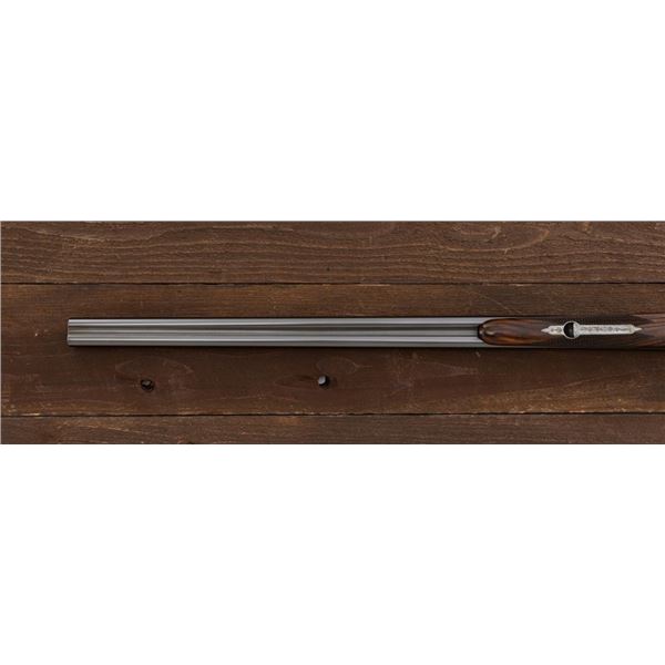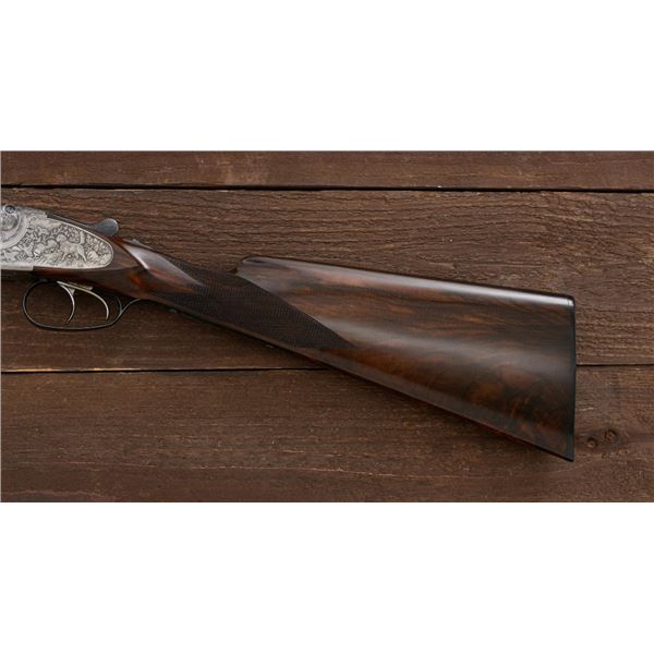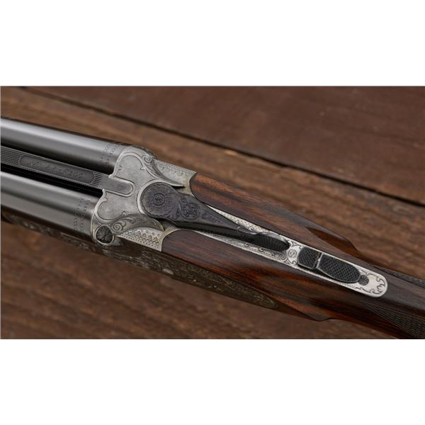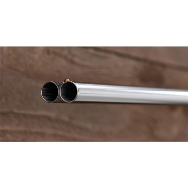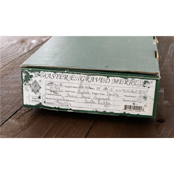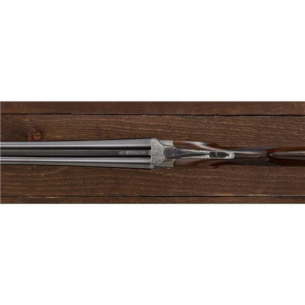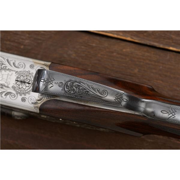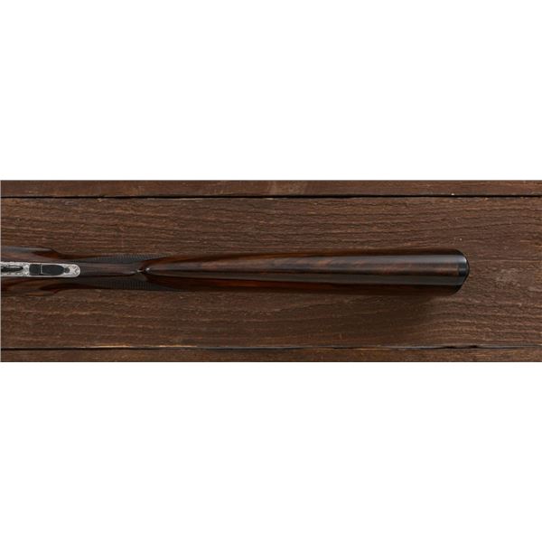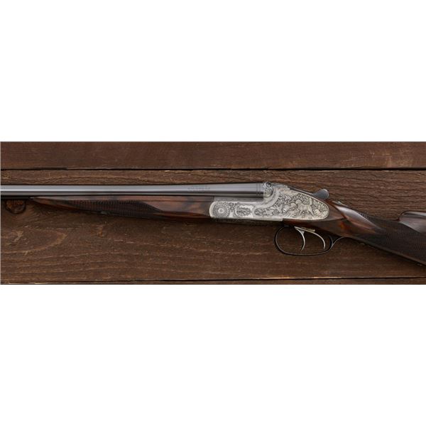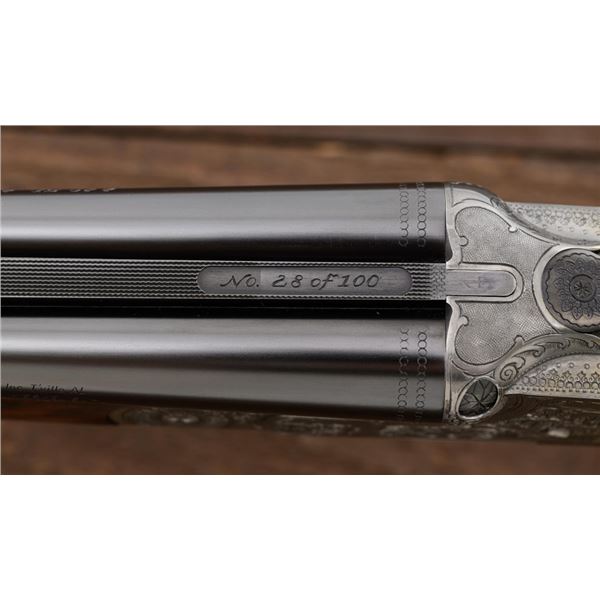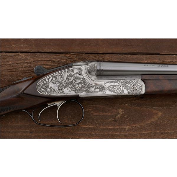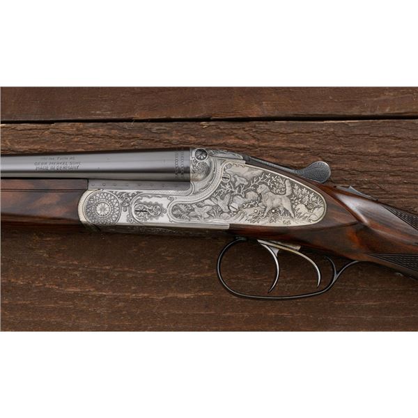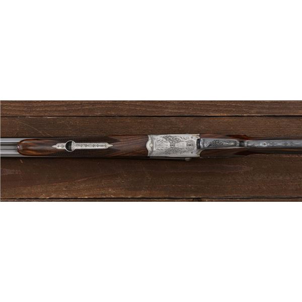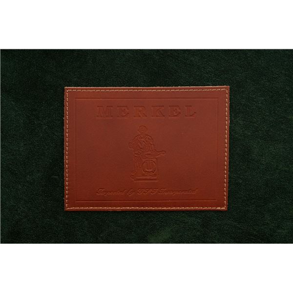 Merkel Model 280SL/360SL Two Barrel Side-by-Side Shotgun Set, #481027, and marked "No. 28 of 100". The 28 ga., 28" barrels are marked "481027-1", have a matted solid rib, 2-3/4" chambers and are choked Mod/Full. The .410 bore, 28" barrels are marked "481027-2", have 3" chambers, and are choked Full/Full. Coin-finished sidelock action features a double underlug lockup with Greener cross bolt, double triggers, automatic safety, and selective ejectors. Sidelocks are ornately engraved with game scenes, including a setter flushing grouse on the left hand side, a fox flushing same on the right hand side, ornate scroll patterns with "Suhl" logo on the bottom. Top tang and forend iron are likewise coin-finished; top lever, trigger guard, and lower tang are blue. Both splinter forends and the straight grip buttstock are "D" grade European walnut, satin finished and checkered at 20 LPI. Stock dimensions are 14-1/2" x 1-3/8" x 2-1/2". Two-barrel set was completed in approx. 2000 and is contained in a Merkel fitted luggage hard case. Original Merkel shipping box is also included. Condition is as new, with virtually no marks to the wood, and some opening and closing wear to the breech face. Action closes tight however, and functions correctly; bores are all mirror bright. Est.: $10,000 - $12,000. (Modern)