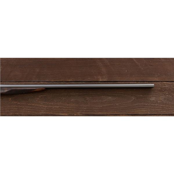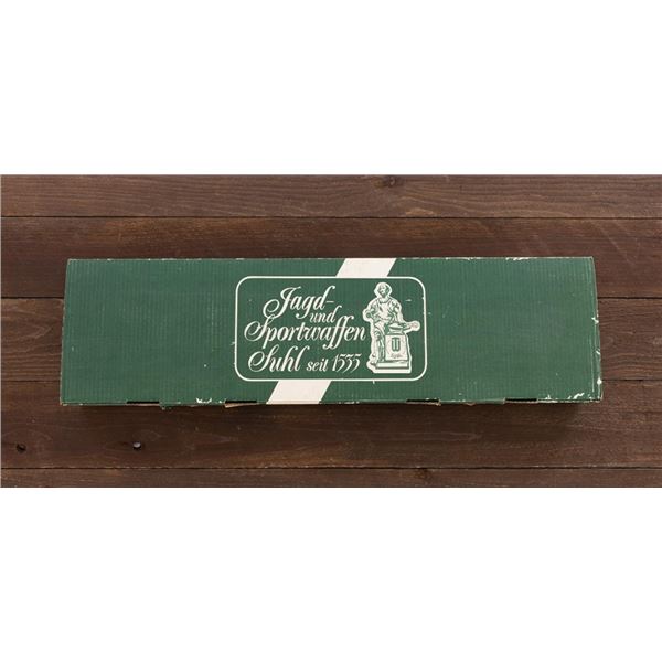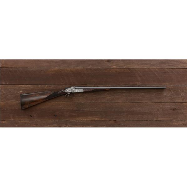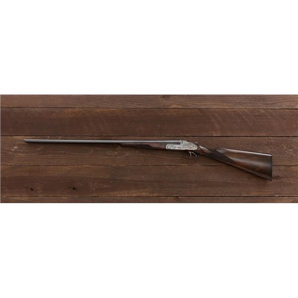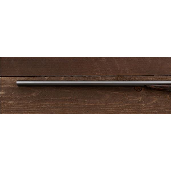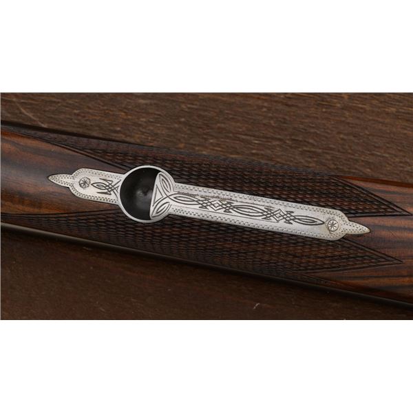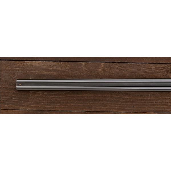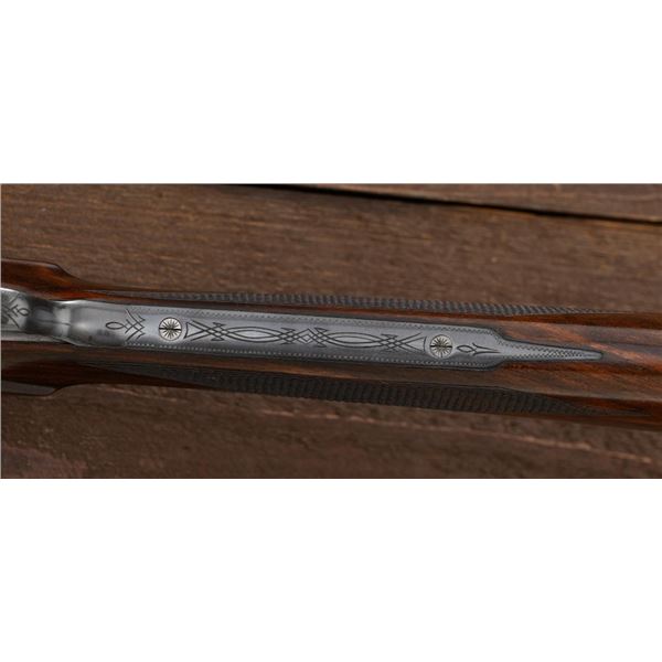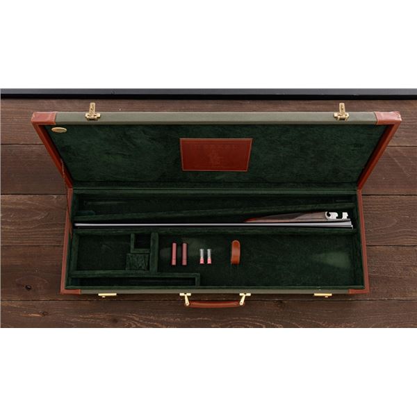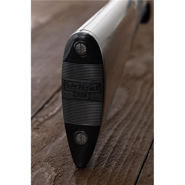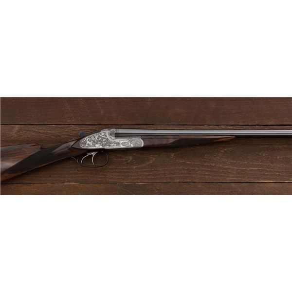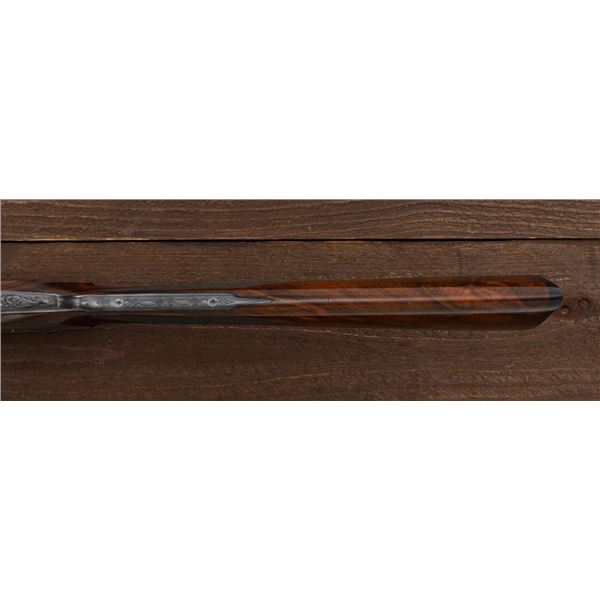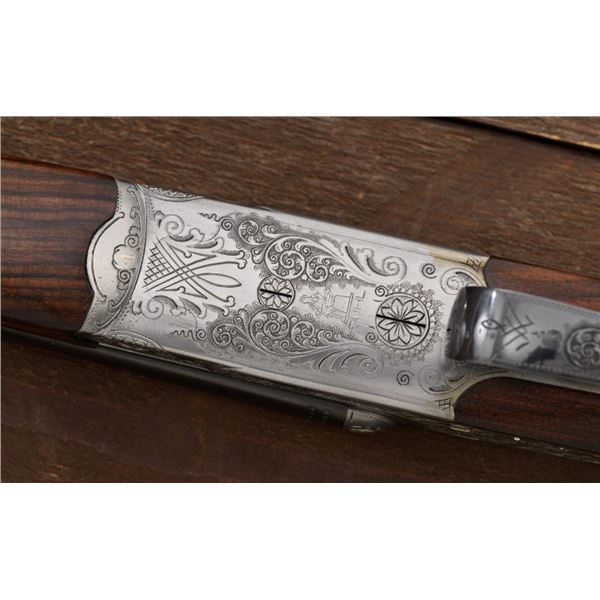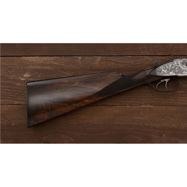 Merkel Model 280SL/360SL Two Barrel Side-by-Side Shotgun Set, #481027, and marked "No. 28 of 100". The 28 ga., 28" barrels are marked "481027-1", have a matted solid rib, 2-3/4" chambers and are choked Mod/Full. The .410 bore, 28" barrels are marked "481027-2", have 3" chambers, and are choked Full/Full. Coin-finished sidelock action features a double underlug lockup with Greener cross bolt, double triggers, automatic safety, and selective ejectors. Sidelocks are ornately engraved with game scenes, including a setter flushing grouse on the left hand side, a fox flushing same on the right hand side, ornate scroll patterns with "Suhl" logo on the bottom. Top tang and forend iron are likewise coin-finished; top lever, trigger guard, and lower tang are blue. Both splinter forends and the straight grip buttstock are "D" grade European walnut, satin finished and checkered at 20 LPI. Stock dimensions are 14-1/2" x 1-3/8" x 2-1/2". Two-barrel set was completed in approx. 2000 and is contained in a Merkel fitted luggage hard case. Original Merkel shipping box is also included. Condition is as new, with virtually no marks to the wood, and some opening and closing wear to the breech face. Action closes tight however, and functions correctly; bores are all mirror bright. Est.: $10,000 - $12,000. (Modern)