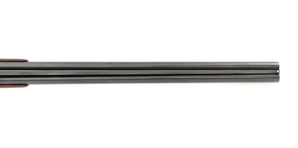 Rare Colt-Sauer Royal Grade Prototype Side-By-Side Shotgun, #BB4549, 20 ga., 28-1/2" Krupp fluid steel barrels have a tapered, solid matte rib, 3" chambers, and are choked SKT/SKT. Right hand barrel is marked "Colts PT. FA. Mfg. Co. Hartford, Ct, USA". Sauer scalloped boxlock action uses two underlugs plus a Greener crossbolt for lockup, and features include a single selective mechanical trigger, automatic safety, cocking indicators, and selective ejectors. Coin finished receiver is left in the white and moderately engraved with attractive scrolls. Trigger guard, bottom tang, and opening lever are blued. Beavertail forend and pistol grip buttstock are oil finished "B" grade European walnut, with thorough hand checkering at 20 LPI, black plastic grip cap, and original black skeet style recoil pad. Stock dimensions are 14-3/8" x 1-3/4" x 2-1/2". Gun was made by Sauer & Sohn in Western Germany for Colt in 1970. Condition is near excellent with few handling marks to the wood and very little visible wear to the action, which closes very tight and functions correctly; bores are mirror bright. Gun comes complete with a short history of Colt-Sauer discussions on a possible side-by-side. The serial number of this gun is 13 digits away from the other 20 ga. royal grade; there are approximately three known 20 ga. Colt-Sauer doubles, and this is one; a very nice skeet gun indeed. From the award winning Mike Lawler Colt Shotgun Collection. Est.: $3,500-$4,000. (C&R)