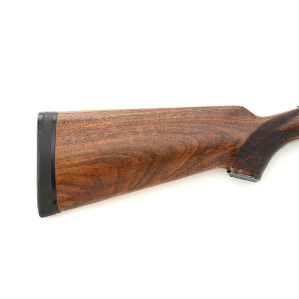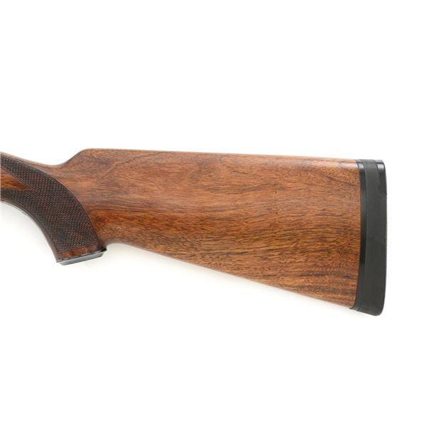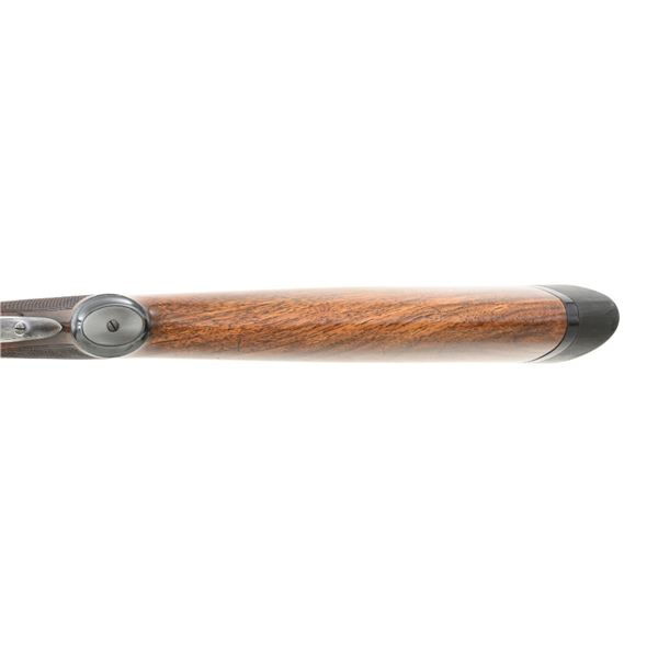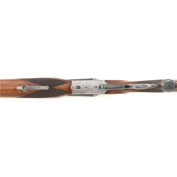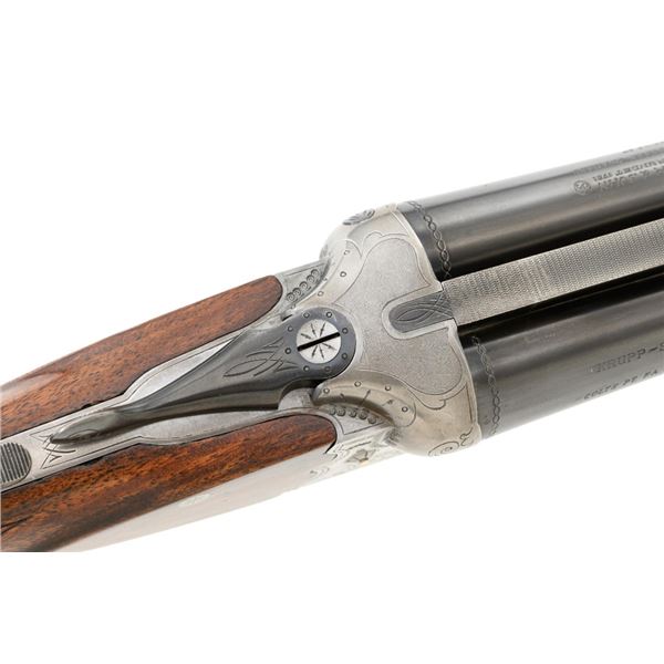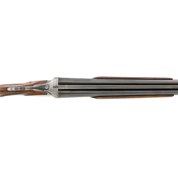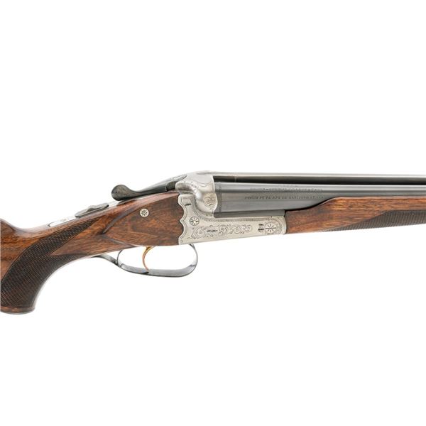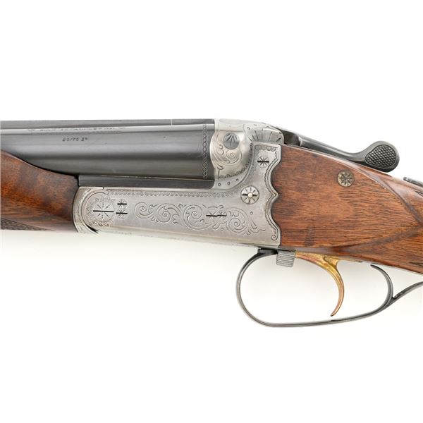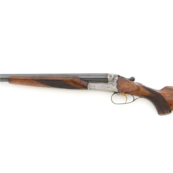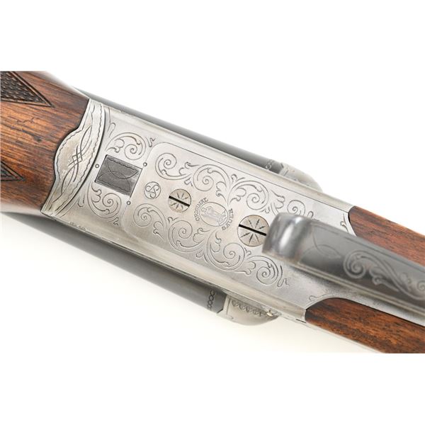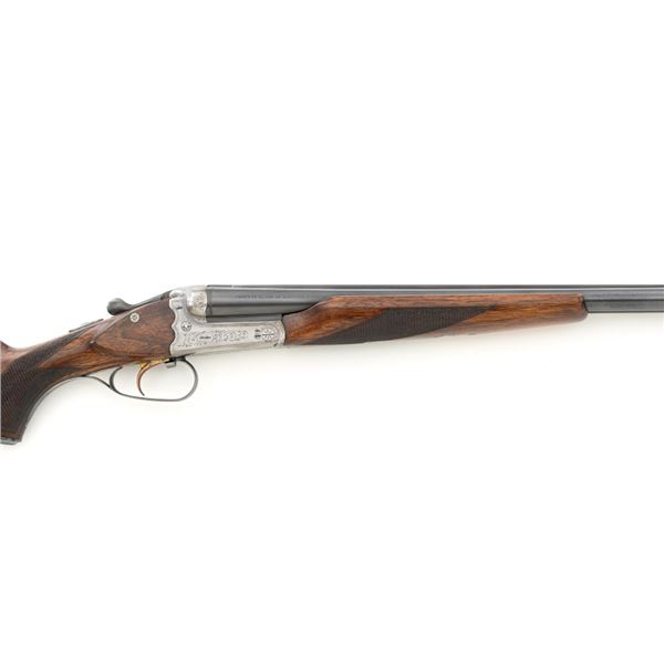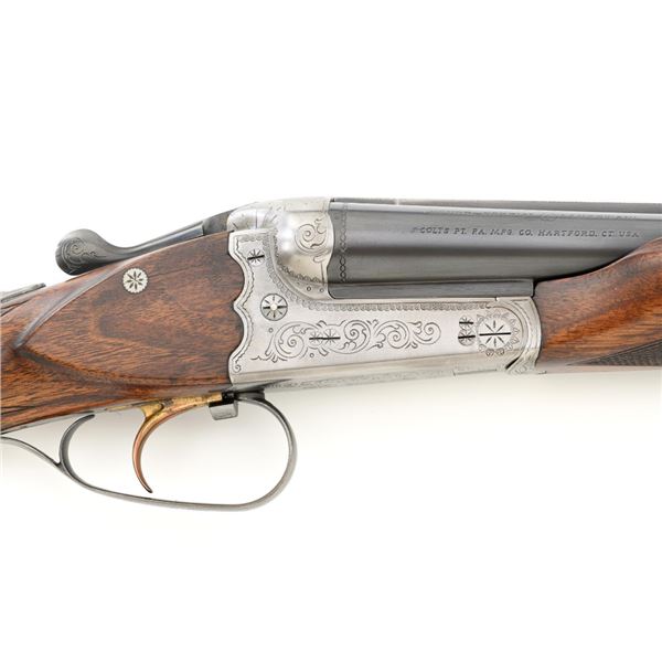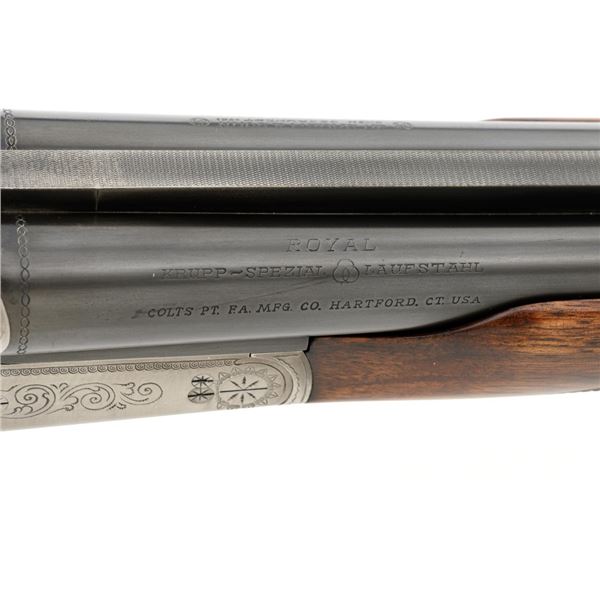 Rare Colt-Sauer Royal Grade Prototype Side-By-Side Shotgun, #BB4549, 20 ga., 28-1/2" Krupp fluid steel barrels have a tapered, solid matte rib, 3" chambers, and are choked SKT/SKT. Right hand barrel is marked "Colts PT. FA. Mfg. Co. Hartford, Ct, USA". Sauer scalloped boxlock action uses two underlugs plus a Greener crossbolt for lockup, and features include a single selective mechanical trigger, automatic safety, cocking indicators, and selective ejectors. Coin finished receiver is left in the white and moderately engraved with attractive scrolls. Trigger guard, bottom tang, and opening lever are blued. Beavertail forend and pistol grip buttstock are oil finished "B" grade European walnut, with thorough hand checkering at 20 LPI, black plastic grip cap, and original black skeet style recoil pad. Stock dimensions are 14-3/8" x 1-3/4" x 2-1/2". Gun was made by Sauer & Sohn in Western Germany for Colt in 1970. Condition is near excellent with few handling marks to the wood and very little visible wear to the action, which closes very tight and functions correctly; bores are mirror bright. Gun comes complete with a short history of Colt-Sauer discussions on a possible side-by-side. The serial number of this gun is 13 digits away from the other 20 ga. royal grade; there are approximately three known 20 ga. Colt-Sauer doubles, and this is one; a very nice skeet gun indeed. From the award winning Mike Lawler Colt Shotgun Collection. Est.: $3,500-$4,000. (C&R)