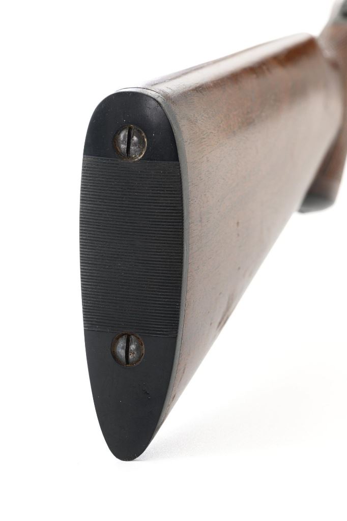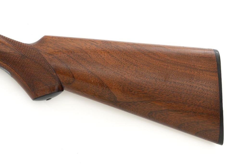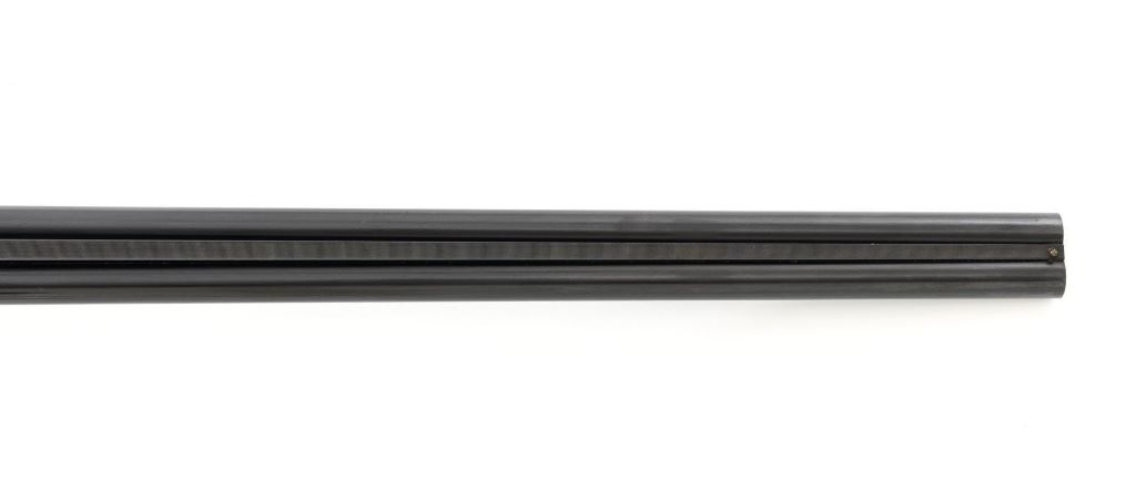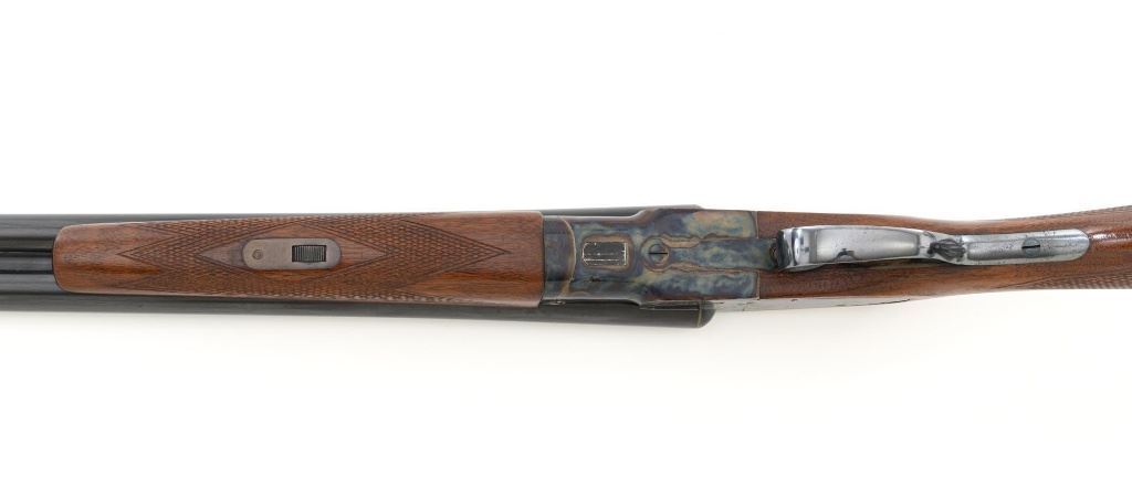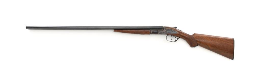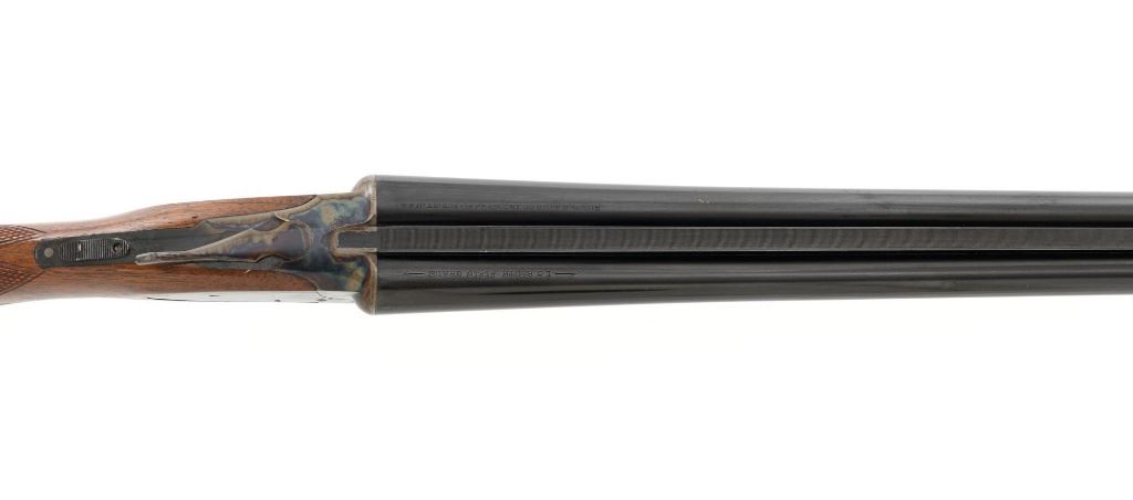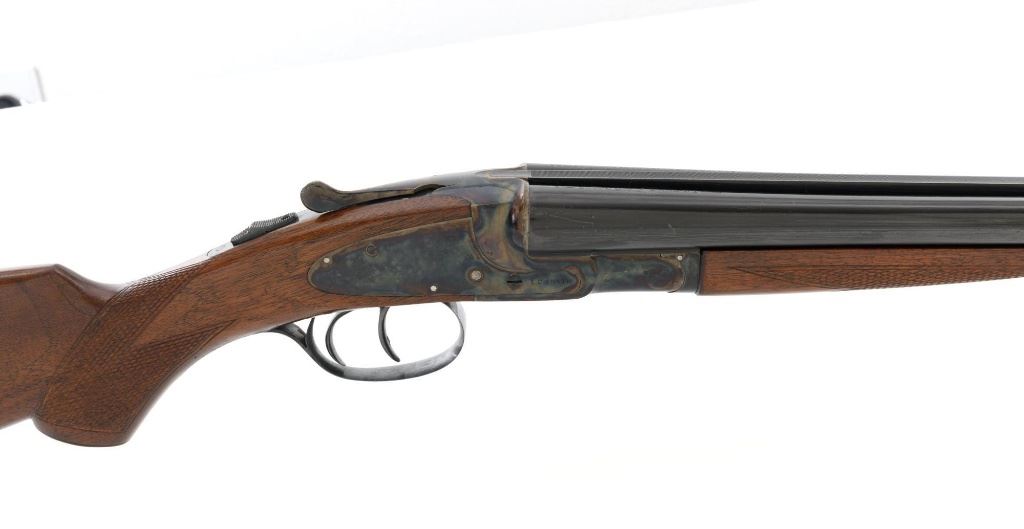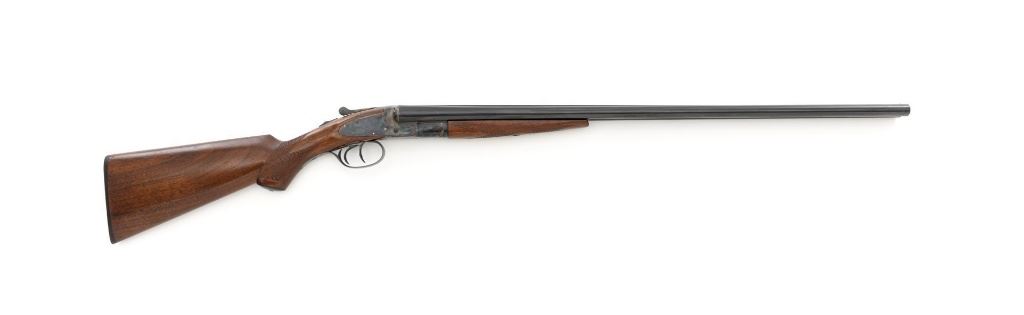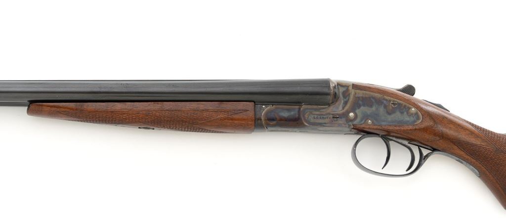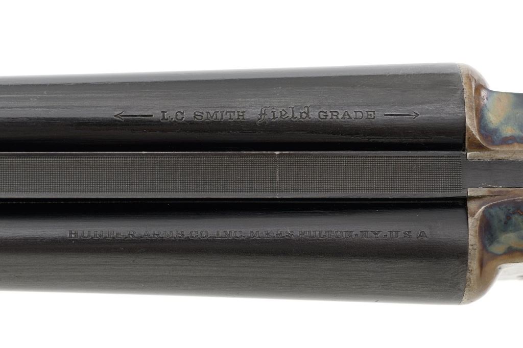 L.C. Smith Field Grade Side-by-Side Shotgun, #145988. 20 ga., 28" solid milled rib barrels are marked "L.C. Smith Field Grade", have 2-3/4" chambers, and are choked IM/Full. Featherweight sidelock action locks up via a Greener crossbolt, and features double triggers, automatic safety, and auto-ejectors. Receiver and hammer lock plates retain 85%+ case colors, but many areas are frosted. Splinter forend and pistol grip buttstock are oil-finished American walnut, with moderate checkering, black plastic grip cap and buttpad. Stock dimensions are 14-1/4" x 1-5/8" x 2-5/8". Mfgd 1935 by Hunter Arms Co. of Fulton, N.Y. Condition is very good, with only the case color frosting, and cracking of the wood buttstock as negatives. Action is like new, with very little wear to the surfaces. Breech closes tight and functions perfectly; bores mirror bright. Est.: $1,200-$1,800. (C&R)