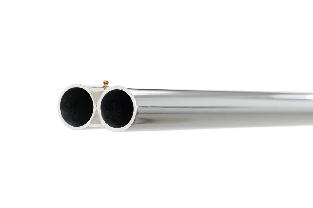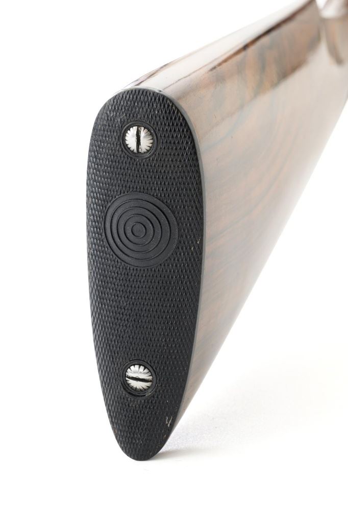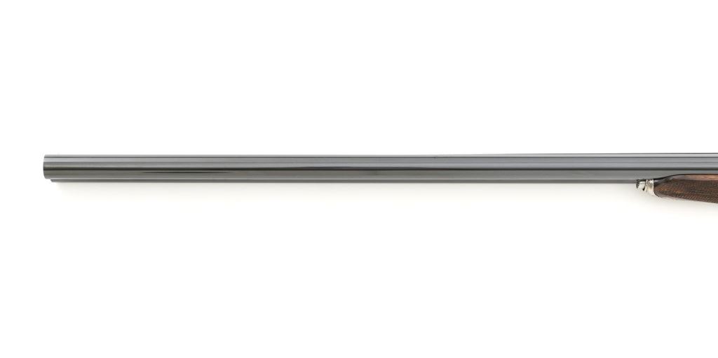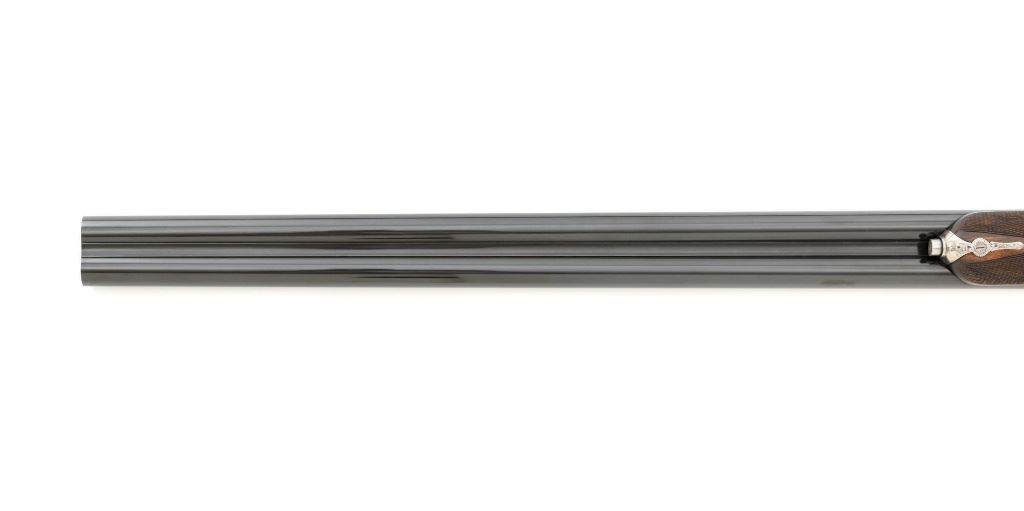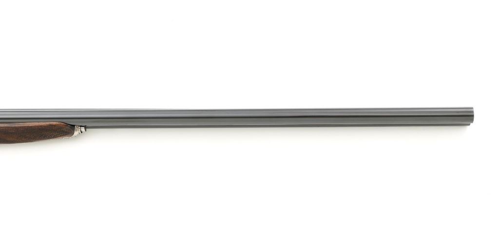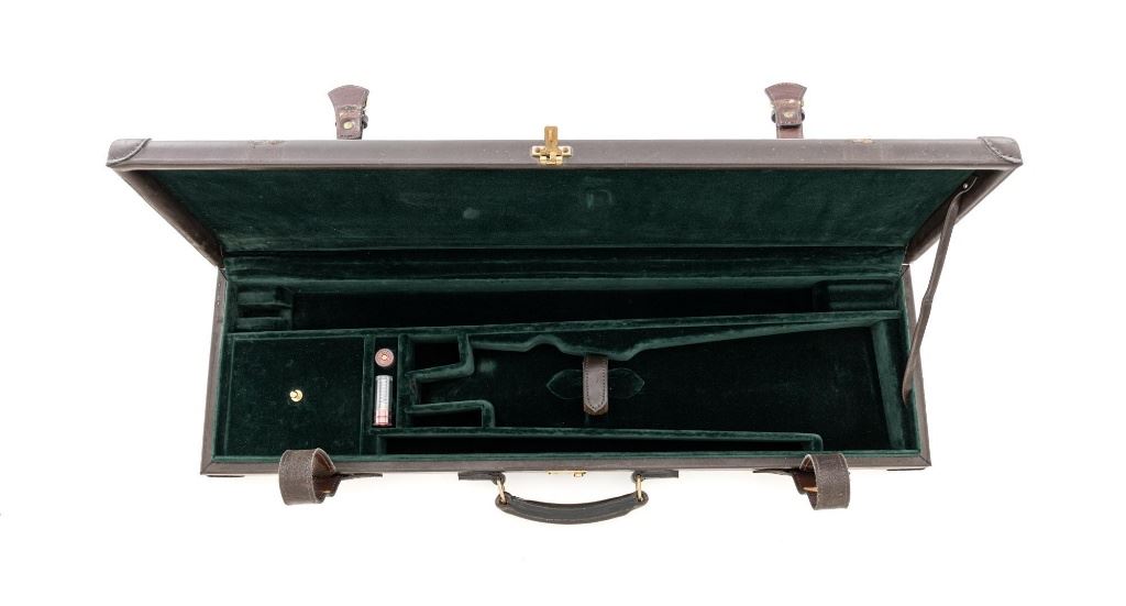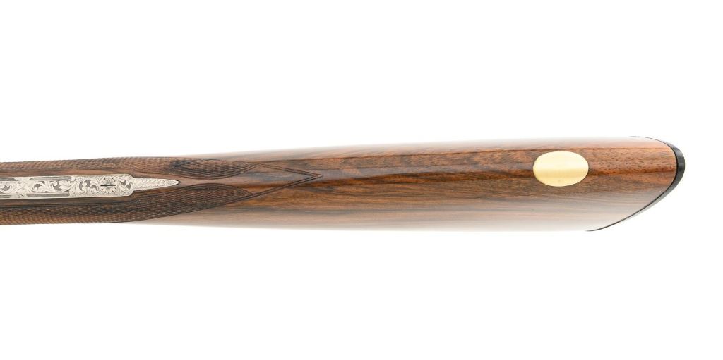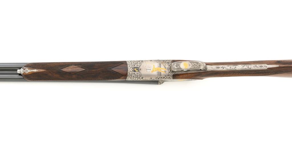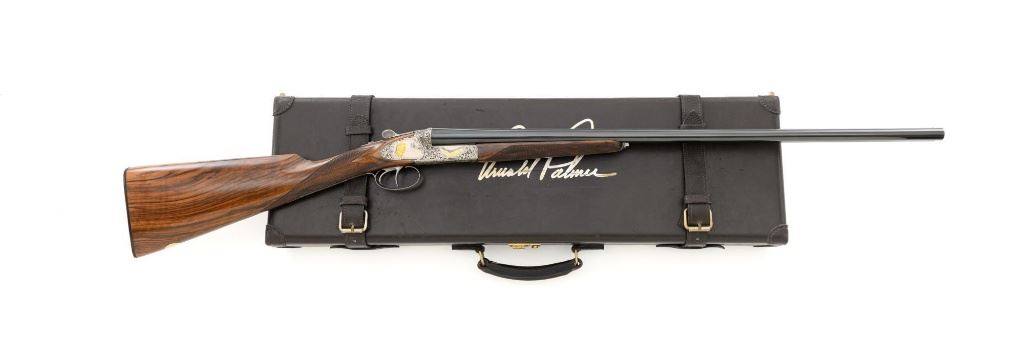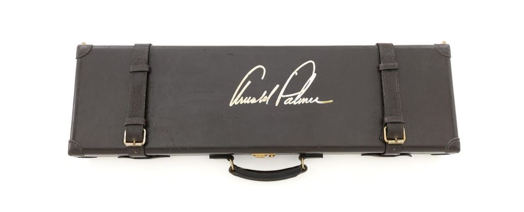 #AP/1 Giacomo Fausti Engraved Renato Telo Arnold Palmer Tribute Side-by-Side Shotgun, #12536, 20 ga., 28" solid rib barrels have 2-3/4" chambers and are choked IC/Full. The boxlock action with sideplates features double underlug lockup, twin triggers, non-automatic safety, and selective ejectors. Receiver is coin finished, decorated with gold inlays, showing Arnold playing golf and shooting, other golf related images, and U.S. Historical Society emblem on the trigger guard, all are surrounded by elaborate scroll floral engraving. Engraving is signed "Fausti G." on one side of the trigger guard and "Creative Art" on the opposite side. All matching visible numbers. Splinter forend and straight grip buttstock are high gloss finished "C" grade walnut, with thorough checkering at 22 LPI. Coin finished nose piece with push-button release and a plain black plastic buttplate. LOP is 14-1/2". Made in 1990 by Renato Tello in Italy for the U.S. Historical Society in Richmond VA. Gun is contained in a heavy brown oak and leather case. A beautifully made shotgun that shows little evidence of possible use. Unfortunately, it was not stored properly, resulting in some frosted surface rust on the left side of the receiver, heaviest on the sideplate. There are also a few mild rust spots on the underside. It would be worth having a professional address these issues, on this otherwise excellent shotgun. Wood with a few light storage marks along bottom of the buttstock. Action functions correctly but is not broken in and a little stiff. Bores are bright. Only 100 of these shotguns were produced in 1990 and all were individually numbered in gold. This example is numbered "AP/1", where the few other examples we have seen are numbered "XX/100". It is also interesting to note that other examples list the barrel length as 26". Making this a possible pre-production before 26" barrel length became standard. Est: $2,000-$4,000. (Modern)
