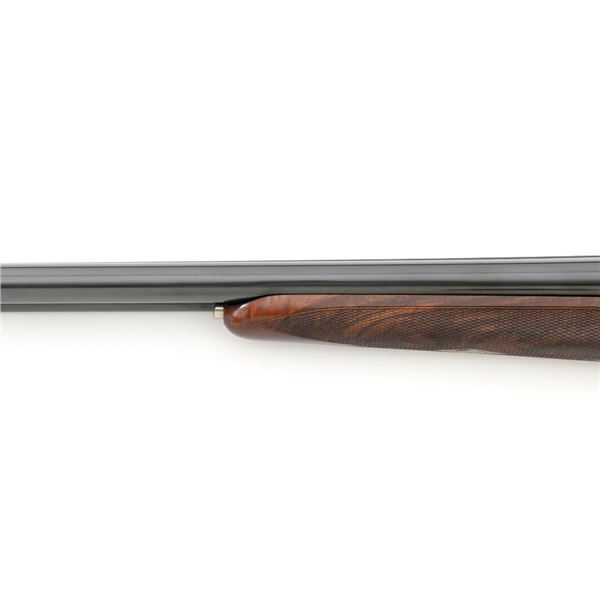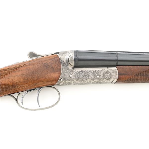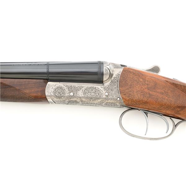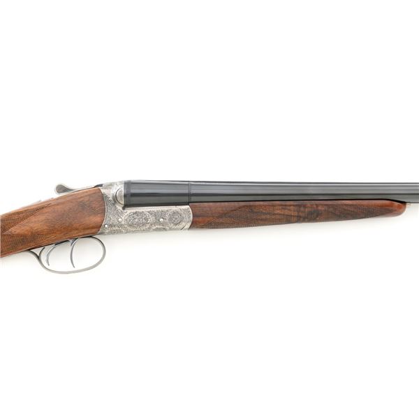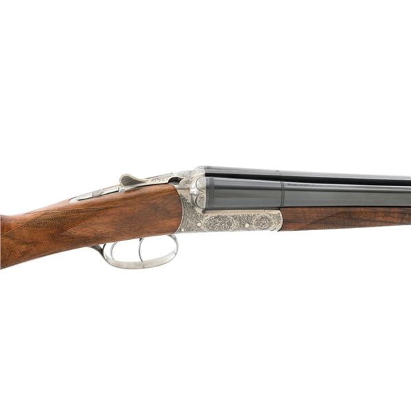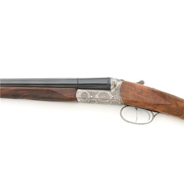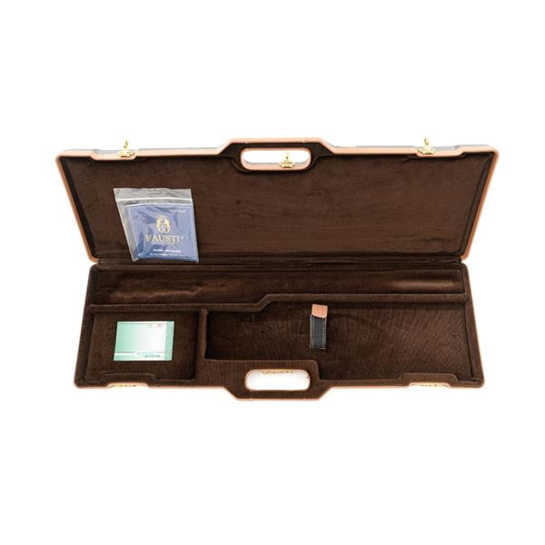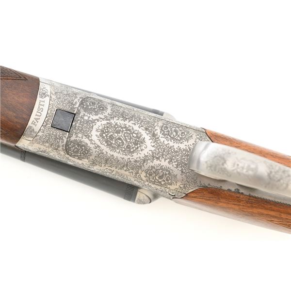 Fausti Stefano Model BC500 Side-by-Side Shotgun, #B45994. 20 ga., 28" solid rib barrels have 3" chambers and are choked IC/MOD. The action uses a dual underlug lockup and features double triggers, non-automatic safety, and selective ejectors. Coin colored receiver, trigger guard, and tangs are nicely roll engraved with rose and scroll patterns, with a Fausti shield on the trigger guard. Splinter forend and straight grip buttstock are satin-finished "C" grade European walnut, with very thorough hand checkering at 22 LPI, a push button forend release, and a wooden buttplate with Fausti crest. Stock dimensions are 15" x 1-1/2" x 2-3/8". Mfgd 2008, by Fausti in Italy for Cabelas INC. Gun sleeves and paperwork are contained in a very nice Negrini hard case. Condition is absolutely excellent with no handling marks to wood and very little wear to the action, which locks tight and functions perfectly. Bores are mirror bright. This gun should preform well for years to come. Est.: $2,000-$2,500. (Modern)