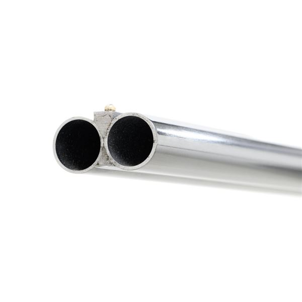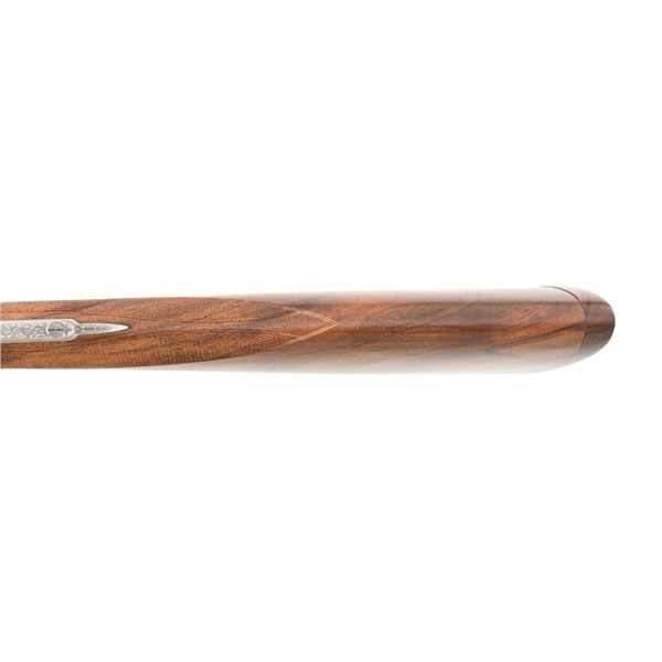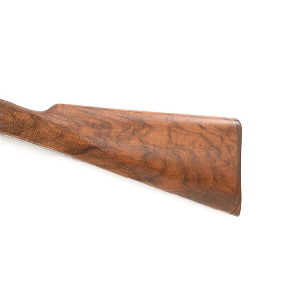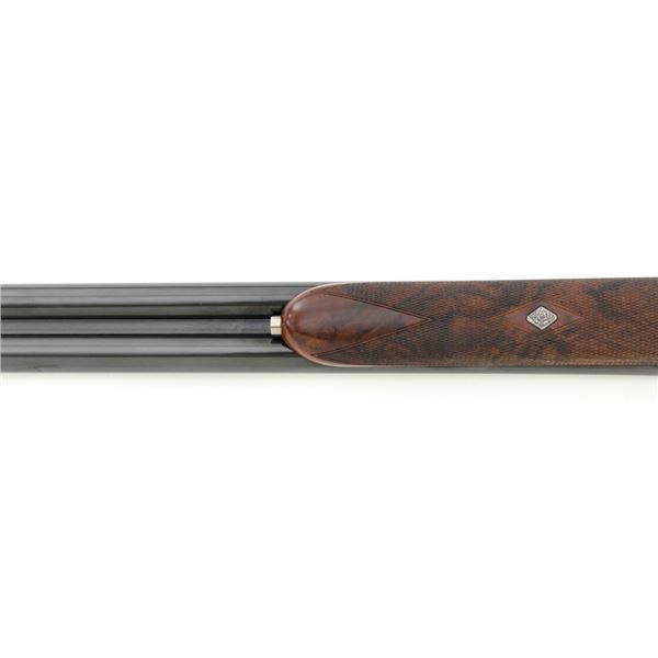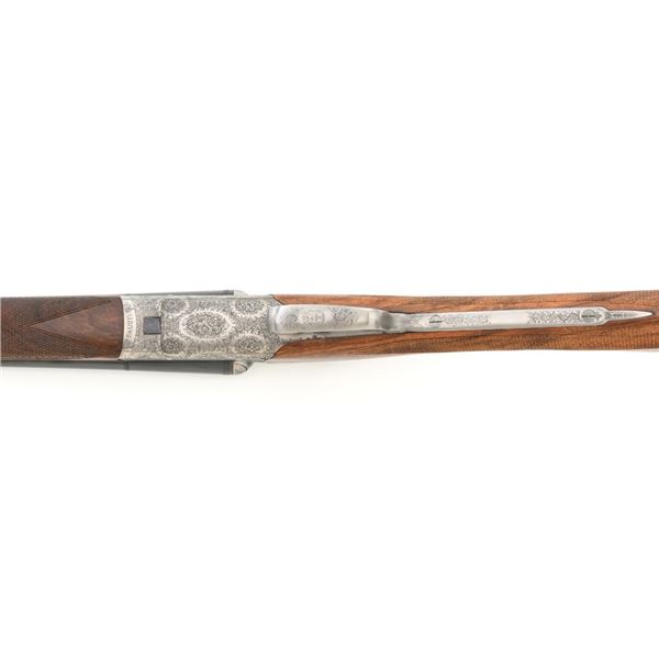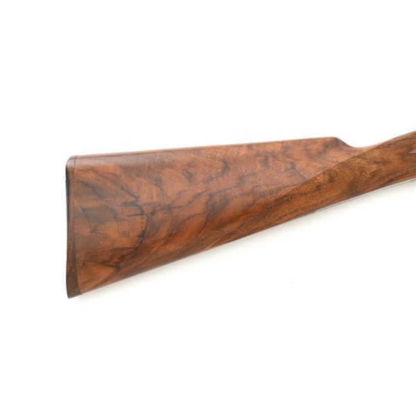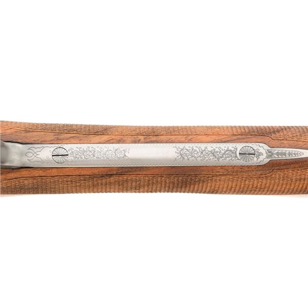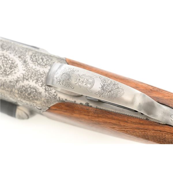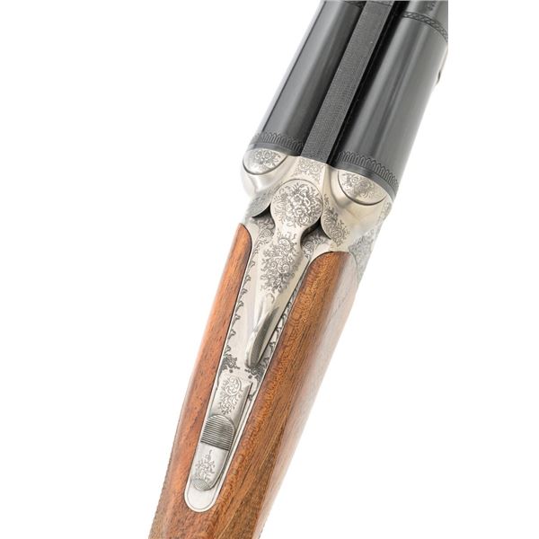 Fausti Stefano Model BC500 Side-by-Side Shotgun, #B45994. 20 ga., 28" solid rib barrels have 3" chambers and are choked IC/MOD. The action uses a dual underlug lockup and features double triggers, non-automatic safety, and selective ejectors. Coin colored receiver, trigger guard, and tangs are nicely roll engraved with rose and scroll patterns, with a Fausti shield on the trigger guard. Splinter forend and straight grip buttstock are satin-finished "C" grade European walnut, with very thorough hand checkering at 22 LPI, a push button forend release, and a wooden buttplate with Fausti crest. Stock dimensions are 15" x 1-1/2" x 2-3/8". Mfgd 2008, by Fausti in Italy for Cabelas INC. Gun sleeves and paperwork are contained in a very nice Negrini hard case. Condition is absolutely excellent with no handling marks to wood and very little wear to the action, which locks tight and functions perfectly. Bores are mirror bright. This gun should preform well for years to come. Est.: $2,000-$2,500. (Modern)