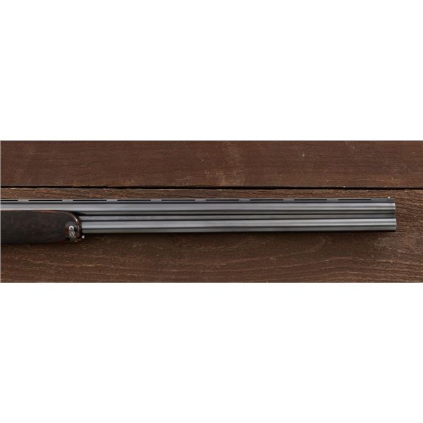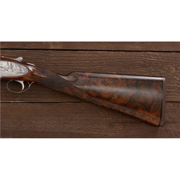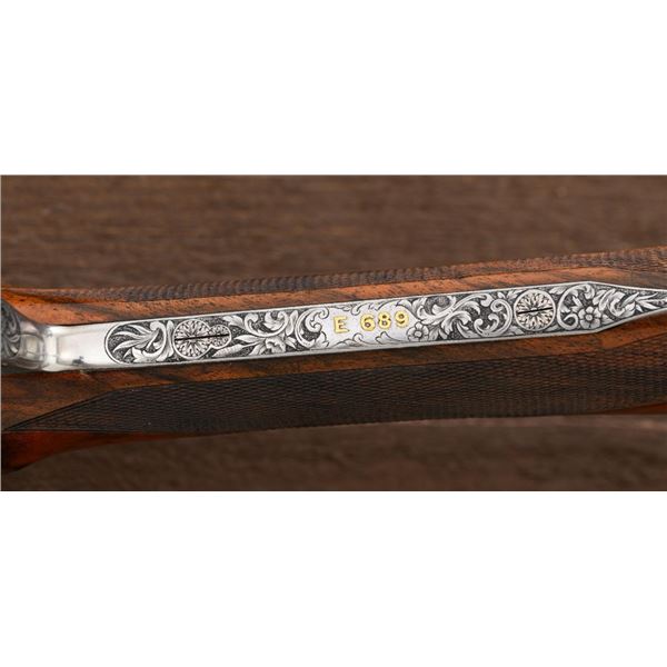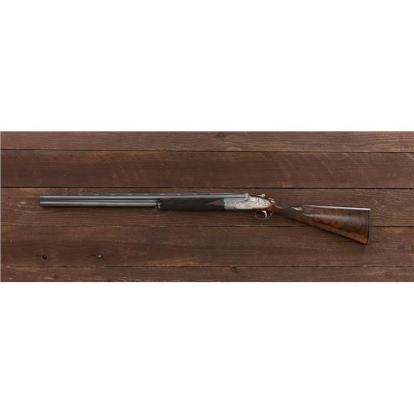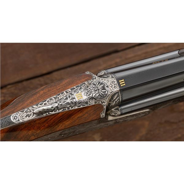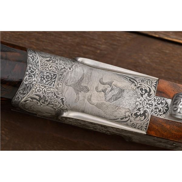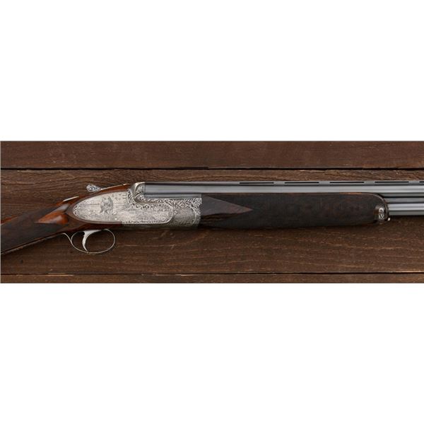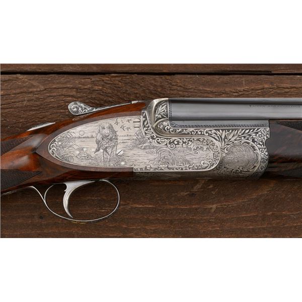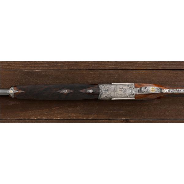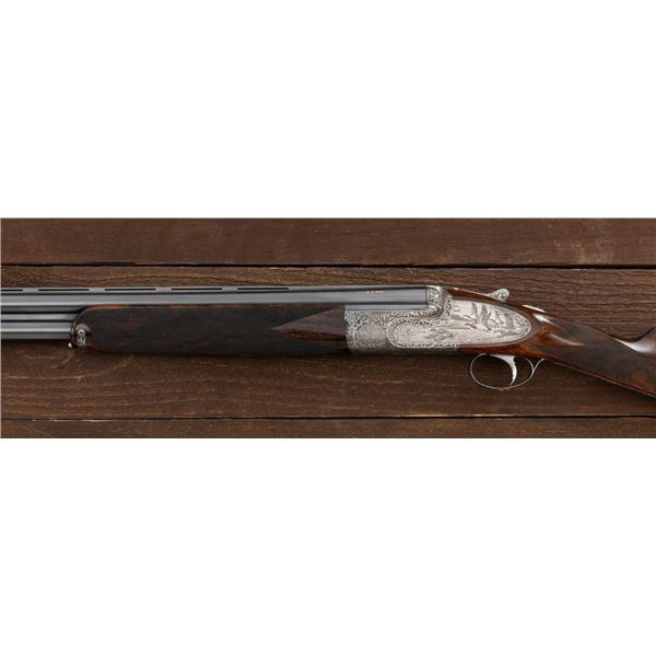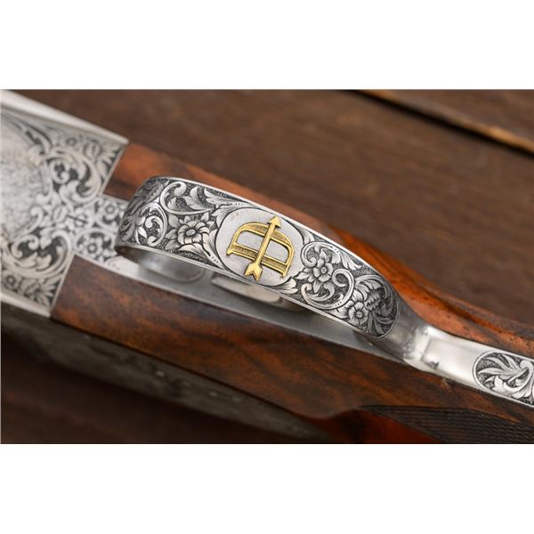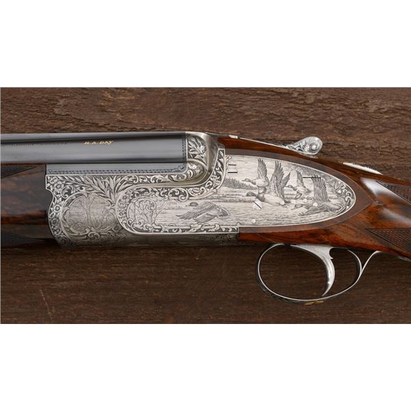 Outstanding IVO Fabbri Best Quality Sporting Grade Over/Under Shotgun with Engraving Signed by Galeazzi, #E689, 12 ga., 28" blued barrels are of the best steel available in Europe, include a tapered ventilated rib that is marked "III" in gold at the rear and top of the opening lever, small "R.A. Day" in gold lettering on the left side, with 3" chambers, and is choked IC/CYL. The true sidelock action features a single non-selective inertia trigger, dual underlug lockup, non-automatic safety, and selective ejectors. The coin finished receiver is beautifully engraved with a small flock of mallards approaching the viewer through the foliage on the left sidelock, a retriever bringing a downed duck back to the blind on the right side, all surrounded with rose and scroll engraving, other engraved views of trees and similar foliage to examine. The bottom of the receiver features a view of four mallards, one ascending, surrounded by tasteful rose and scroll coverage. Top caption features "IVD Fabbri" in text. Blue trigger guard features a gold "D" with an arrow through it for its previous owner. The long lower tang has scrolls with "E689" in gold. Signed by engraver "Galeazzi" on the left side. Full forend and straight grip buttstock are of presentation grade European walnut, oil finished, with complete checkering at 28 LPI, and a "BMR" buttpad. Stock dimensions are 14-1/2" x 1-5/8" x 1-7/8". Manufactured in 1988. Contained in a brown & black Negrini hard case with paper accessories. Condition is excellent, retaining approx. 98% factory blue. Engraving is magnificently done and in superb condition. Wood displays typical signs of field use, with intermittent light marks on the forend and sides of the buttstock, checkering detail is crisp. Action shows little wear, closes very tight and functions correctly; bores are mirror bright. Overall reflecting light use, regular cleaning and maintenance. A truly fantastic sporting arm. Est.: $25,000-$35,000. (Modern)(Property from the Estate of Robert Day)