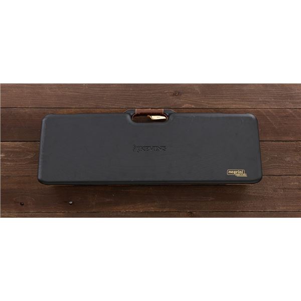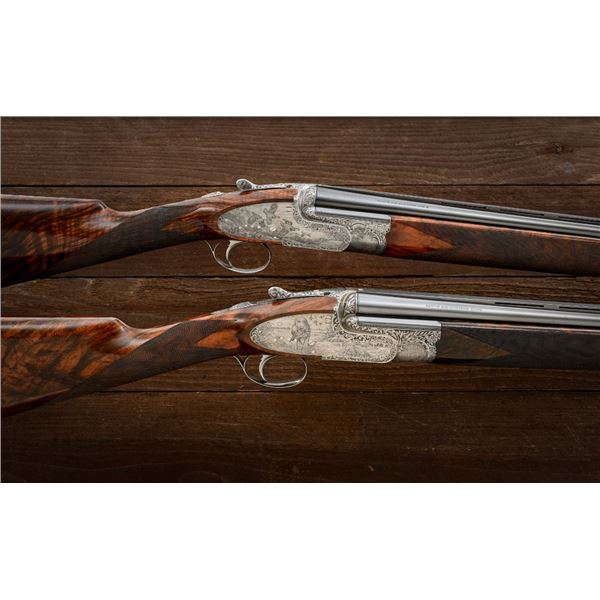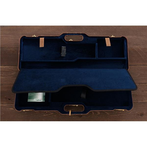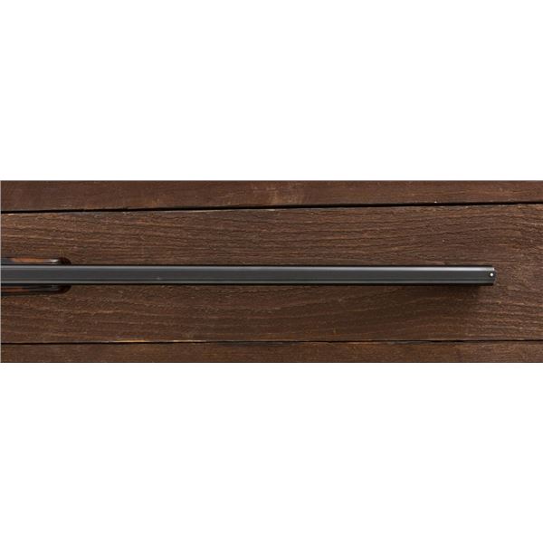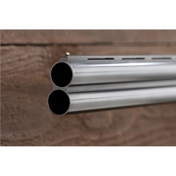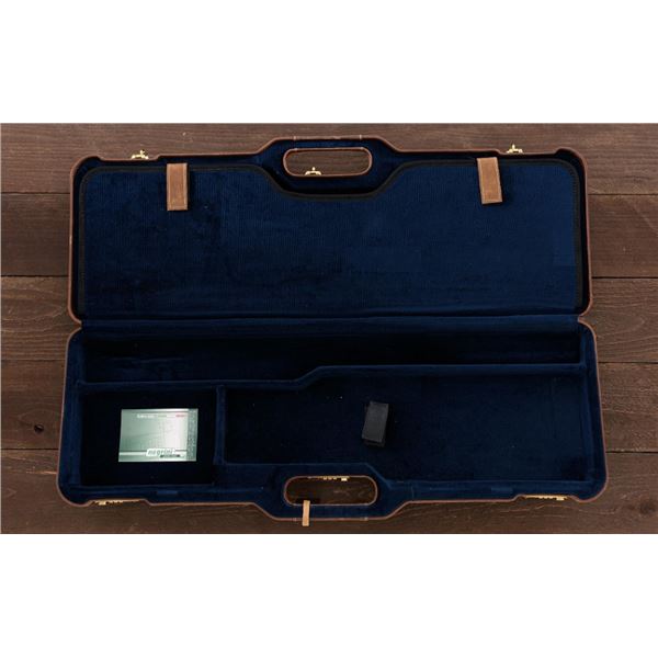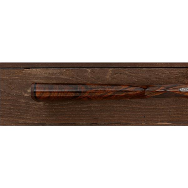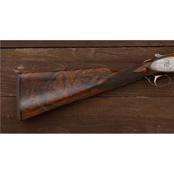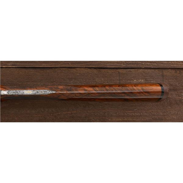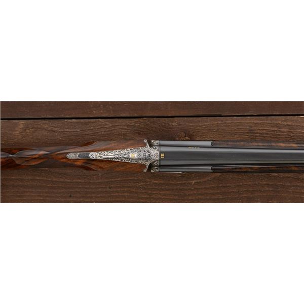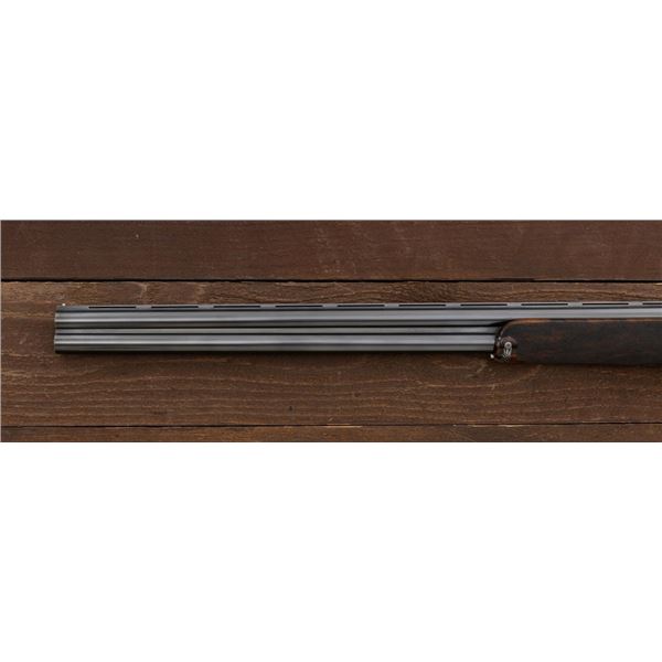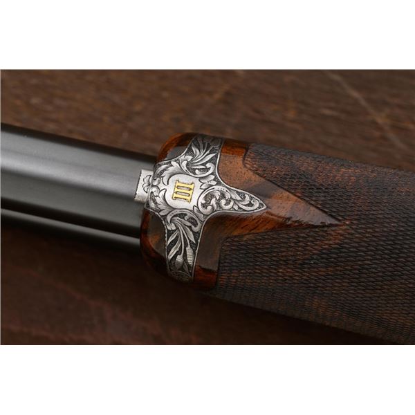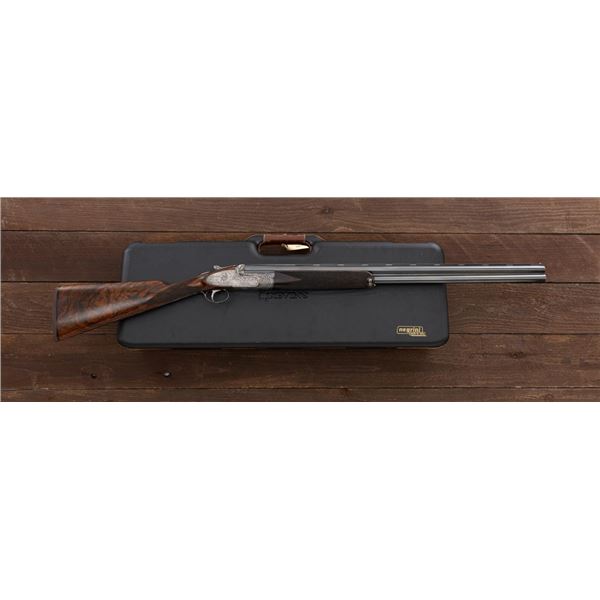 Outstanding IVO Fabbri Best Quality Sporting Grade Over/Under Shotgun with Engraving Signed by Galeazzi, #E689, 12 ga., 28" blued barrels are of the best steel available in Europe, include a tapered ventilated rib that is marked "III" in gold at the rear and top of the opening lever, small "R.A. Day" in gold lettering on the left side, with 3" chambers, and is choked IC/CYL. The true sidelock action features a single non-selective inertia trigger, dual underlug lockup, non-automatic safety, and selective ejectors. The coin finished receiver is beautifully engraved with a small flock of mallards approaching the viewer through the foliage on the left sidelock, a retriever bringing a downed duck back to the blind on the right side, all surrounded with rose and scroll engraving, other engraved views of trees and similar foliage to examine. The bottom of the receiver features a view of four mallards, one ascending, surrounded by tasteful rose and scroll coverage. Top caption features "IVD Fabbri" in text. Blue trigger guard features a gold "D" with an arrow through it for its previous owner. The long lower tang has scrolls with "E689" in gold. Signed by engraver "Galeazzi" on the left side. Full forend and straight grip buttstock are of presentation grade European walnut, oil finished, with complete checkering at 28 LPI, and a "BMR" buttpad. Stock dimensions are 14-1/2" x 1-5/8" x 1-7/8". Manufactured in 1988. Contained in a brown & black Negrini hard case with paper accessories. Condition is excellent, retaining approx. 98% factory blue. Engraving is magnificently done and in superb condition. Wood displays typical signs of field use, with intermittent light marks on the forend and sides of the buttstock, checkering detail is crisp. Action shows little wear, closes very tight and functions correctly; bores are mirror bright. Overall reflecting light use, regular cleaning and maintenance. A truly fantastic sporting arm. Est.: $25,000-$35,000. (Modern)(Property from the Estate of Robert Day)