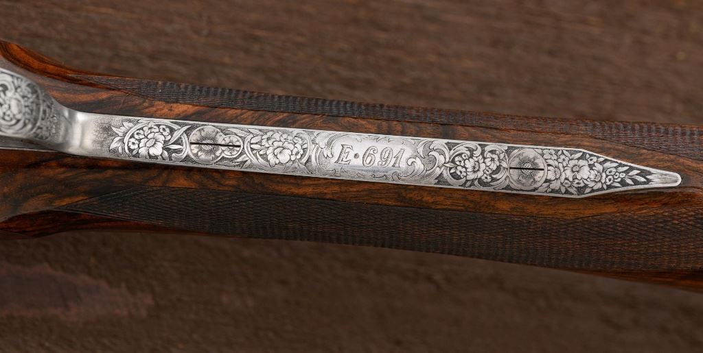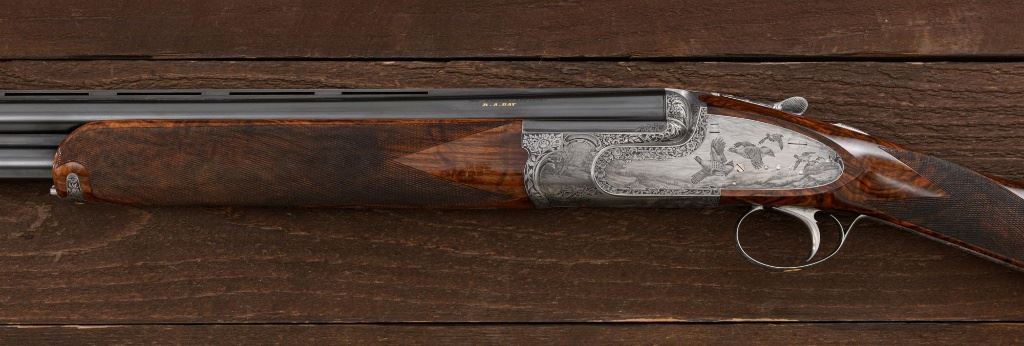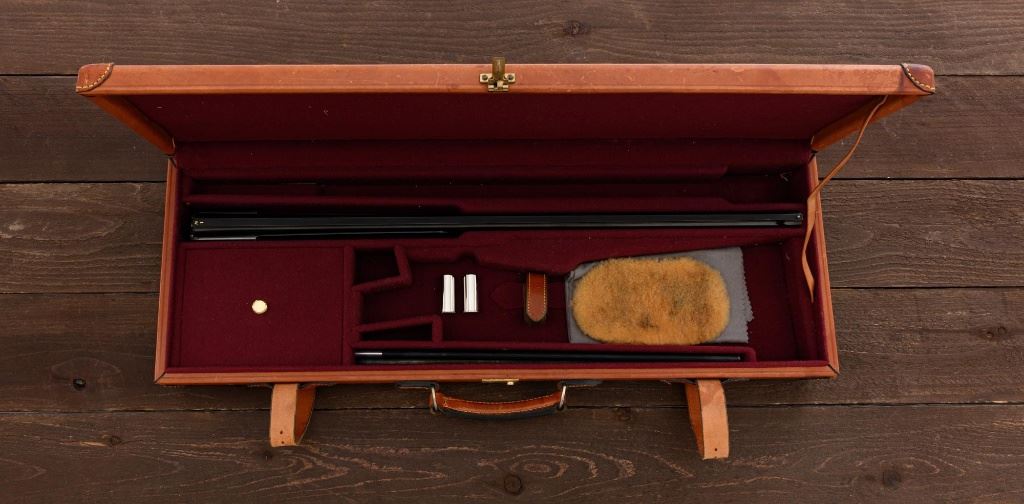 Stunning IVO Fabbri Best Quality Sporting Grade Over/Under Shotgun Two-Barrel Set, Engraving Signed by Galeazzi, #E691, 12 ga., 28" blued barrels are of the best steel available in Europe, first set is marked in gold "1/IV". Barrels have a tapered ventilated rib, 3" chambers, and are choked IC/MOD. Barrels marked "2/IV" in gold are the same except for choked CYL/IC; both sets of barrels with small "R.A. Day" in gold lettering on the left side and matching serial numbers. There is a gold "IV" on the opening lever and forend. The true sidelock action features a dual underlug lockup, single non-selective inertia trigger, non-automatic safety, and selective ejectors. The coin finished receiver is beautifully engraved with a small flock of partridge in flight, right-left on the left hand lock, and a similar flock flying left-right on the right side. Both sides have abundant game scenes and scroll engraving that surround the birds. Bottom of the receiver features a pheasant flushing, again with rose and scroll surrounding, gold "Fabbri" in prominent caption, and signed "Galeazzi". Blue trigger guard features a gold "D" with an arrow through it, for its previous owner. The very full forend and straight grip buttstock are of lightly-finished presentation grade European walnut, with complete checkering at 28 LPI, and a Fabbri buttpad. Stock dimensions are 14-3/8" x 1-5/8" x 1-7/8". Manufactured in 1989. Contained in a heavy brown leather hard case, with paper accessories. Condition is excellent, with almost no handling marks to the metal, and little wear to the action, which closes very tight and functions correctly. Wood displays typical signs of field use, with several light marks at rear of the forend, and intermittent light marks along the top and bottom edge of the buttstock, checkering detail is crisp. Bores are mirror bright. Overall reflecting light use, regular cleaning and maintenance. A spectacular two-barrel set. Est.: $30,000-$45,000. (Modern)(Property from the Estate of Robert Day)