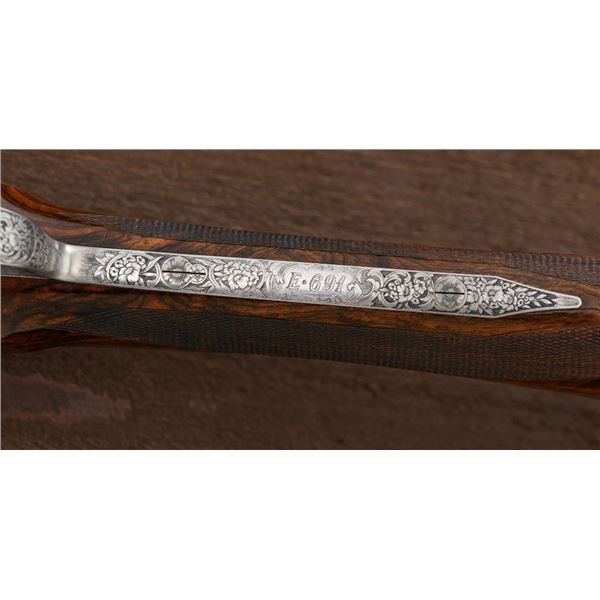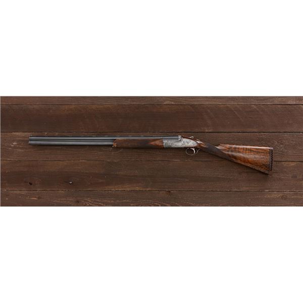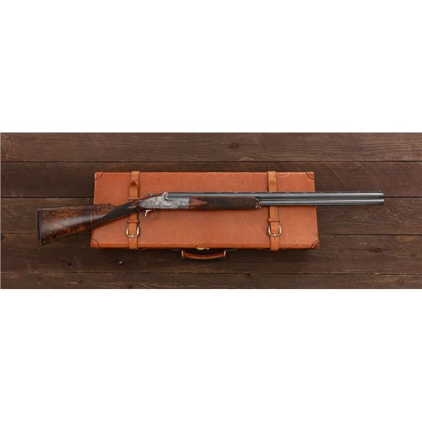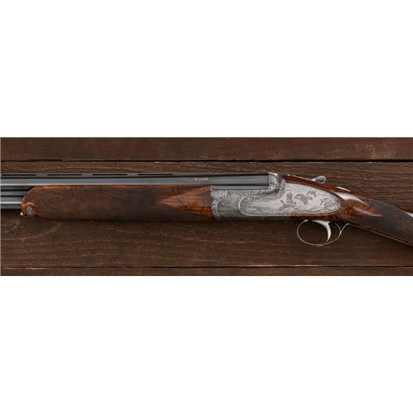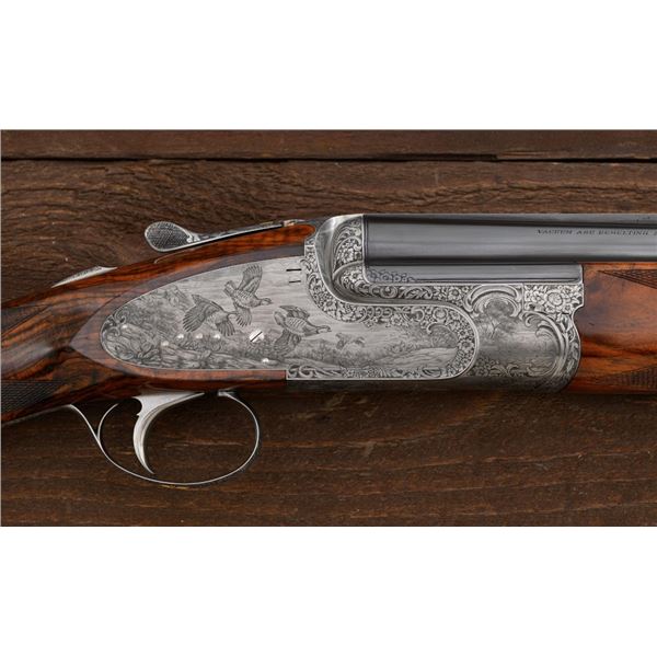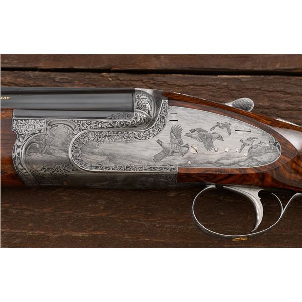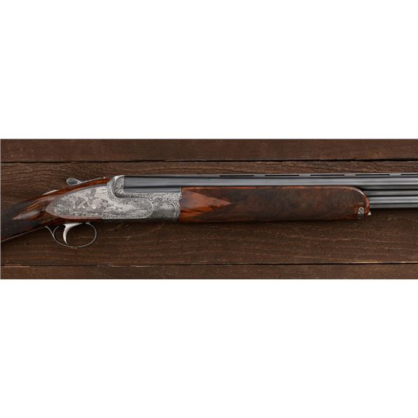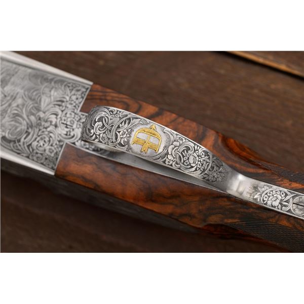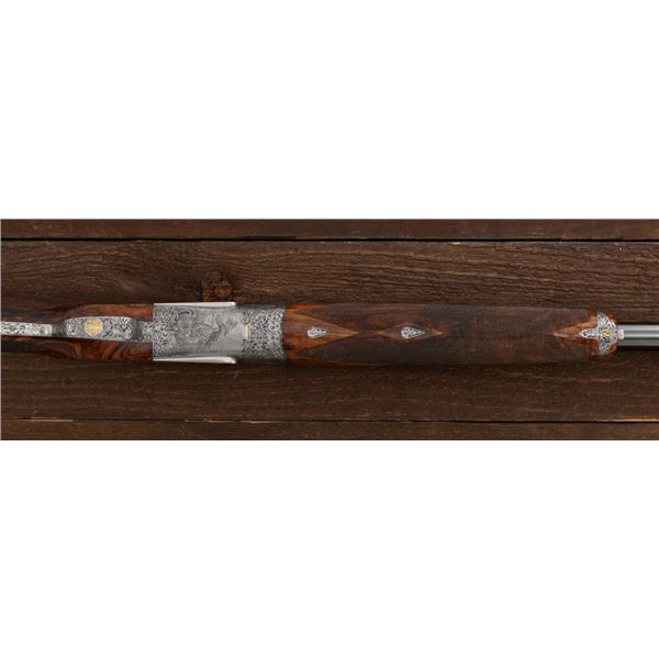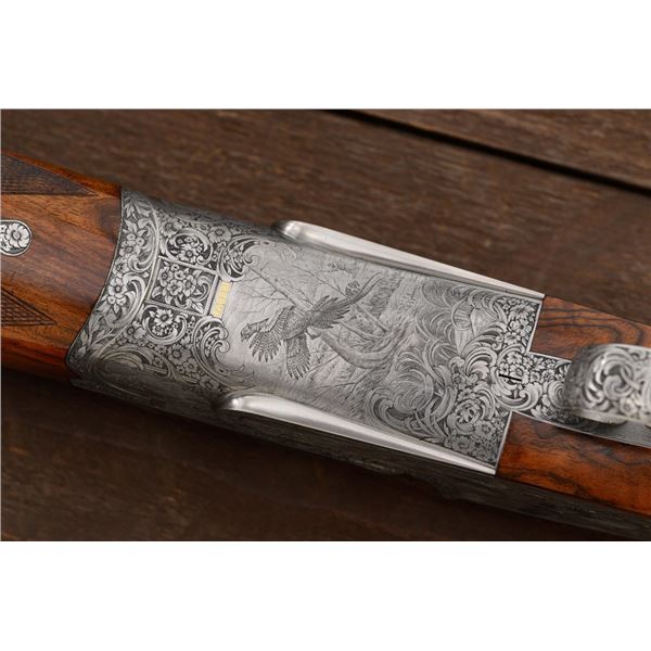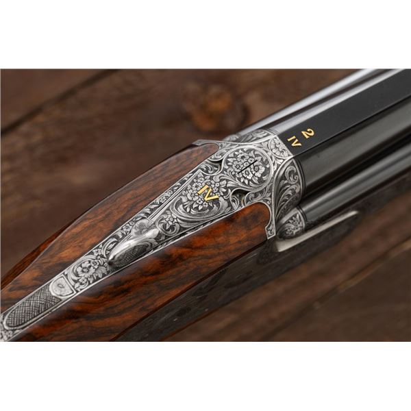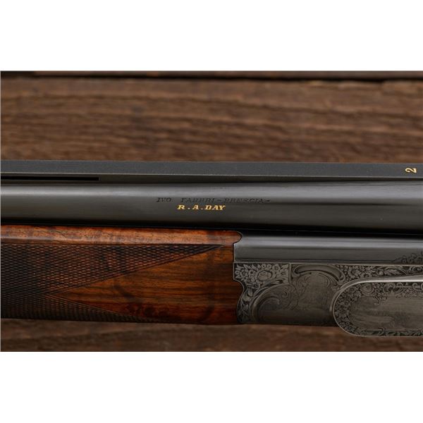 Stunning IVO Fabbri Best Quality Sporting Grade Over/Under Shotgun Two-Barrel Set, Engraving Signed by Galeazzi, #E691, 12 ga., 28" blued barrels are of the best steel available in Europe, first set is marked in gold "1/IV". Barrels have a tapered ventilated rib, 3" chambers, and are choked IC/MOD. Barrels marked "2/IV" in gold are the same except for choked CYL/IC; both sets of barrels with small "R.A. Day" in gold lettering on the left side and matching serial numbers. There is a gold "IV" on the opening lever and forend. The true sidelock action features a dual underlug lockup, single non-selective inertia trigger, non-automatic safety, and selective ejectors. The coin finished receiver is beautifully engraved with a small flock of partridge in flight, right-left on the left hand lock, and a similar flock flying left-right on the right side. Both sides have abundant game scenes and scroll engraving that surround the birds. Bottom of the receiver features a pheasant flushing, again with rose and scroll surrounding, gold "Fabbri" in prominent caption, and signed "Galeazzi". Blue trigger guard features a gold "D" with an arrow through it, for its previous owner. The very full forend and straight grip buttstock are of lightly-finished presentation grade European walnut, with complete checkering at 28 LPI, and a Fabbri buttpad. Stock dimensions are 14-3/8" x 1-5/8" x 1-7/8". Manufactured in 1989. Contained in a heavy brown leather hard case, with paper accessories. Condition is excellent, with almost no handling marks to the metal, and little wear to the action, which closes very tight and functions correctly. Wood displays typical signs of field use, with several light marks at rear of the forend, and intermittent light marks along the top and bottom edge of the buttstock, checkering detail is crisp. Bores are mirror bright. Overall reflecting light use, regular cleaning and maintenance. A spectacular two-barrel set. Est.: $30,000-$45,000. (Modern)(Property from the Estate of Robert Day)