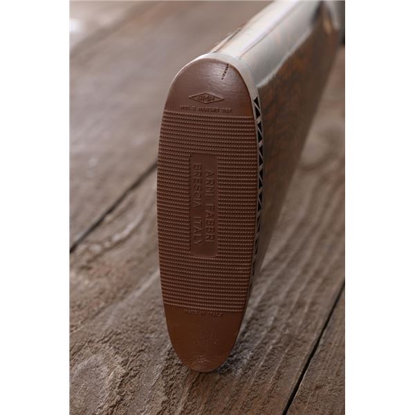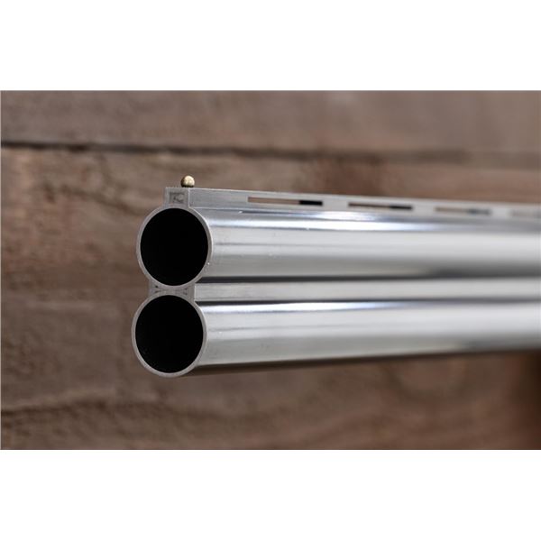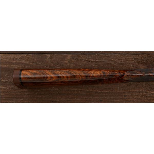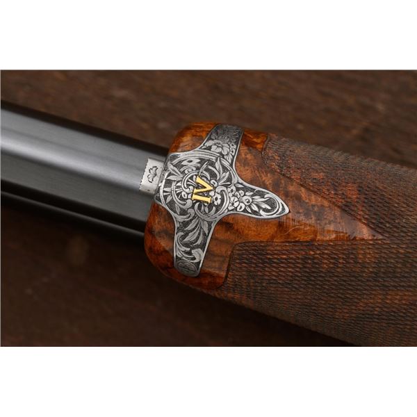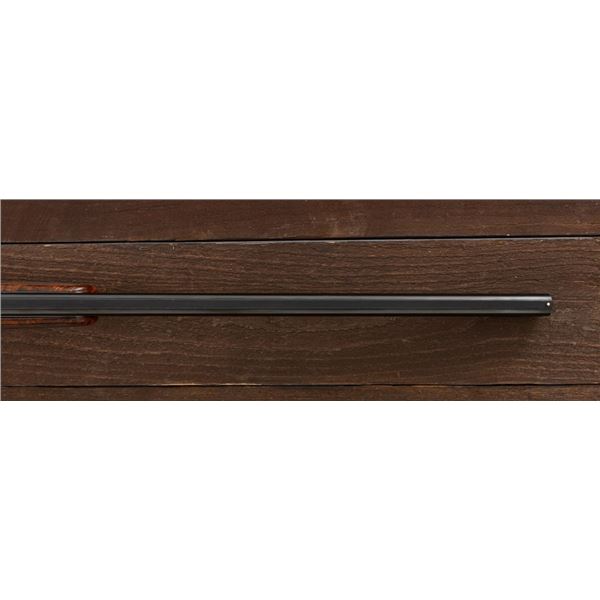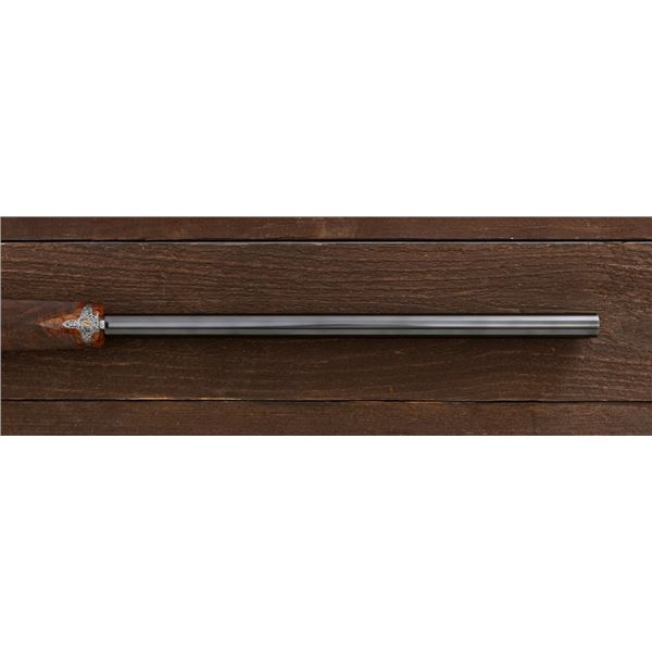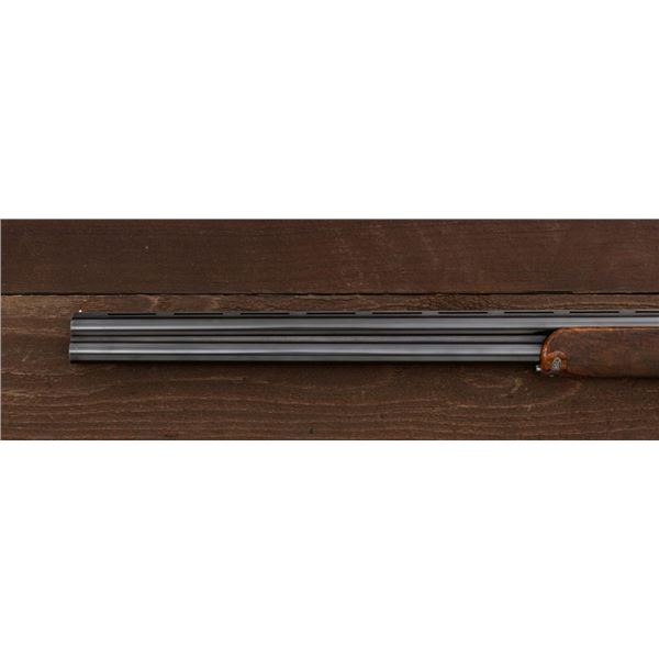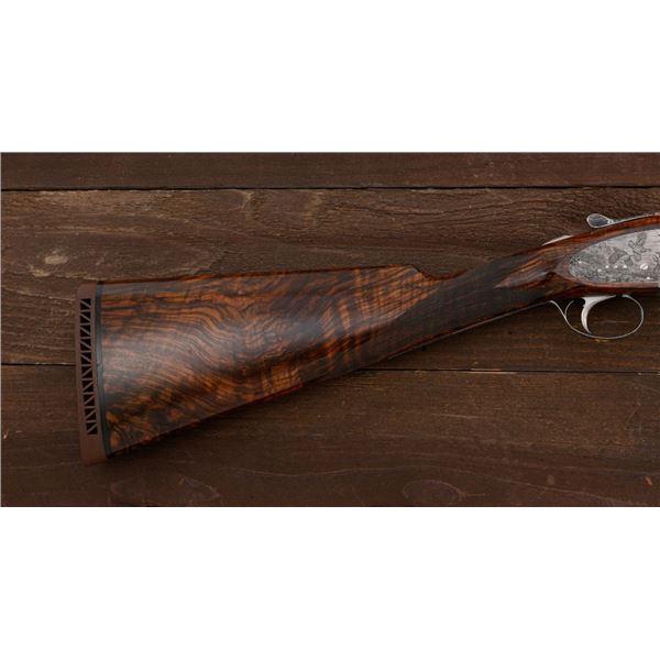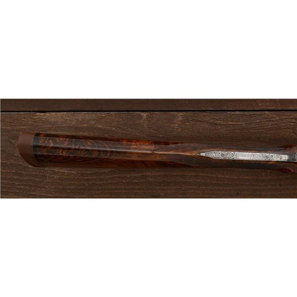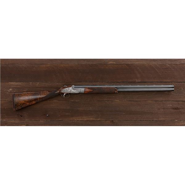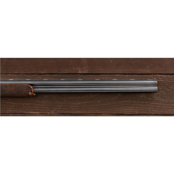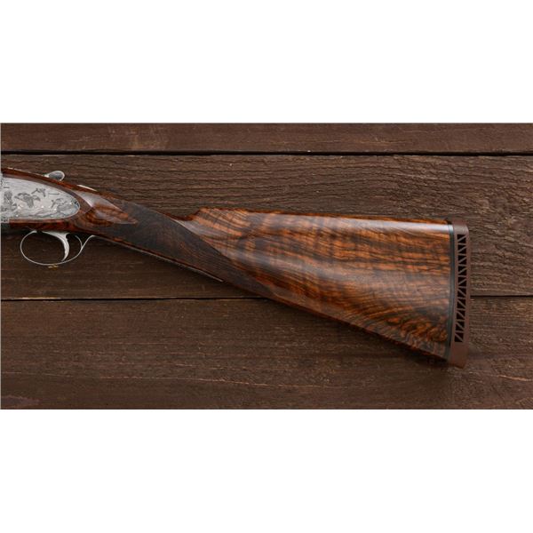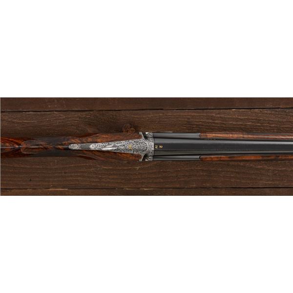 Stunning IVO Fabbri Best Quality Sporting Grade Over/Under Shotgun Two-Barrel Set, Engraving Signed by Galeazzi, #E691, 12 ga., 28" blued barrels are of the best steel available in Europe, first set is marked in gold "1/IV". Barrels have a tapered ventilated rib, 3" chambers, and are choked IC/MOD. Barrels marked "2/IV" in gold are the same except for choked CYL/IC; both sets of barrels with small "R.A. Day" in gold lettering on the left side and matching serial numbers. There is a gold "IV" on the opening lever and forend. The true sidelock action features a dual underlug lockup, single non-selective inertia trigger, non-automatic safety, and selective ejectors. The coin finished receiver is beautifully engraved with a small flock of partridge in flight, right-left on the left hand lock, and a similar flock flying left-right on the right side. Both sides have abundant game scenes and scroll engraving that surround the birds. Bottom of the receiver features a pheasant flushing, again with rose and scroll surrounding, gold "Fabbri" in prominent caption, and signed "Galeazzi". Blue trigger guard features a gold "D" with an arrow through it, for its previous owner. The very full forend and straight grip buttstock are of lightly-finished presentation grade European walnut, with complete checkering at 28 LPI, and a Fabbri buttpad. Stock dimensions are 14-3/8" x 1-5/8" x 1-7/8". Manufactured in 1989. Contained in a heavy brown leather hard case, with paper accessories. Condition is excellent, with almost no handling marks to the metal, and little wear to the action, which closes very tight and functions correctly. Wood displays typical signs of field use, with several light marks at rear of the forend, and intermittent light marks along the top and bottom edge of the buttstock, checkering detail is crisp. Bores are mirror bright. Overall reflecting light use, regular cleaning and maintenance. A spectacular two-barrel set. Est.: $30,000-$45,000. (Modern)(Property from the Estate of Robert Day)