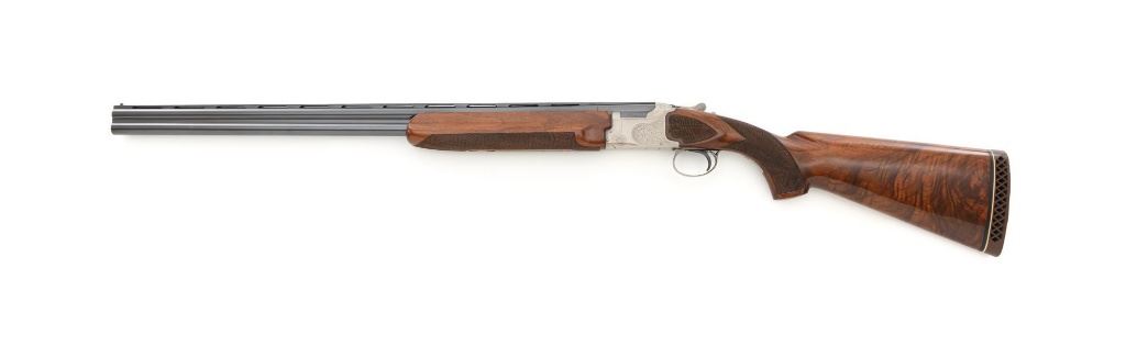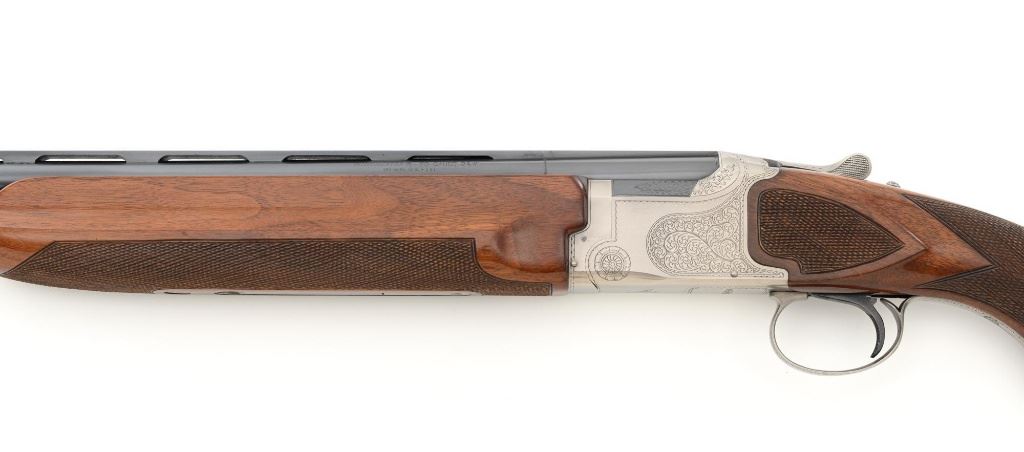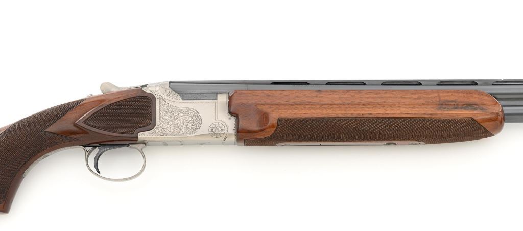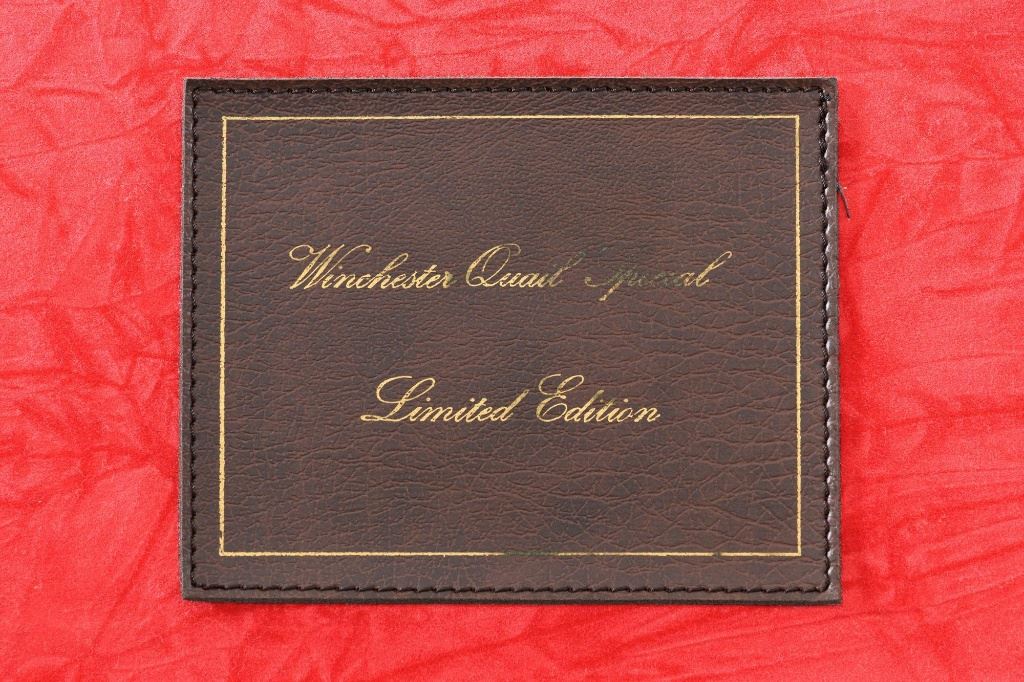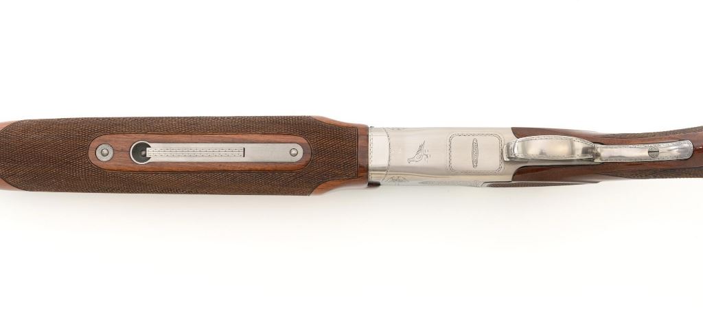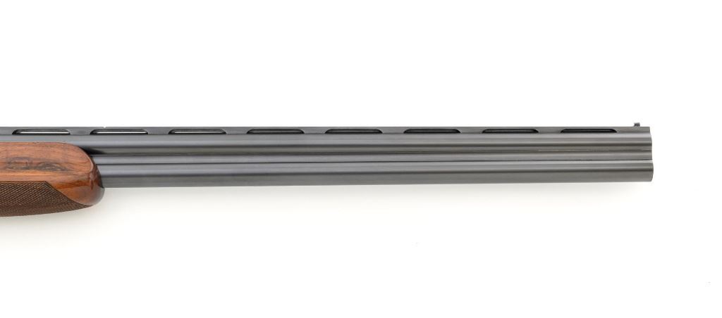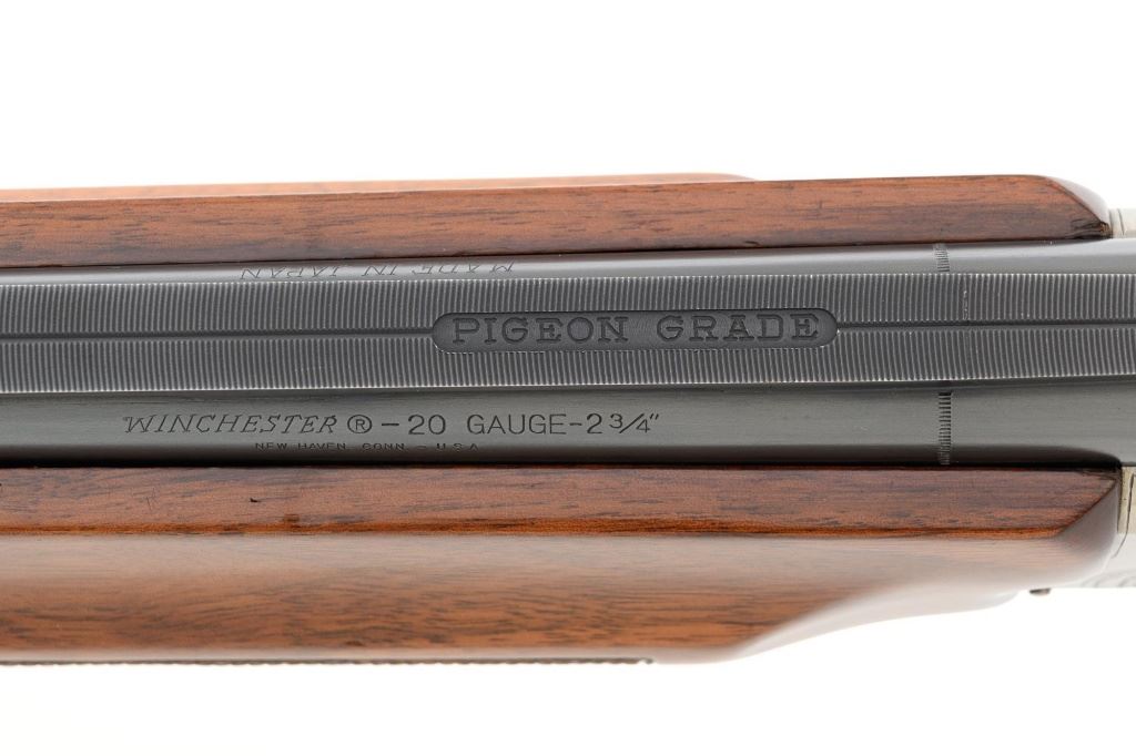 Winchester Model 101 Pigeon Grade Over/Under Skeet Shotgun, #PK264875, 20 ga., 27" vent rib barrels have target sights, 2-3/4" chambers, and are choked SKT/SKT. The 101 action uses a single underlug lockup and features a single selective inertia trigger, non-automatic safety, and selective ejectors. Coin finished receiver has fine scroll engraving, including a standing pigeon on the floorplate. Beavertail forend and pistol grip buttstock are high-gloss "C" grade walnut, with finger groove forend, thorough checkering at 20 LPI, and a Pachmayr "White-Line" recoil pad. Stock dimensions are 15" x 1-5/8" x 2-1/2". Mfgd approx. 1985 by Nikko in Japan for Winchester. Gun is contained in a canvas hard case, with leather tag "Winchester Quail Special Limited Edition". Condition is near excellent, with few handling marks to the wood and nominal wear to the action, which closes tight and functions correctly; bores are bright. Est.: $1,200-$1,500. (Modern)