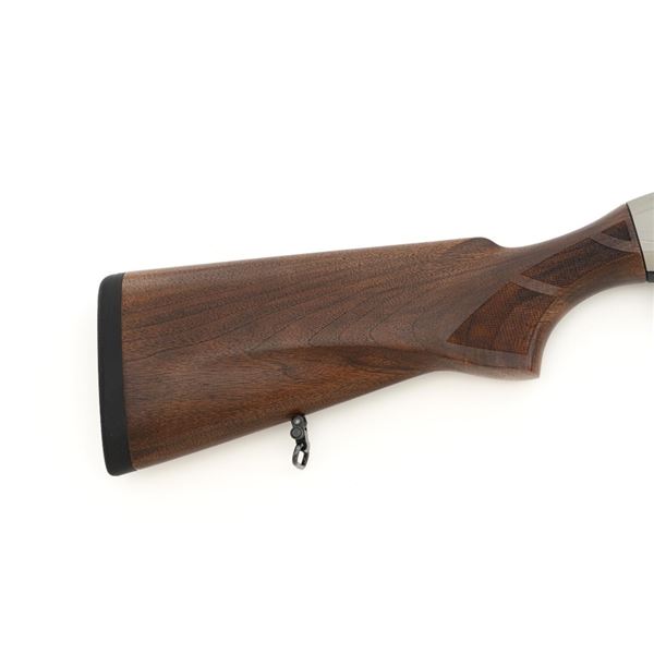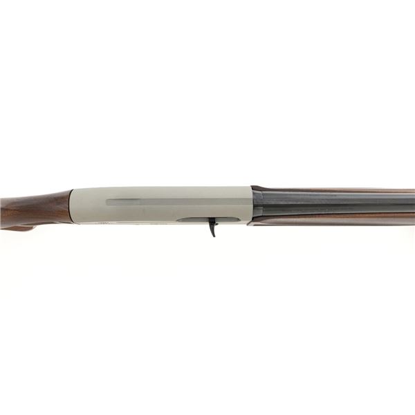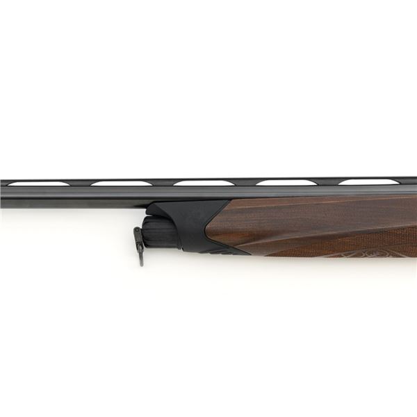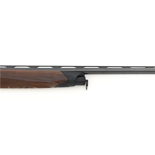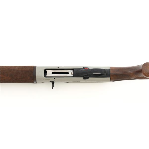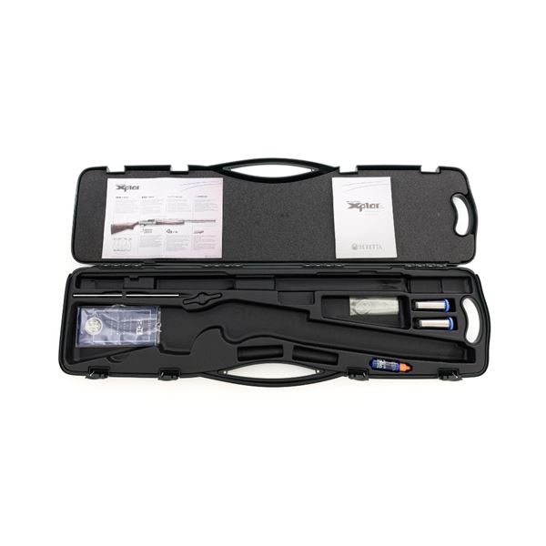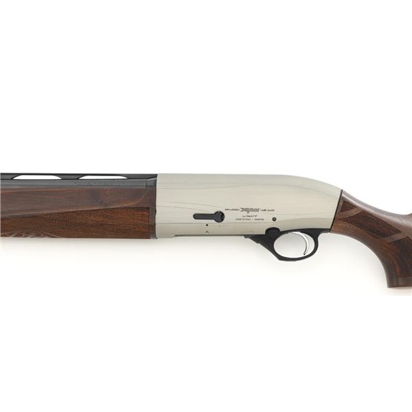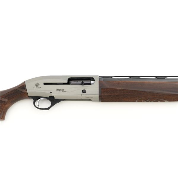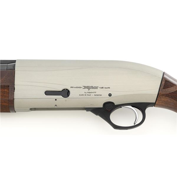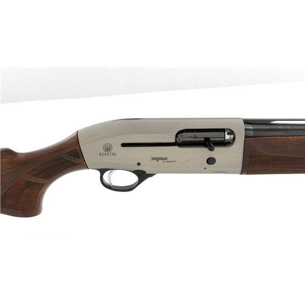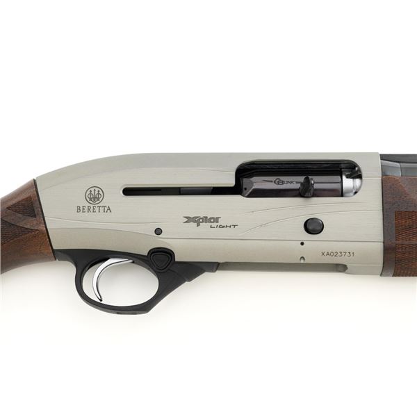 Beretta Xplor Light Model Semi-Automatic Shotgun, #XA023731, 12 ga., 28" narrow vent rib barrel has a 3" chamber and is fitted for Optima choke tubes (Three provided: CYL, M, Full). The action is an improved A400, with a short recoil gas operated cycle. Receiver is dull gray alloy, with limited Beretta logos lasered onto the surface. Finger groove forend and full pistol grip buttstock are satin finished "B" grade walnut with clever checkering patterns for best shooter control. Stock dimensions are 14-5/8" x 1-1/2" x 2-1/2". Mfgd 2011 by Beretta in Italy. Gun and all paperwork, parts, accessories, and tools are contained in a green plastic hard case. The condition is near new, showing little use. Wood has almost no handling marks visible, and the action looks new. Action locks up tight and bores are mirror bright. This gun should see its user enjoying many bird hunting trips successfully. Est.: $1,000-$1,250. (Modern)