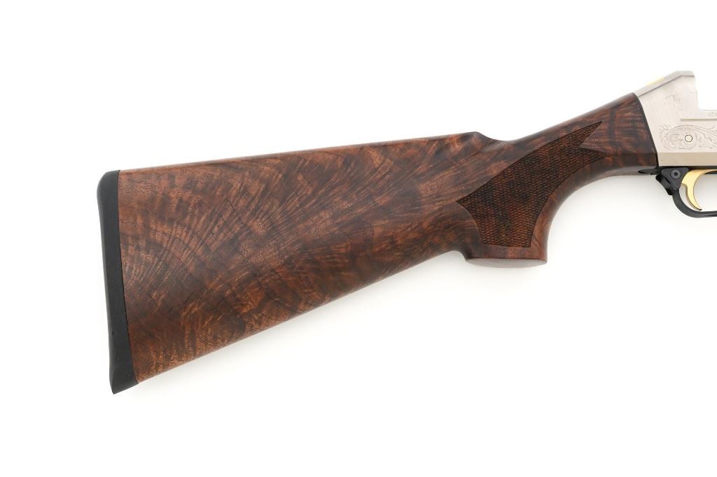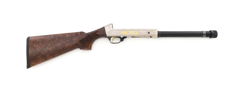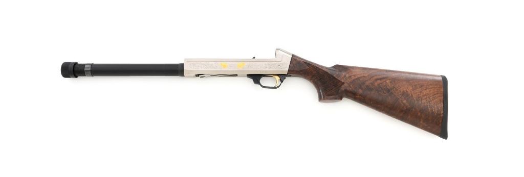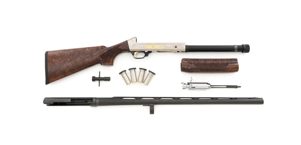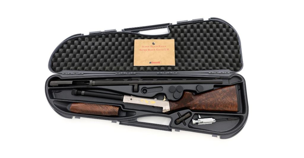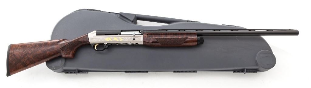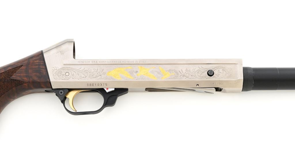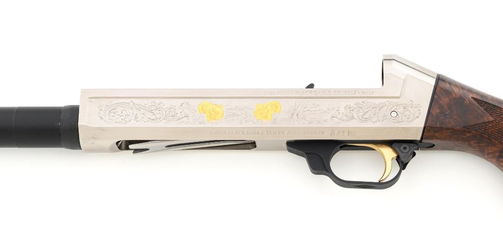 Benelli Super Black Eagle Tenth Anniversary Semi-Automatic Shotgun, #SBE10375. 12ga., 26" vent rib barrel has target beads, 3-1/2" chamber, and is fitted for Benelli choke tubes (5 provided). The action is an updated Monte Feltro design, with an upper steel/lower alloy receiver. Receiver has two turkeys and three geese as gold inlays, surrounded by very nice hand-engraved scrolls. Bolt is nickel-plated. Forend and pistol grip buttstock are matte finished "C" grade dark walnut, with full checkering at 18 LPI. Stock dimensions are 14-1/2" x 1-1/2" x 2-1/4". Mfgd 2002, in Italy by Benelli. Gun and all chokes, tools, and paperwork are contained in a solid gray hard case with Benelli markings.Condition is excellent, appearing little used. Wood is like new. Excellent action and mirror bright bore.It is one of only 500 made in 2002. Est.: $1,800-$2,400. (Modern)