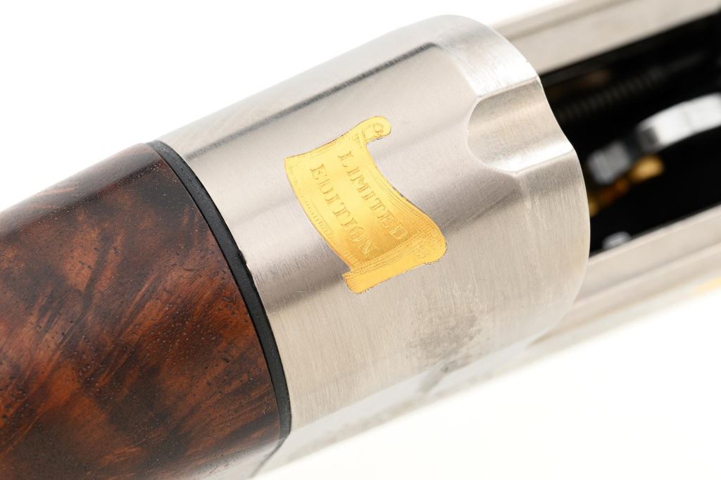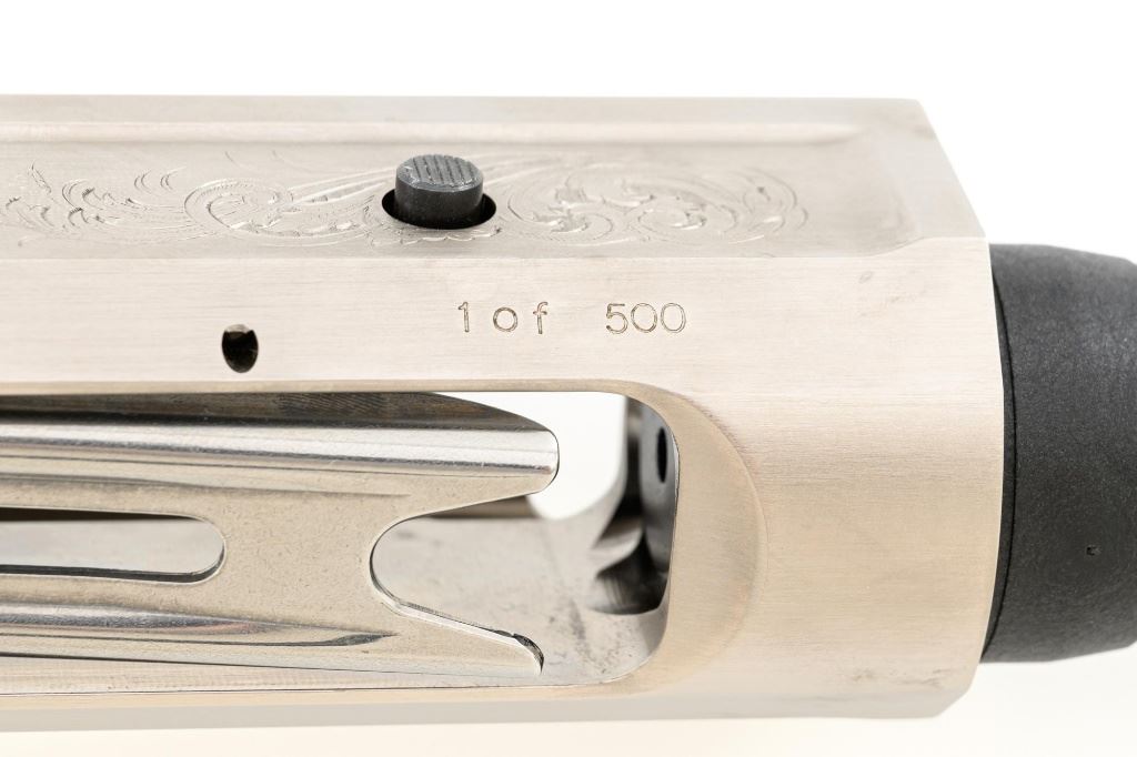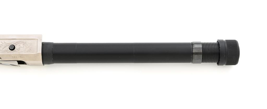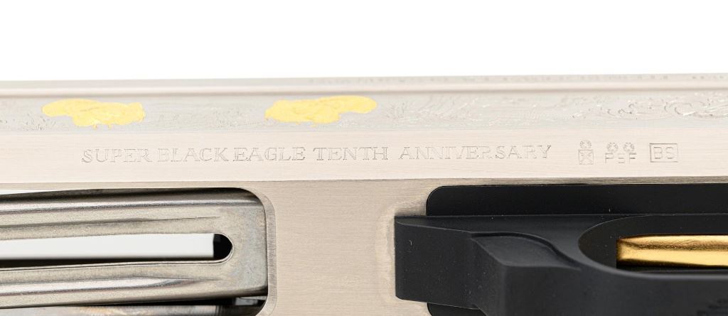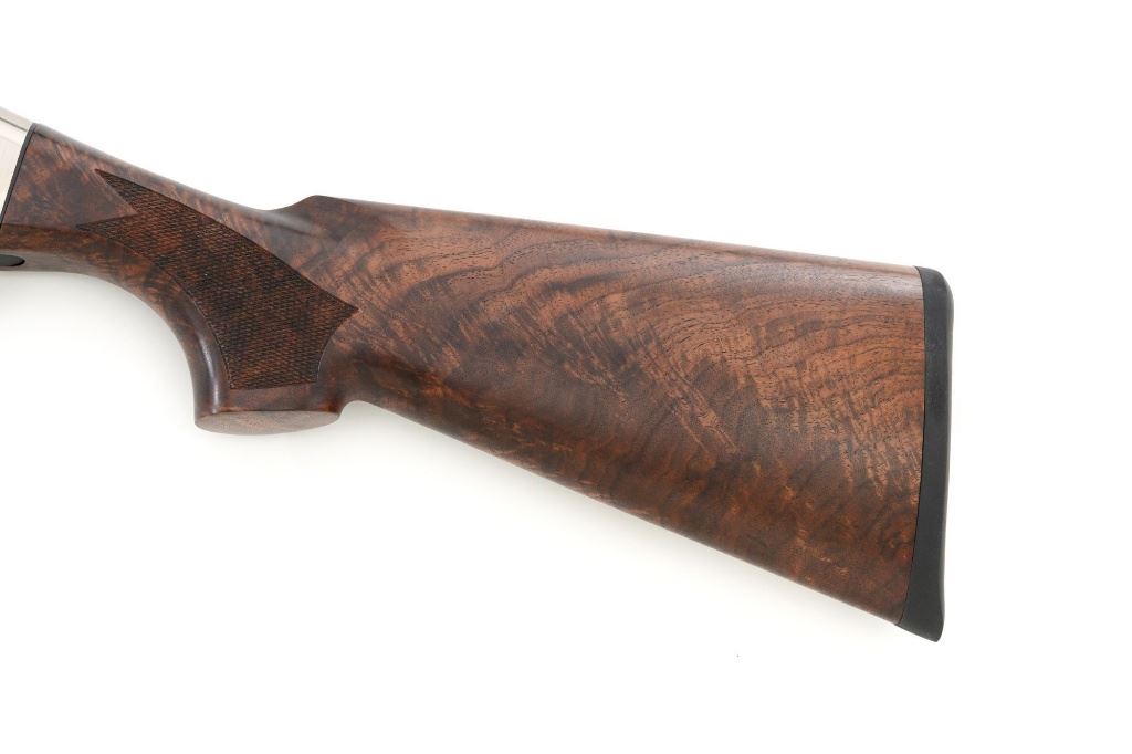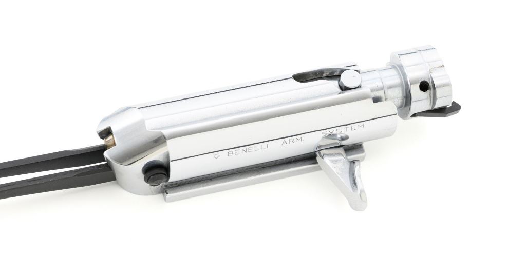 Benelli Super Black Eagle Tenth Anniversary Semi-Automatic Shotgun, #SBE10375. 12ga., 26" vent rib barrel has target beads, 3-1/2" chamber, and is fitted for Benelli choke tubes (5 provided). The action is an updated Monte Feltro design, with an upper steel/lower alloy receiver. Receiver has two turkeys and three geese as gold inlays, surrounded by very nice hand-engraved scrolls. Bolt is nickel-plated. Forend and pistol grip buttstock are matte finished "C" grade dark walnut, with full checkering at 18 LPI. Stock dimensions are 14-1/2" x 1-1/2" x 2-1/4". Mfgd 2002, in Italy by Benelli. Gun and all chokes, tools, and paperwork are contained in a solid gray hard case with Benelli markings.Condition is excellent, appearing little used. Wood is like new. Excellent action and mirror bright bore.It is one of only 500 made in 2002. Est.: $1,800-$2,400. (Modern)