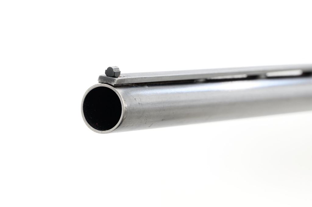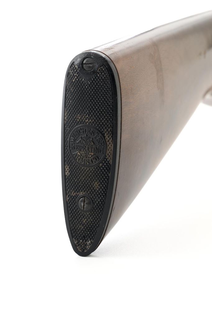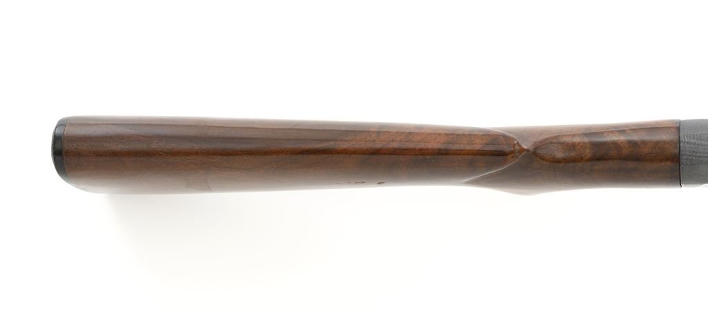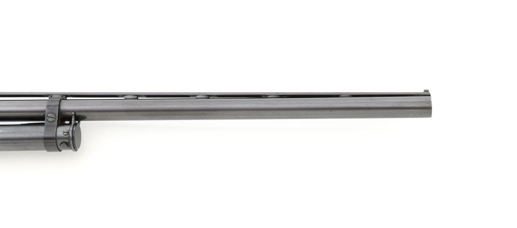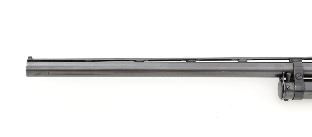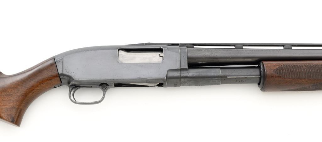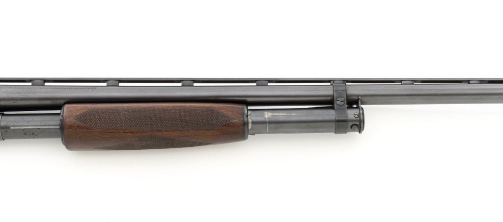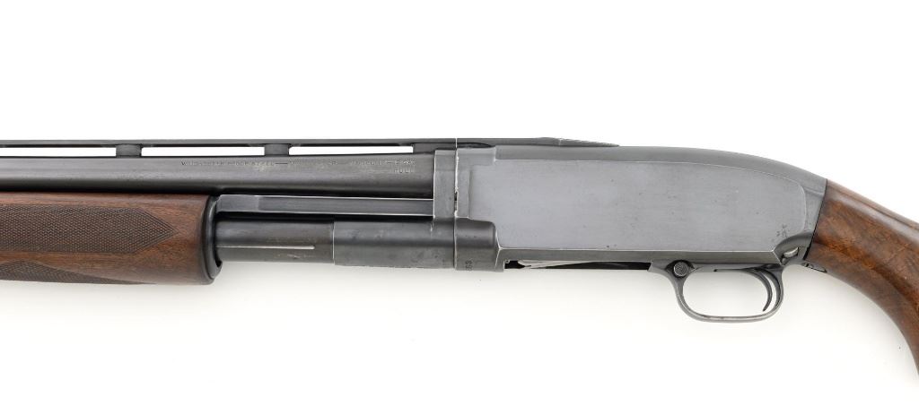 Winchester Model 12 "Standard Trap" Grade Slide Action Shotgun, #599863, 12 ga., 30" vent rib barrel has target beads, 2-3/4" chamber, factory barrel is marked Full but measures IM. The model 12 action is smooth and reliable, and the receiver is unengraved blue. Forend is a checkered full grip, but the buttstock may be a later replacement owing to no grip cap or checkering; buttplate is correct Winchester. Stock dimensions are 14-1/4" x 1-7/8" x 2-1/2". Mfgd 1939. Condition is very good, and definitely serviceable. Retaining approx. 90% blue, with some thinning along the barrel, and spots of edgewear. Wood with scattered moderate marks from handling and use. Except for the buttstock and the vent rib, the gun appears mostly original. Action closes tight and functions correctly; bore is mirror bright. Est.: $800-$1,000. (C&R)