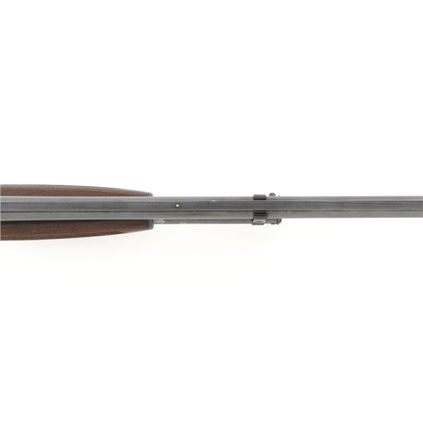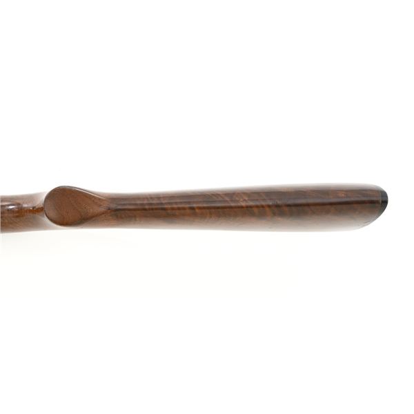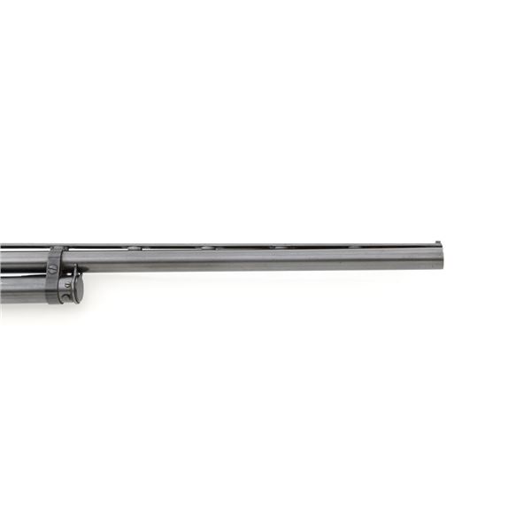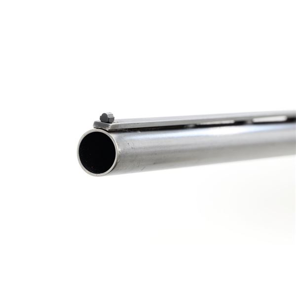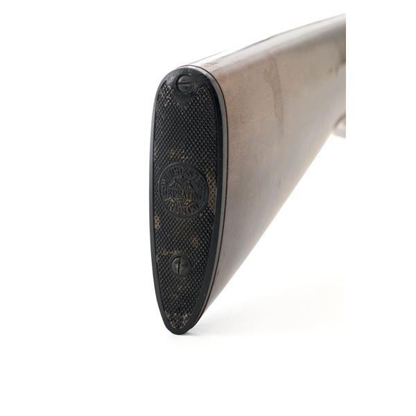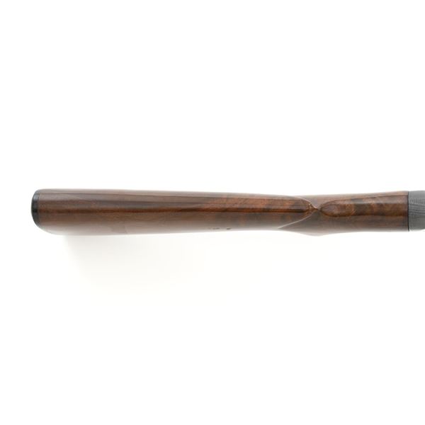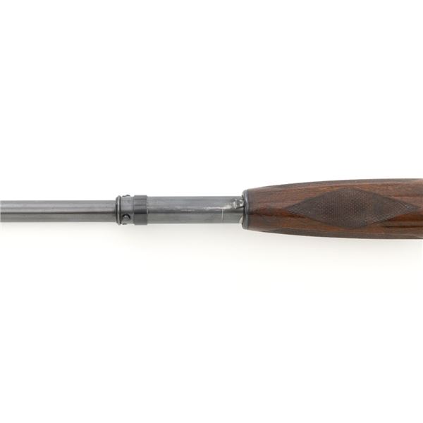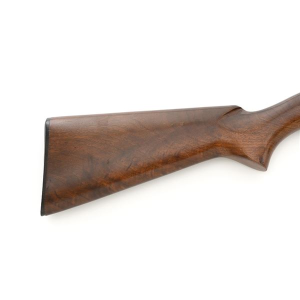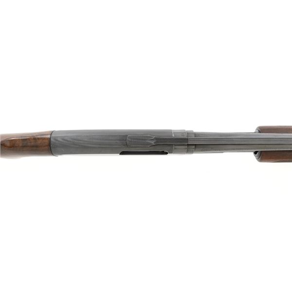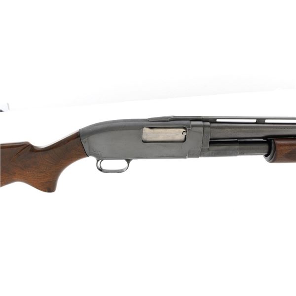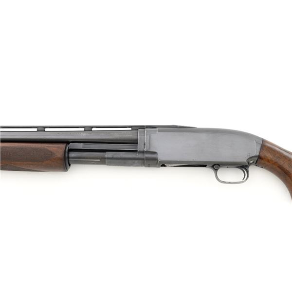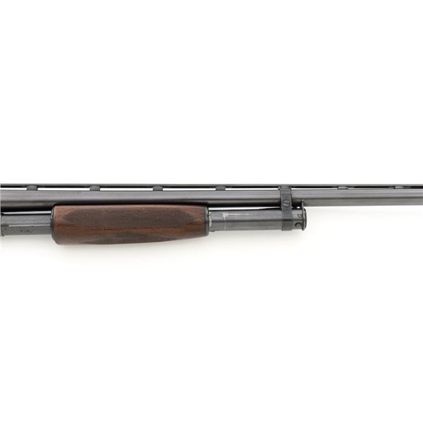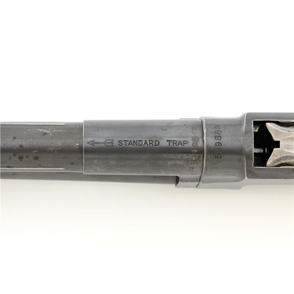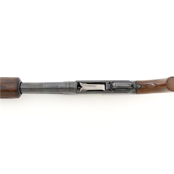 Winchester Model 12 "Standard Trap" Grade Slide Action Shotgun, #599863, 12 ga., 30" vent rib barrel has target beads, 2-3/4" chamber, factory barrel is marked Full but measures IM. The model 12 action is smooth and reliable, and the receiver is unengraved blue. Forend is a checkered full grip, but the buttstock may be a later replacement owing to no grip cap or checkering; buttplate is correct Winchester. Stock dimensions are 14-1/4" x 1-7/8" x 2-1/2". Mfgd 1939. Condition is very good, and definitely serviceable. Retaining approx. 90% blue, with some thinning along the barrel, and spots of edgewear. Wood with scattered moderate marks from handling and use. Except for the buttstock and the vent rib, the gun appears mostly original. Action closes tight and functions correctly; bore is mirror bright. Est.: $800-$1,000. (C&R)