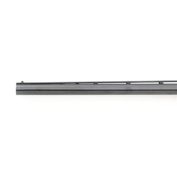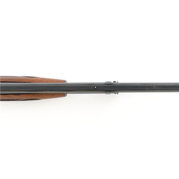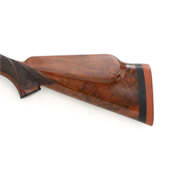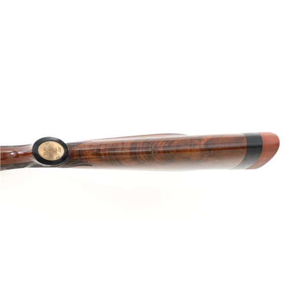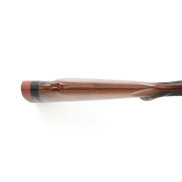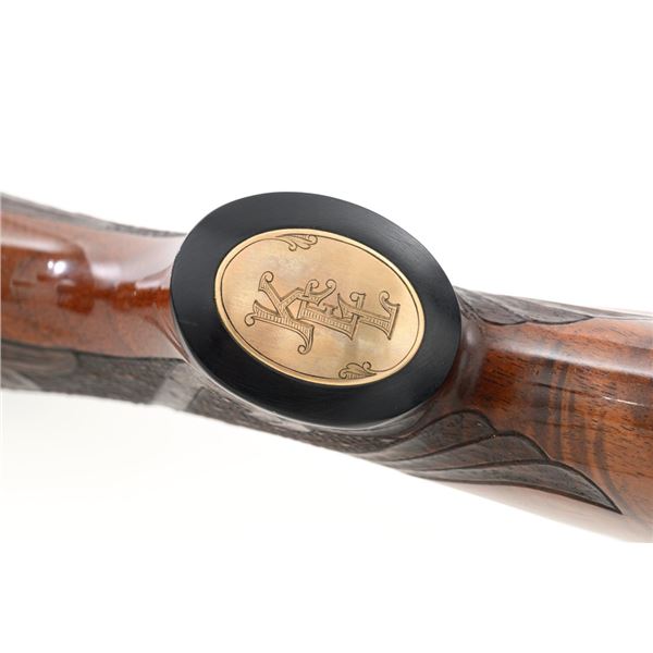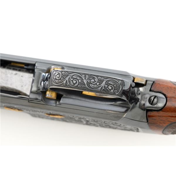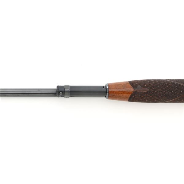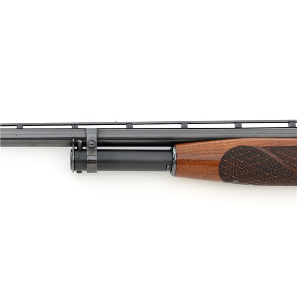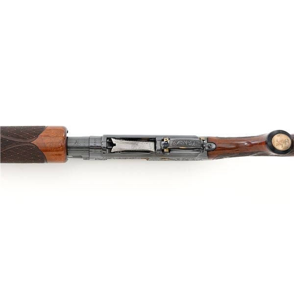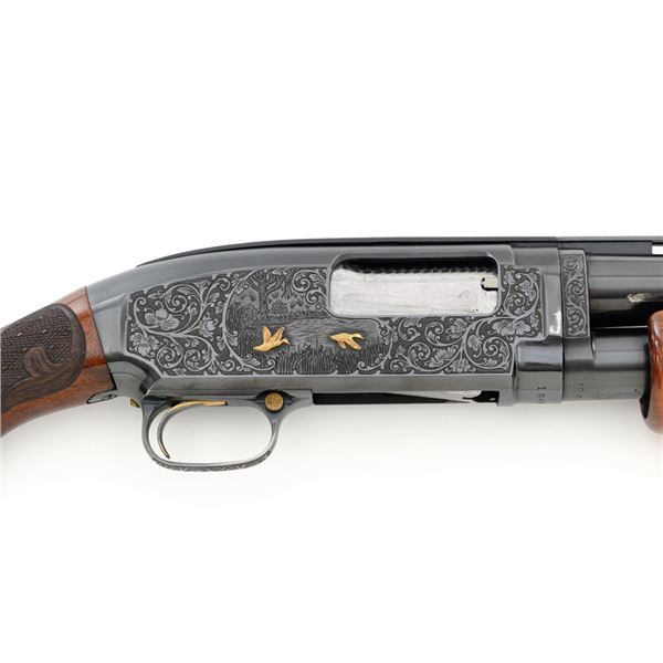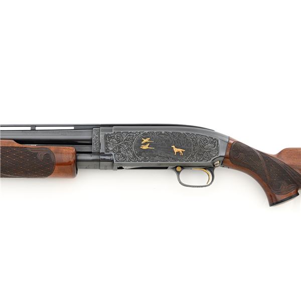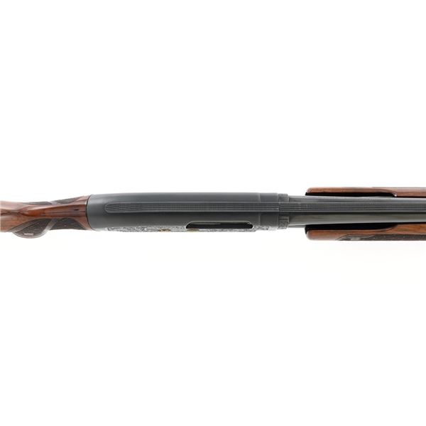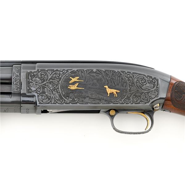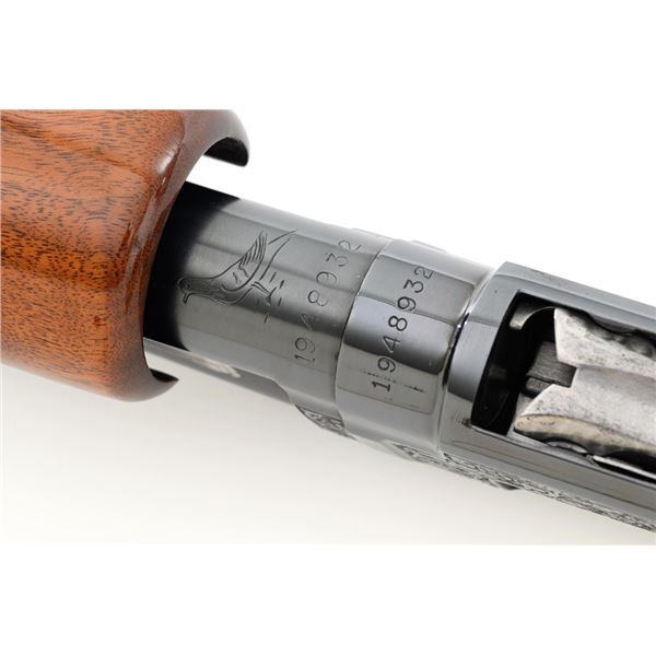 Upgraded Winchester Model 12 Pigeon Grade Slide Action Shotgun, #1948932, 12 ga., 30" barrel has high vent rib that extends over top of the receiver, target beads, 2-3/4" chamber, and a choke that is marked "Full" but measures "IC". The action is standard model 12, but appears hand honed to add smoothness, no safety. Receiver has been ornately engraved with floral designs surrounding game scenes, including a gold setter flushing two pheasants and two ducks rising off a pond. An engraved standing pigeon is on the rear of the magazine tube. Forend and pistol grip buttstock are of high-gloss "C" grade wood, checkered in a unique pattern featuring 22 LPI skip lines, with scroll features around and through the grips. Other features are a brass-inlaid grip cap marked "KEL" and a Pachmayr "Old English" recoil pad. Stock dimensions are 14-1/2" x 1-1/2" x 2-3/8". Gun was made in 1962. Condition is excellent as professionally upgraded. There are a few handling marks to the wood, and the action locks tight and functions correctly; bore is bright. Est.: $2,500-$3,000. (C&R)