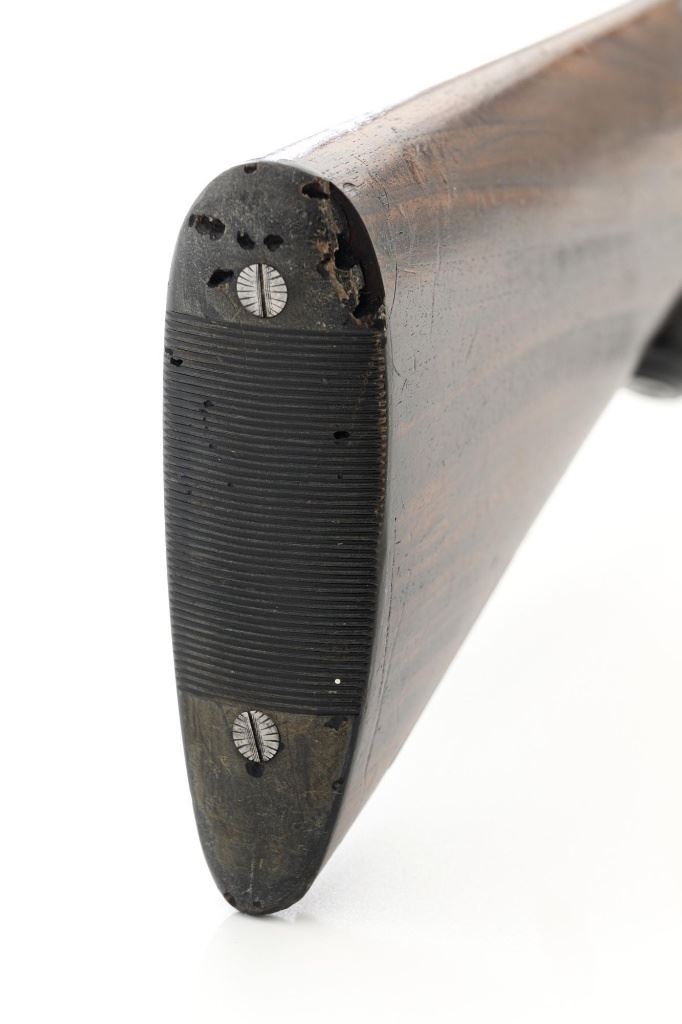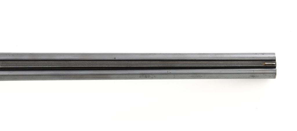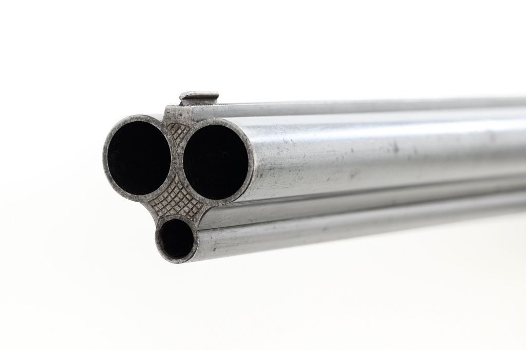 Engraved Pre-War V. Proeck Falkensee Marked German Drilling, #6636319, 16 ga. / 7.8x58mm cal., 23.6" Prima Krupp steel barrels with solid rib, beaded blade front sight, and flip-up notched rear sight; shotgun barrels with Full chokes. Right barrel is marked "v.Proeck" and left barrel is marked "Falkensee". Action has dual underlug plus Greener crossbolt lockup, with cocking indicators for all three barrels; safety is external, double triggers are adjustable. Extensive receiver engraving consists of antlered game scenes surrounded by scroll floral designs. Checkered splinter forend and pistol grip buttstock are straight grain European walnut. Stock with cheek rest, horn trigger guard, storage for four cartridges, and horn buttplate; LOP is 13.9" to the front trigger. Mfgd Pre-WWII. Condition is very good overall, showing general age and wear. Krupp barrels retain most of the blue finish, which shows some areas of thinning and toning, with numerous marks from handling and use. Receiver shows normal toning, engraving is crisp. Stock has numerous light scratches and dents consistent with use. Cracks have developed on both sides of the stock tang at approx. the mid-point, starting where the stock and receiver meet and extending back. Crack on the left is the worst being approx. 1.25" in length. Shell trigger guard has numerous small chips to the edges. Buttplate shows insect damage and is missing an approx. 1" x 1/4" piece. Action functions well. Shotgun barrels are bright and shiny. Rifle barrel is bright with well-defined rifling. Est.: $1,000-$1,500. (C&R)