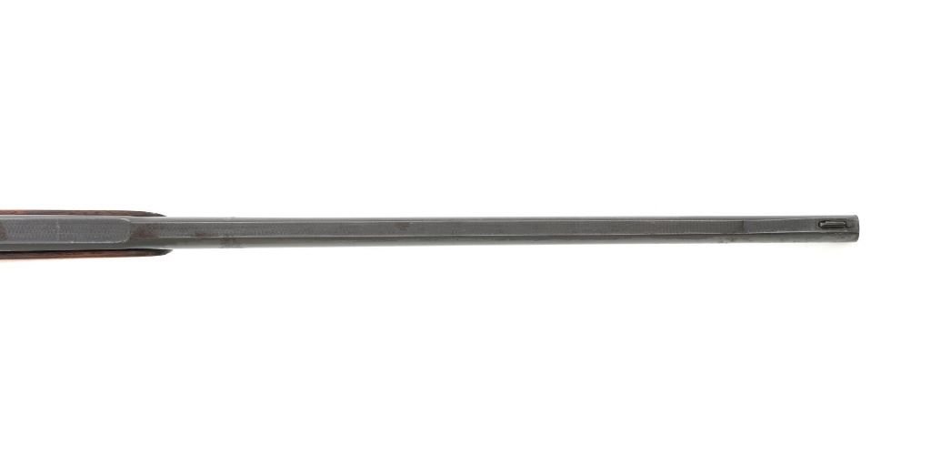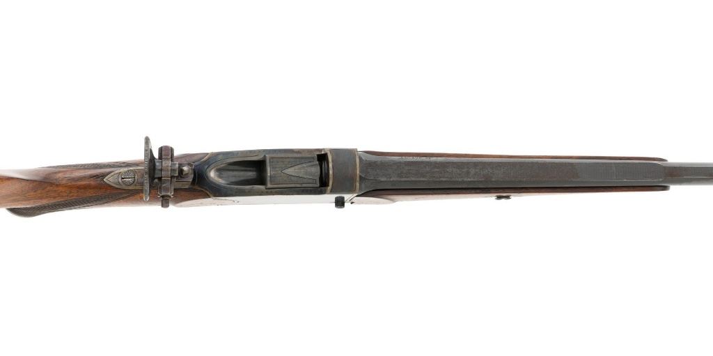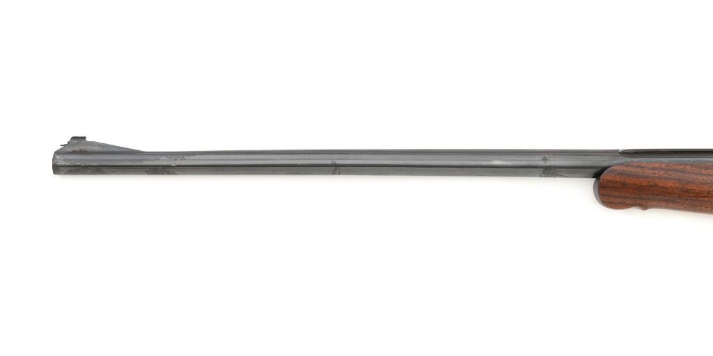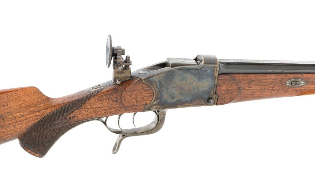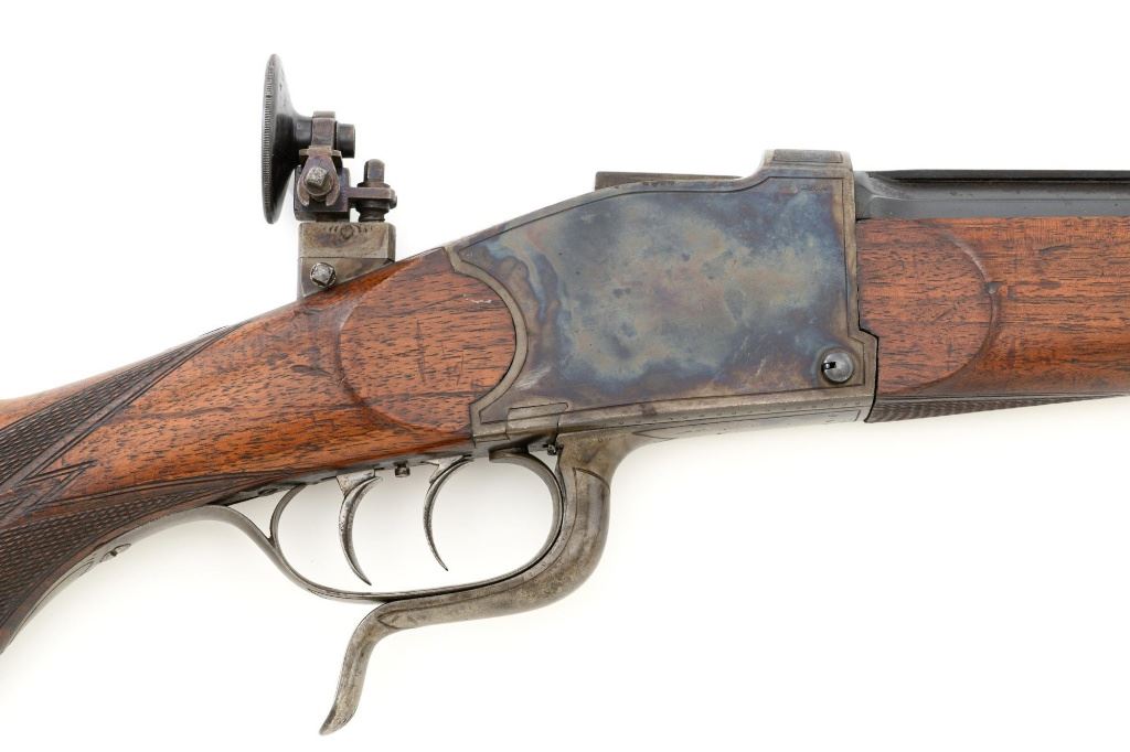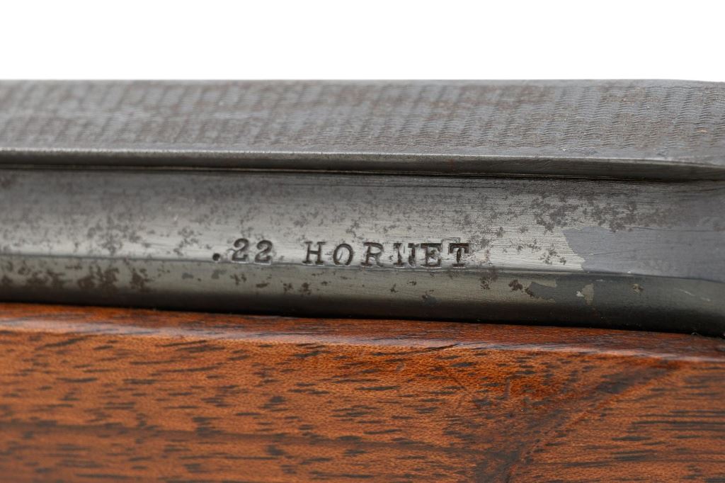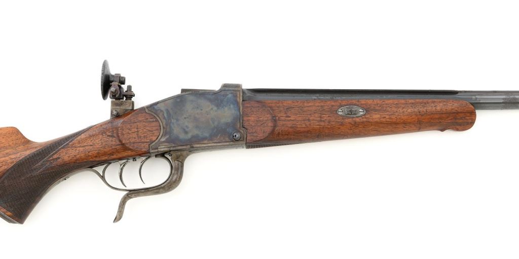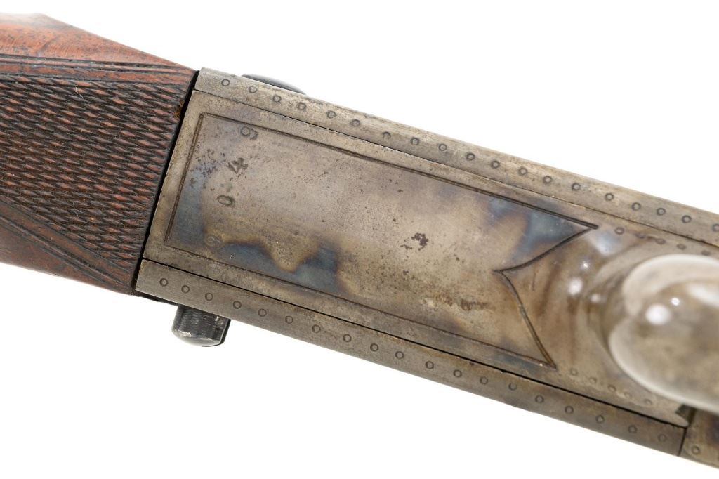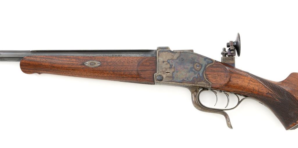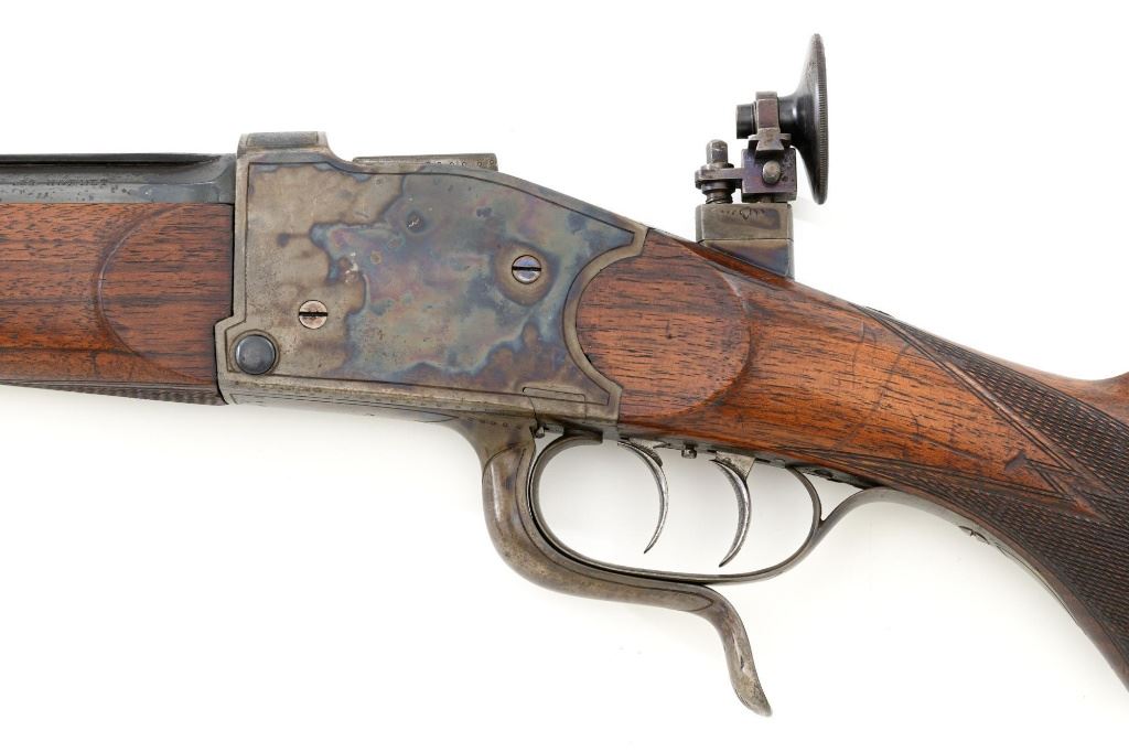 Unmarked Vintage German Falling Block Single Shot Rifle, #9049, .22 Hornet cal., 23.5" octagon to round barrel with full-length hand filed rib, blue and color case hardened finish. Finely checkered walnut pistol grip stock and Schnabel forend, beaded cheekpiece, single crosspin, buttstock ends with a ribbed horn buttplate with engraved screw heads, showing minor insect damage and providing a 14" LOP to the front trigger. Rifle also features a ramped blade front sight, match style aperture sight at the rear, and double set triggers. Caliber is marked on the left side of the barrel at the breech. Rifle is in near fine overall condition, retaining approx. 90%-92% thinning blue on the barrel with areas of light pin prick pitting and surface rust. Receiver and lever display vivid color case hardened finish with edgewear and a few small spots of corrosion. Stock is in near fine condition with scattered indentations, scratches, and nicks along the edge of the cheekpiece. Action functions well and locks up securely. Double set triggers work properly.Barrel has been relined, bore is only fair with moderate rust and pitting near the muzzle. Est.: $700-$900. (C&R)