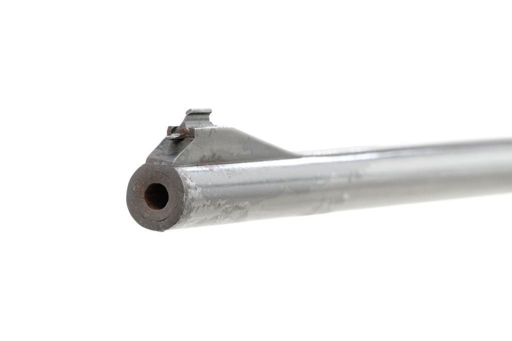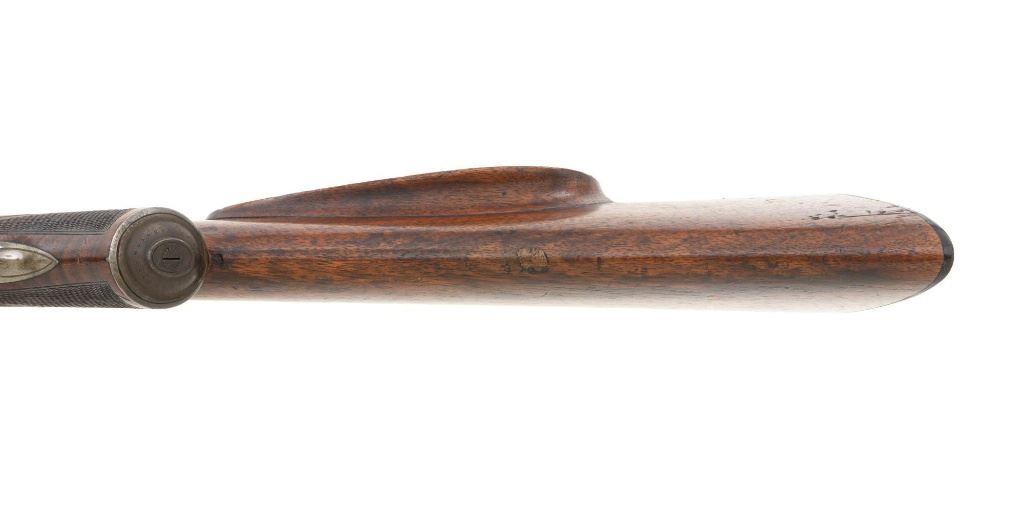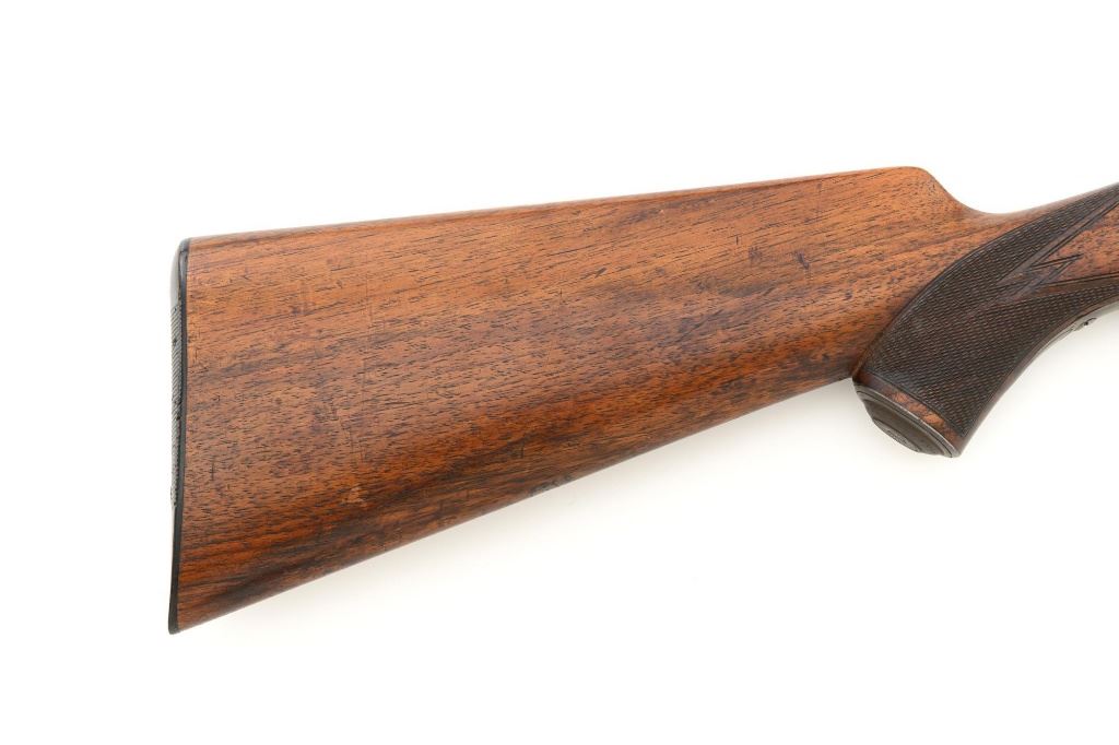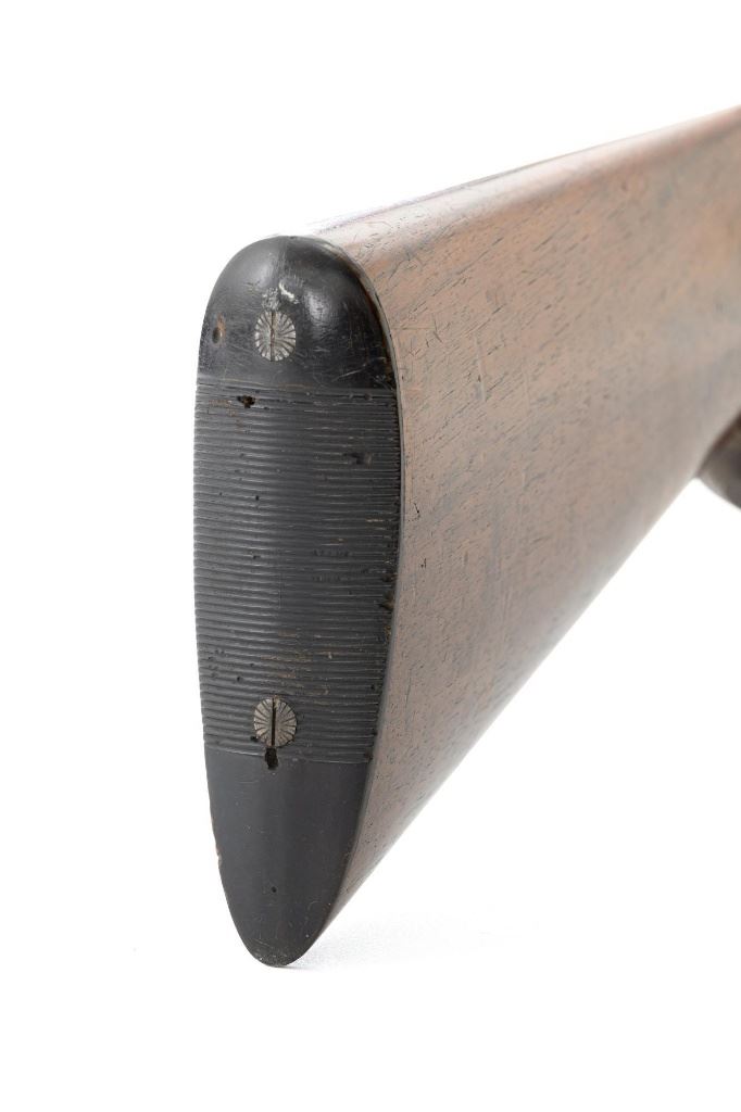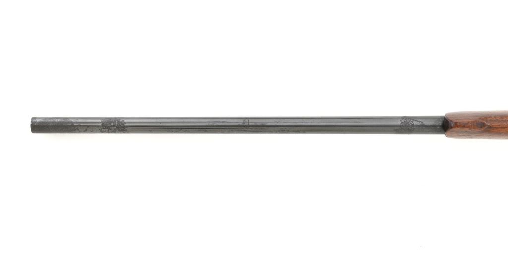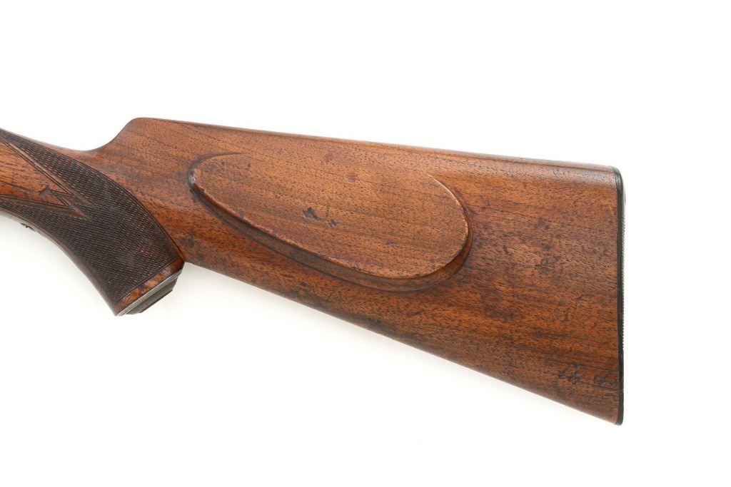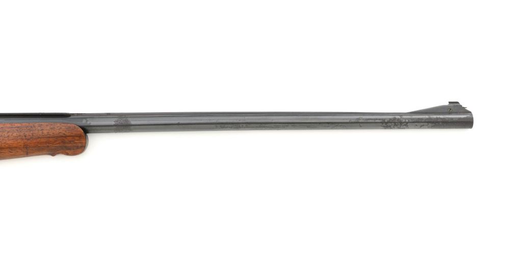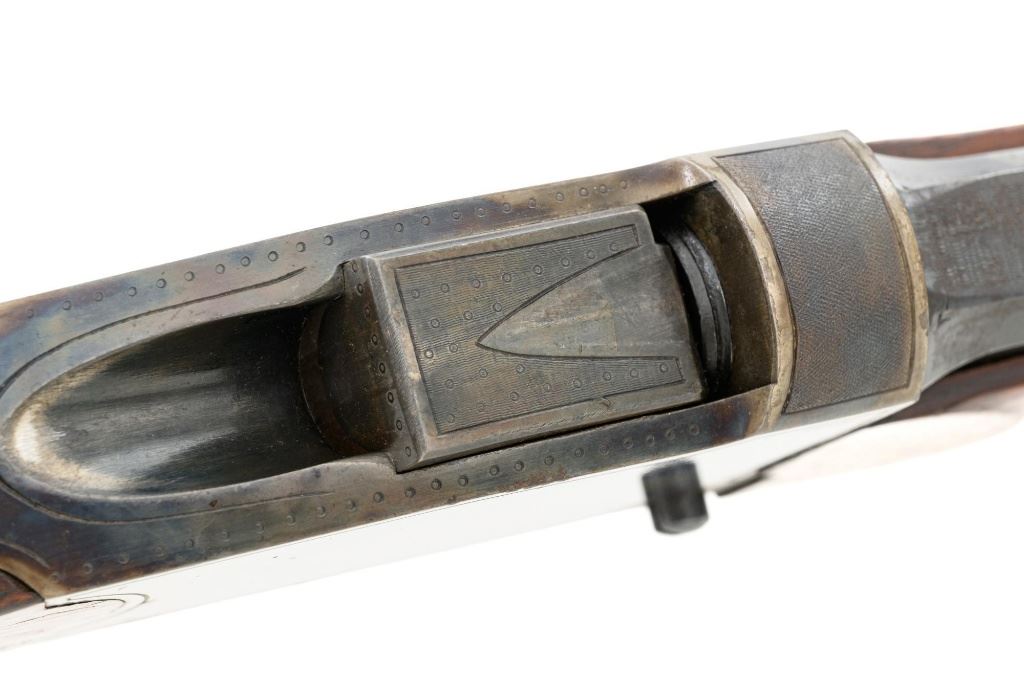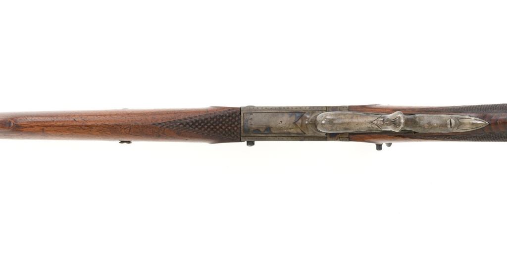Unmarked Vintage German Falling Block Single Shot Rifle, #9049, .22 Hornet cal., 23.5" octagon to round barrel with full-length hand filed rib, blue and color case hardened finish. Finely checkered walnut pistol grip stock and Schnabel forend, beaded cheekpiece, single crosspin, buttstock ends with a ribbed horn buttplate with engraved screw heads, showing minor insect damage and providing a 14" LOP to the front trigger. Rifle also features a ramped blade front sight, match style aperture sight at the rear, and double set triggers. Caliber is marked on the left side of the barrel at the breech. Rifle is in near fine overall condition, retaining approx. 90%-92% thinning blue on the barrel with areas of light pin prick pitting and surface rust. Receiver and lever display vivid color case hardened finish with edgewear and a few small spots of corrosion. Stock is in near fine condition with scattered indentations, scratches, and nicks along the edge of the cheekpiece. Action functions well and locks up securely. Double set triggers work properly.Barrel has been relined, bore is only fair with moderate rust and pitting near the muzzle. Est.: $700-$900. (C&R)