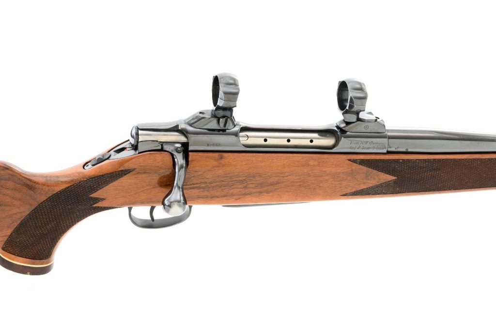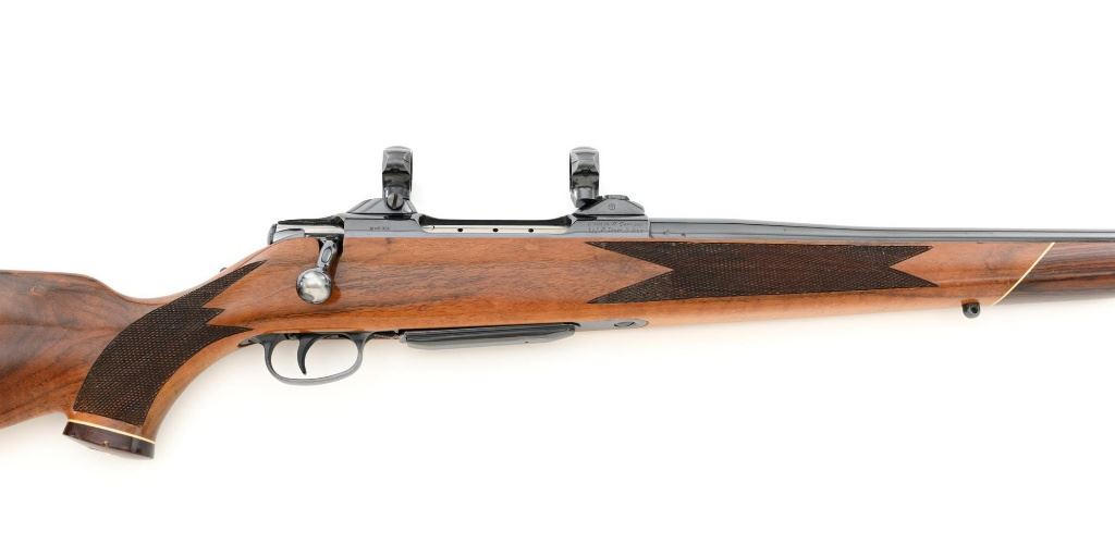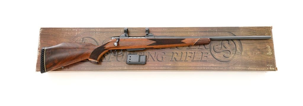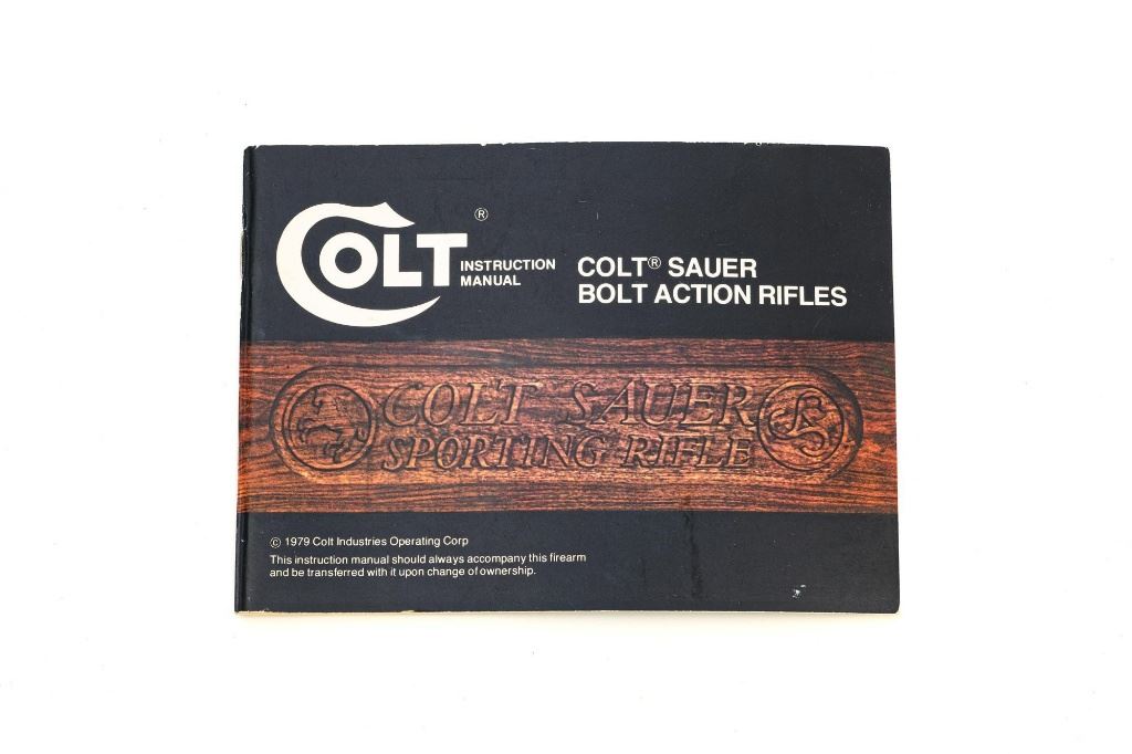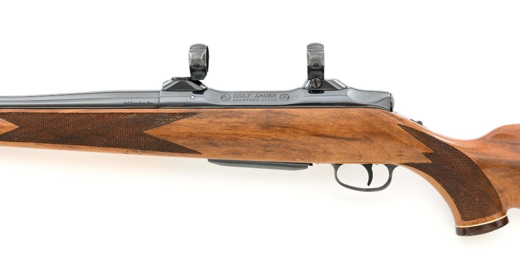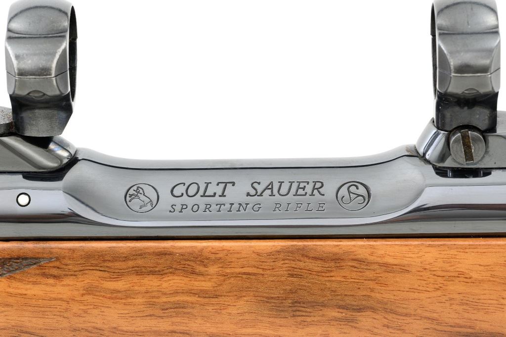West German Colt Sauer Bolt Action Rifle, #CR24789, 7mm Rem. Mag. cal., 24" barrel, blue finish. Finely checkered deluxe walnut one-piece Monte Carlo stock with rosewood forend tip and grip cap with Rampant Colt inlay, and sling swivel studs. Manufactured without sights. Receiver is topped with Redfield two-piece bases and rings. Factory markings are clear, with "Made in W. Germany / by J.P. Sauer & Sohn" on the right side of the barrel. Bolt is stamped with the matching serial number. Mfgd 1980. Includes two (2) Colt 4-round magazines, cardboard shipping and factory box with Styrofoam interior, instruction manual, and five (5) 20-round boxes of Federal Premium ammunition with 160 gr. Nosler Partition bullets. Rifle is in fine overall condition, retaining approx. 95%-96% factory blue, showing wear at the muzzle, intermittent scratches, and marks along the barrel, consistent with field use. Receiver and bottom metal display light edgewear and some minor scratches. Stock is in near fine condition with scattered mostly moderate indentations and scratches. There are a couple of deeper marks on the right side of the buttstock and left side of the forend. Buttstock ends with a Colt/Sauer ventilated rubber recoil pad, providing a 13.75" LOP. Action operates smoothly. Bore is near excellent with well-defined rifling. Est.: $2,000-$2,500. (Modern)