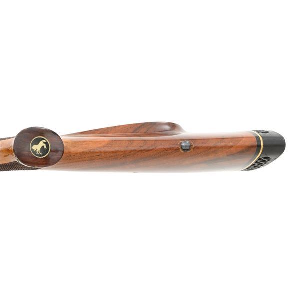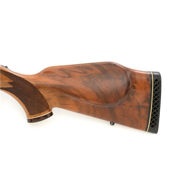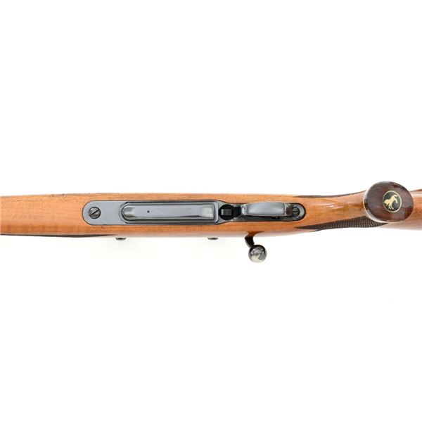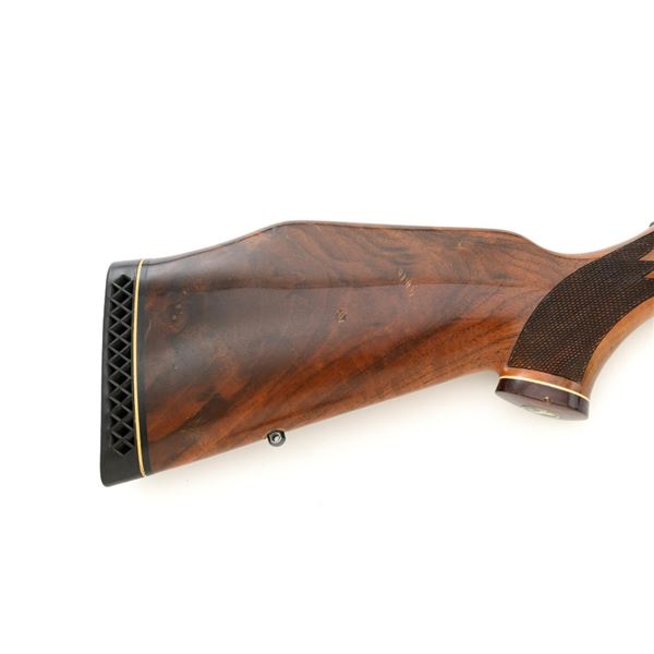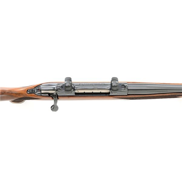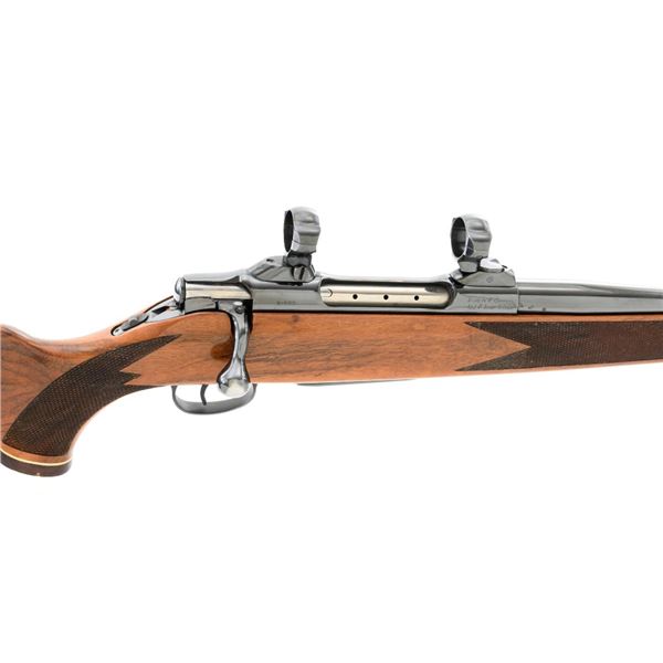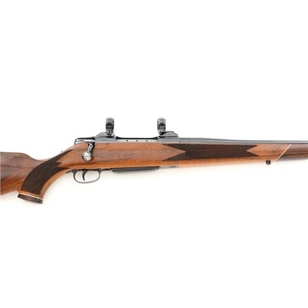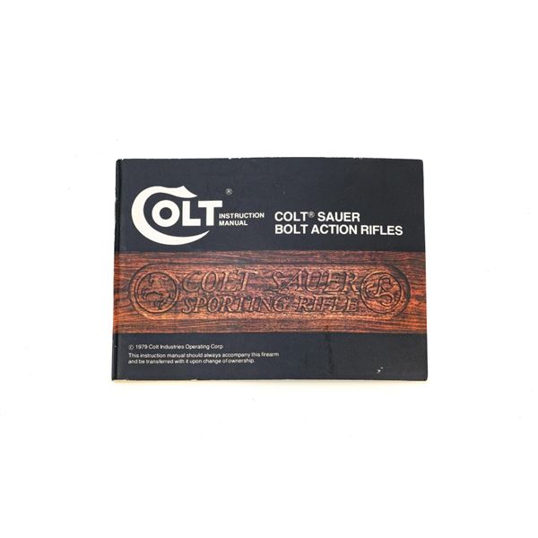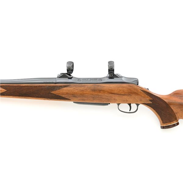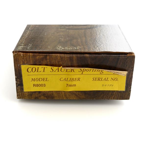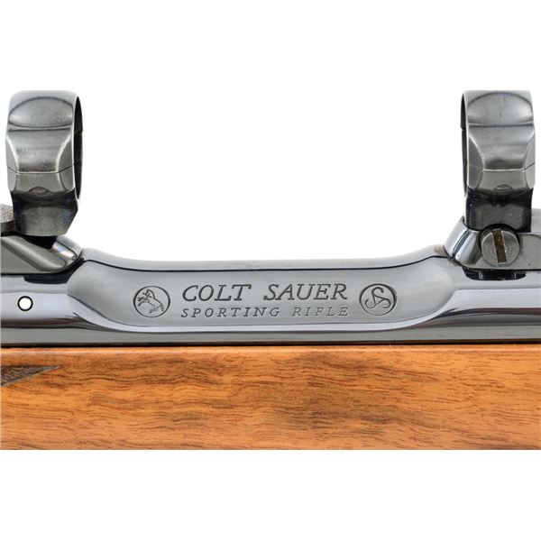 West German Colt Sauer Bolt Action Rifle, #CR24789, 7mm Rem. Mag. cal., 24" barrel, blue finish. Finely checkered deluxe walnut one-piece Monte Carlo stock with rosewood forend tip and grip cap with Rampant Colt inlay, and sling swivel studs. Manufactured without sights. Receiver is topped with Redfield two-piece bases and rings. Factory markings are clear, with "Made in W. Germany / by J.P. Sauer & Sohn" on the right side of the barrel. Bolt is stamped with the matching serial number. Mfgd 1980. Includes two (2) Colt 4-round magazines, cardboard shipping and factory box with Styrofoam interior, instruction manual, and five (5) 20-round boxes of Federal Premium ammunition with 160 gr. Nosler Partition bullets. Rifle is in fine overall condition, retaining approx. 95%-96% factory blue, showing wear at the muzzle, intermittent scratches, and marks along the barrel, consistent with field use. Receiver and bottom metal display light edgewear and some minor scratches. Stock is in near fine condition with scattered mostly moderate indentations and scratches. There are a couple of deeper marks on the right side of the buttstock and left side of the forend. Buttstock ends with a Colt/Sauer ventilated rubber recoil pad, providing a 13.75" LOP. Action operates smoothly. Bore is near excellent with well-defined rifling. Est.: $2,000-$2,500. (Modern)