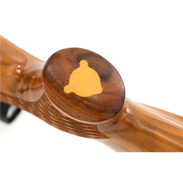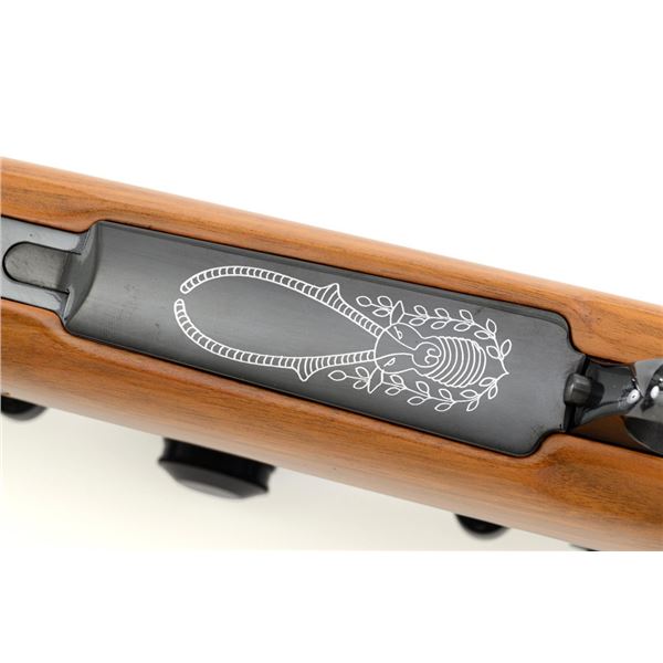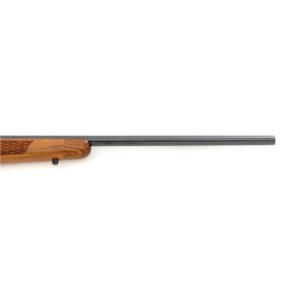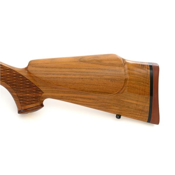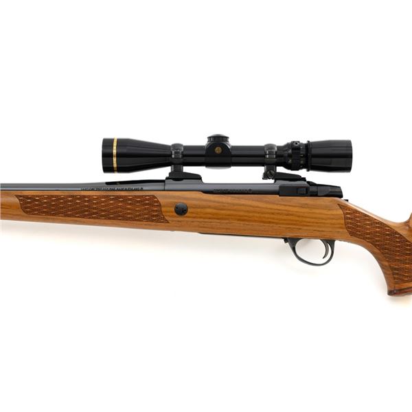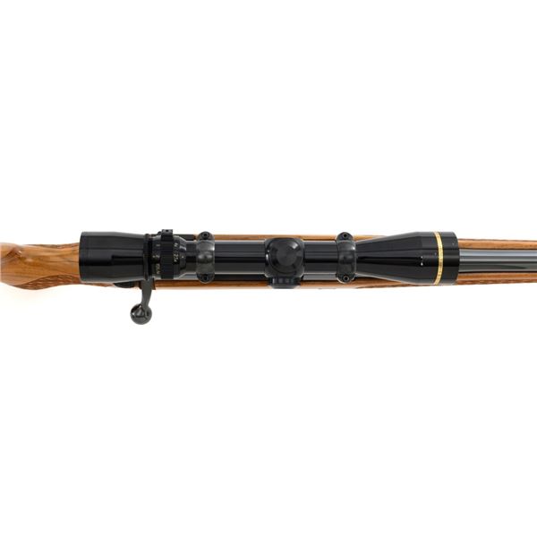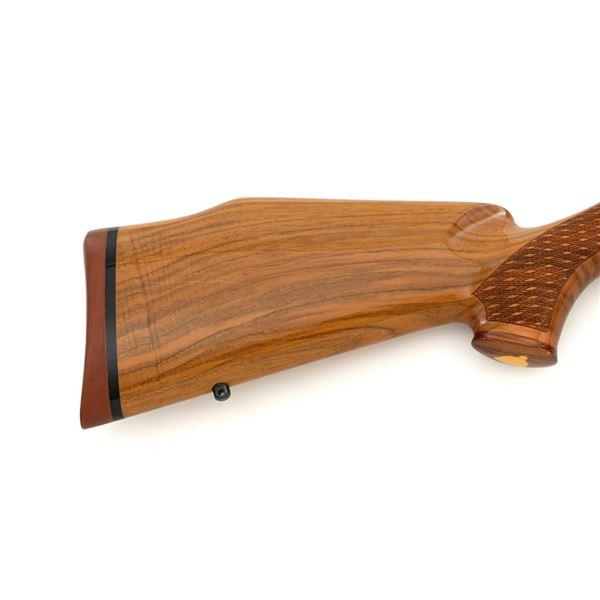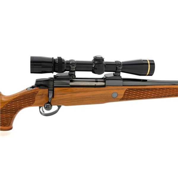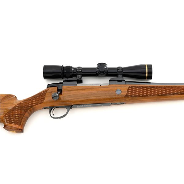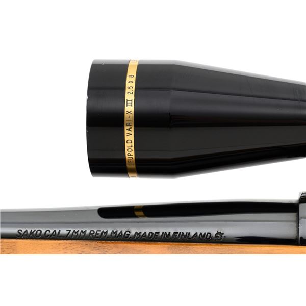 Sako AV Deluxe Bolt Action Rifle, #594379, 7mm Rem. Mag. cal., 23" barrel, with blue finish. Skipline checkered deluxe walnut one-piece Monte Carlo stock with exotic forend tip and grip cap, sling swivel studs, crossbolt, ending with a solid red rubber Sako recoil pad, providing a 14" LOP. Manufactured without sights. Factory markings are clear, bolt with matching serial number, and "MADE IN FINLAND" on the right side of the barrel. Rifle is topped with Redfield two-piece bases, rings, and a Leupold VARI-X III 2.5-8x scope, finished in gloss black, with a duplex reticle. Scope is in very good condition, with scratches and scuffs on the front bell, optics are clear and crisp. Rifle is in excellent overall condition, retaining approx. 98%-99% factory finish, with a few light handling marks, and modest edgewear to the receiver. Magazine floorplate and trigger guard are decorated with silver floral and antlered game inlay. Stock is in excellent condition with minor storage marks and sharp checkering detail. Action functions smoothly with a crisp trigger. Bore is excellent with well-defined rifling. Est.: $1,500-$2,000. (Modern)