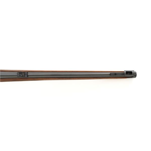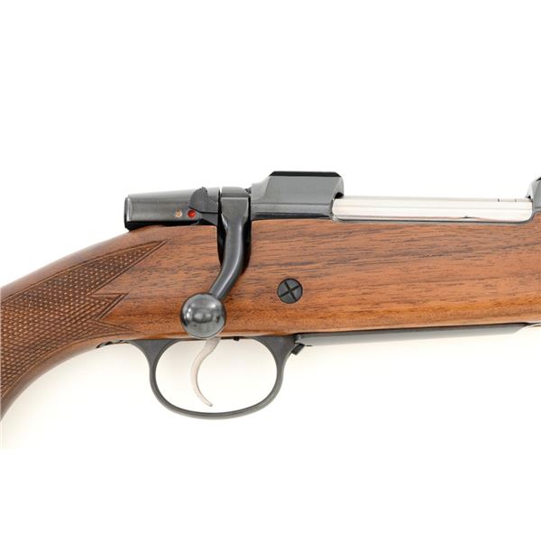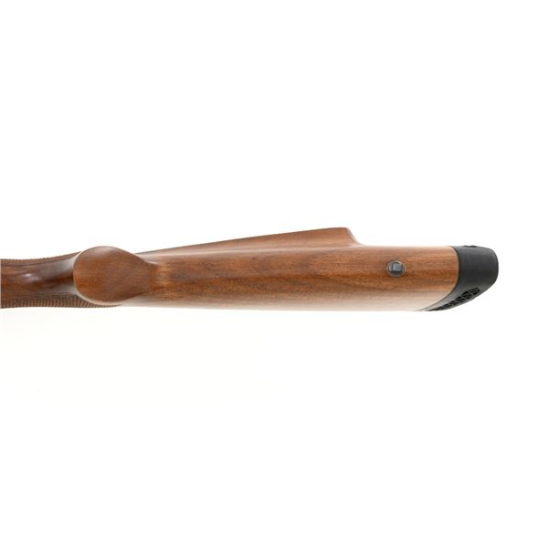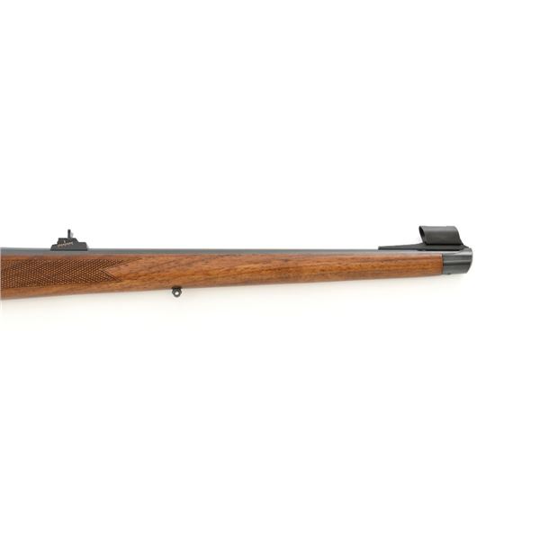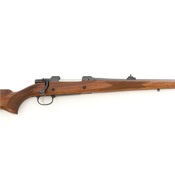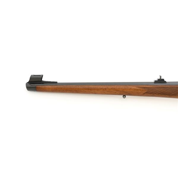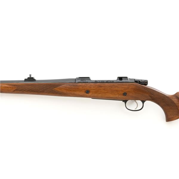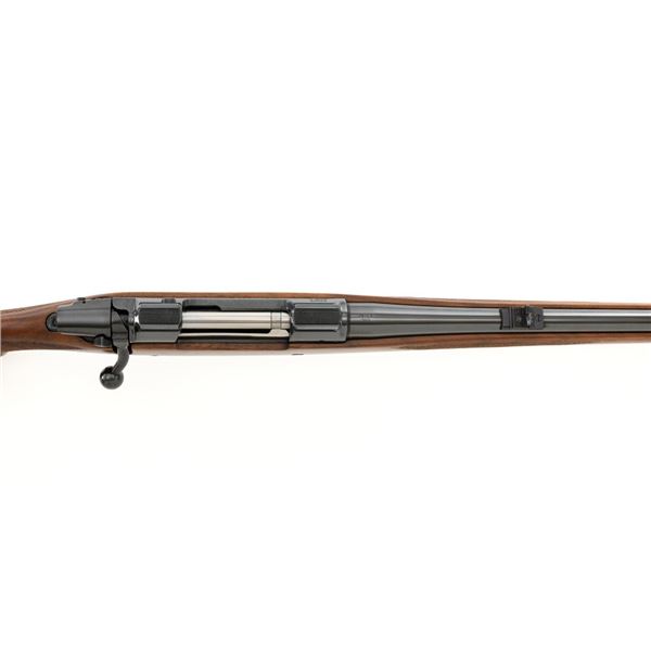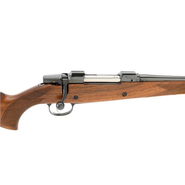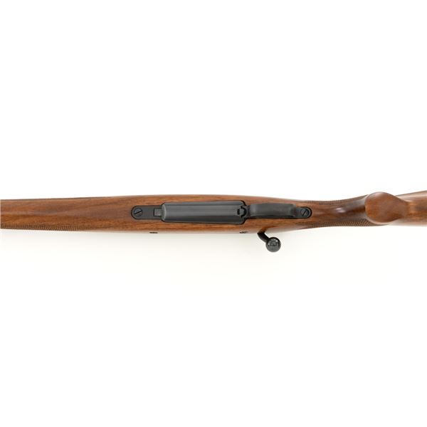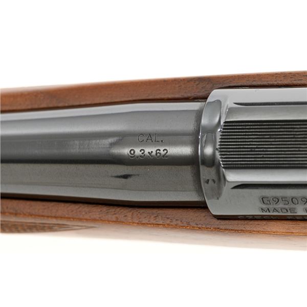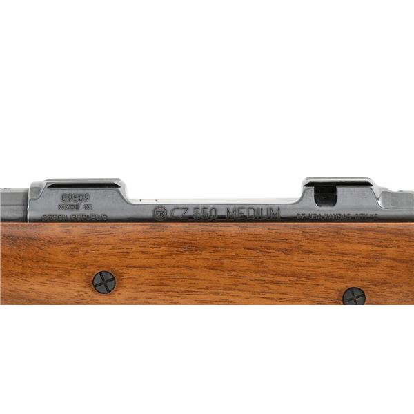 CZ Model 550 Medium Lux Bolt Action Rifle, #G9509, 9.3x62 cal., 20.5" barrel, with polished blue finish. Finely checkered Turkish walnut one-piece Mannlicher style pistol grip stock with European "hogback" buttstock, featuring a blue steel nose cap, two crossbolts, cheekpiece, sling swivel studs, ends with a black CZ ventilated rubber recoil pad, providing a 14.25" LOP. Rifle also features a hooded ramped blade front sight, adjustable "U"-notched rear sight, single set trigger, and 4-shot hinged box magazine. Rifle is excellent, appearing as new, retaining approx. 99% factory finish, with only light handling marks. Receiver includes double square bridge integral factory mounts. Stock is excellent with outstanding fit and finish. Action functions smoothly and the single set trigger functions well and breaks crisply. Bore is mirror bright with excellent rifling. Developed in 1905, the 9.3 x 62 cartridge has been popular with game hunters around the world for over 120 years and remains in use today. Est.: $1,000-$1,500. (Modern)