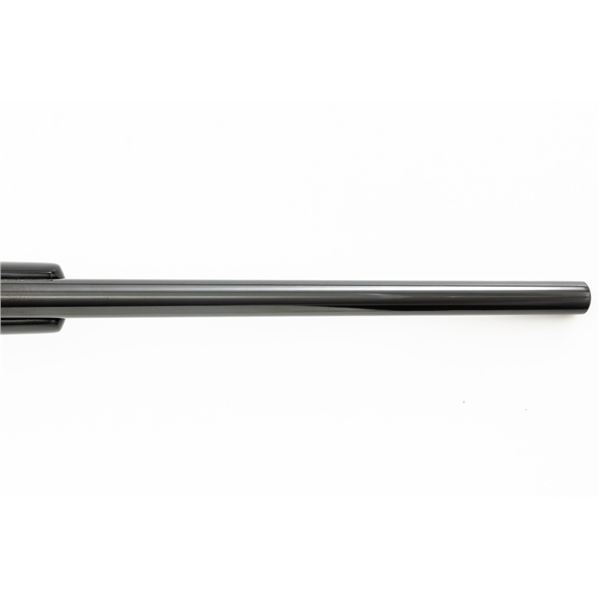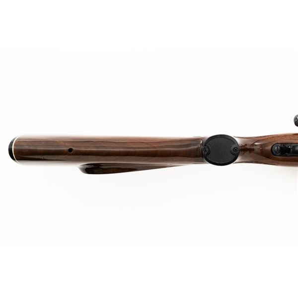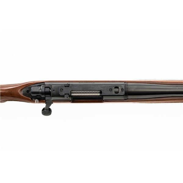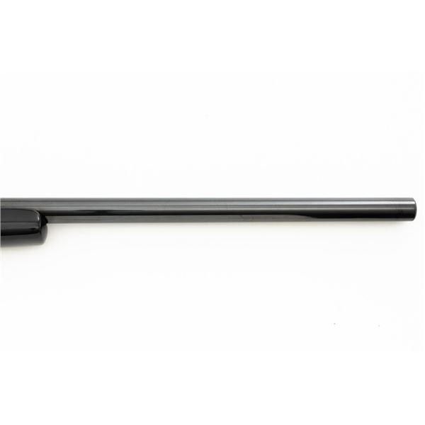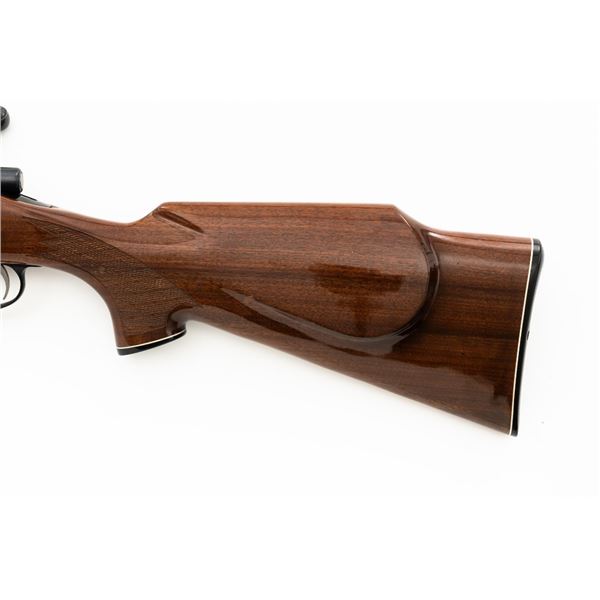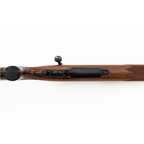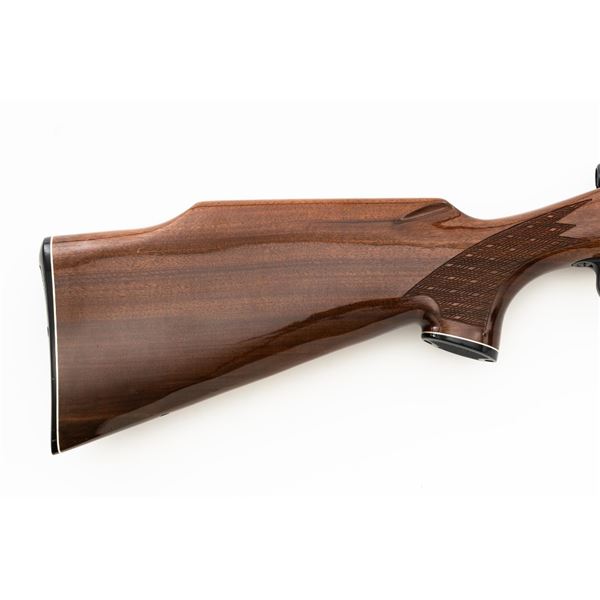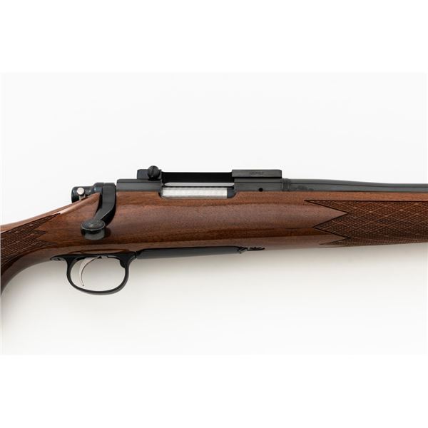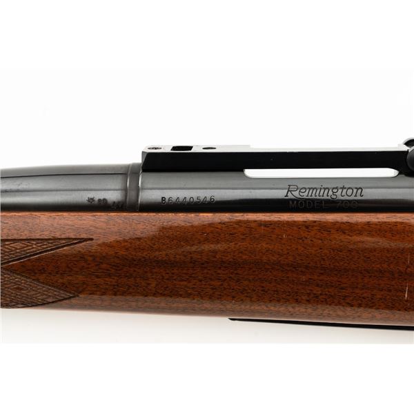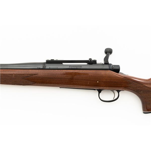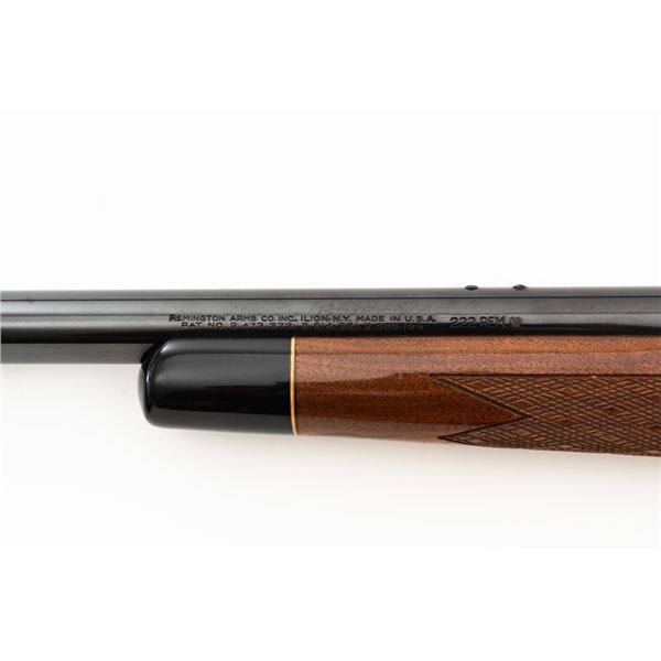 Remington Model 700 BDL Varmint Special Bolt Action Rifle, #B6440546, .222 Rem. Mag. cal., 24" heavy barrel, with blue finish. Skip-line checkered walnut one-piece Monte Carlo stock with an ebony forend tip and grip cap, sling swivel studs have been removed, buttstock ends with a checkered plastic buttplate, providing a 13.4" LOP. There are no sights and the sight block has been removed. Receiver is topped with a Leupold one-piece scope base, scope rings included. Factory jeweled bolt is etched with matching serial number. Mfgd 1983. Rifle is in near excellent overall condition, retaining approx. 97%-98% factory blue, with light scratches and minor marks on the barrel and trigger guard, modest edgewear on the receiver. Stock is in fine condition, with scattered scrapes and scuffs. Including a deeper dent on the cheekpiece. Action is smooth with a crisp trigger. Bore is near excellent with well-defined rifling.Lot includes RCBD full length sizing die, RCBS neck sizing die, Lyman seating die, and 47 pieces of fired brass. Est.: $900-$1,100. (Modern)