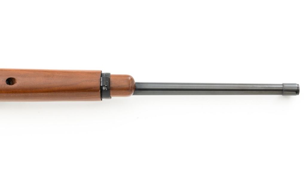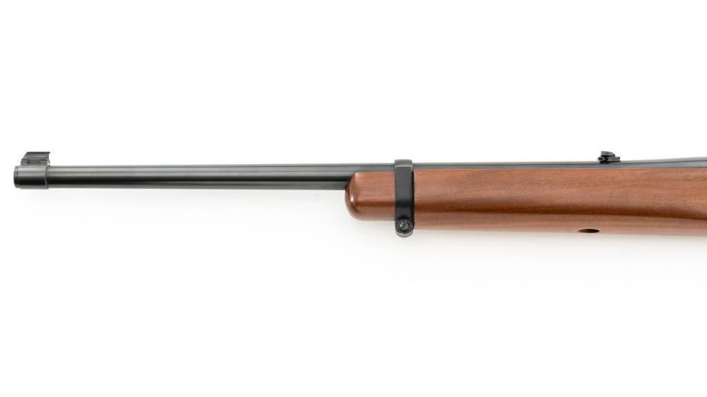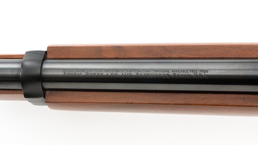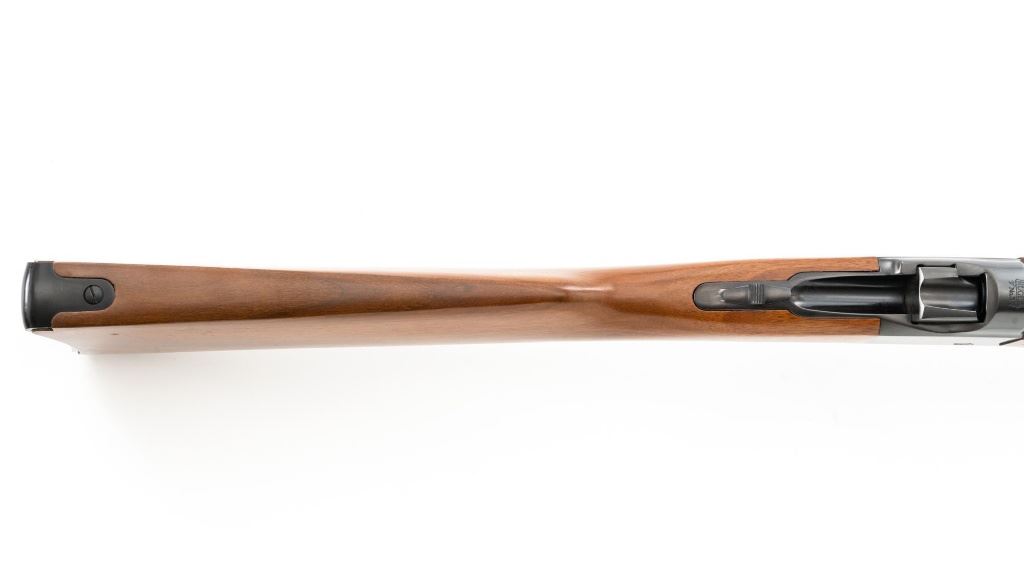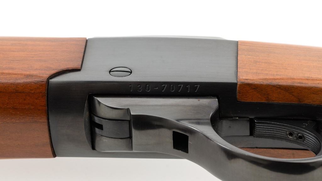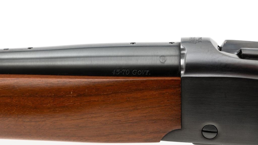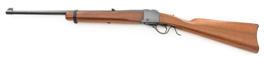 Ruger No. 3 Single Shot Carbine, #130-70717, .45-70 cal., 22" barrel, blue finish, smooth walnut straight grip stock and forend with barrel band, ending with a smooth black plastic buttplate, providing a 13.5" LOP. Sights includ a banded brass tipped blade front and folding rear sight. Barrel is drilled and tapped for sight blocks. Rifle also features a tang safety. Mfgd 1979. Carbine is in excellent overall condition, retaining approx. 99% factory blue, showing little evidence of use. Stock has only a few minor storage marks. Action is crisp and locks up securely. Bore is mirror bright with excellent rifling. Est.: $700-$1,000. (Modern)
