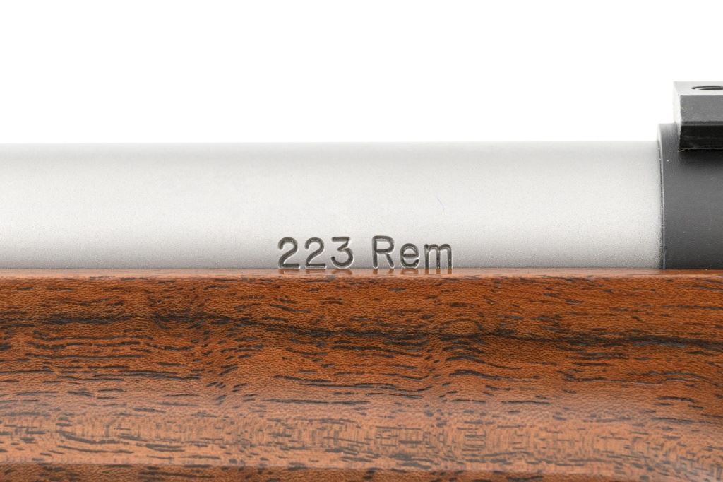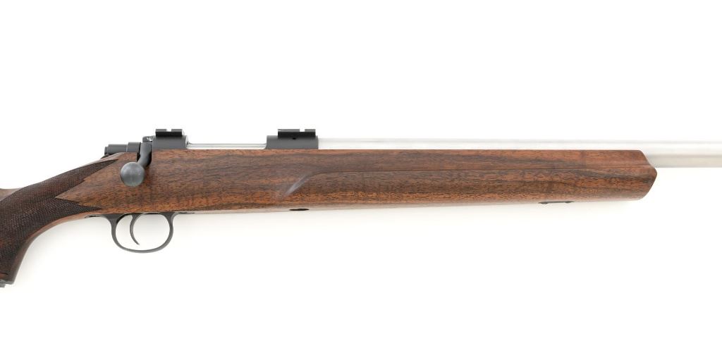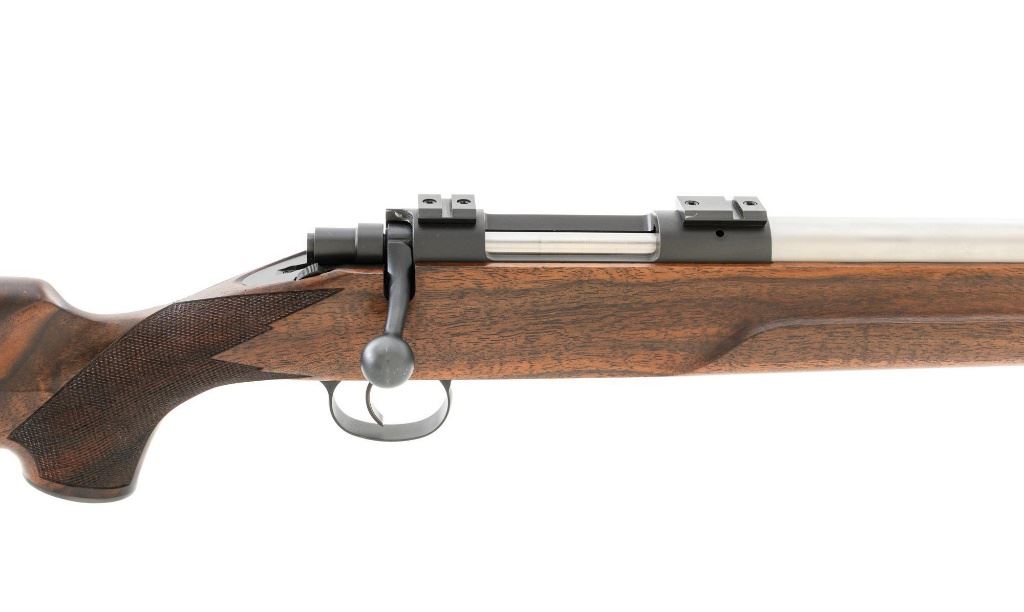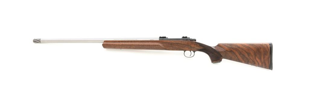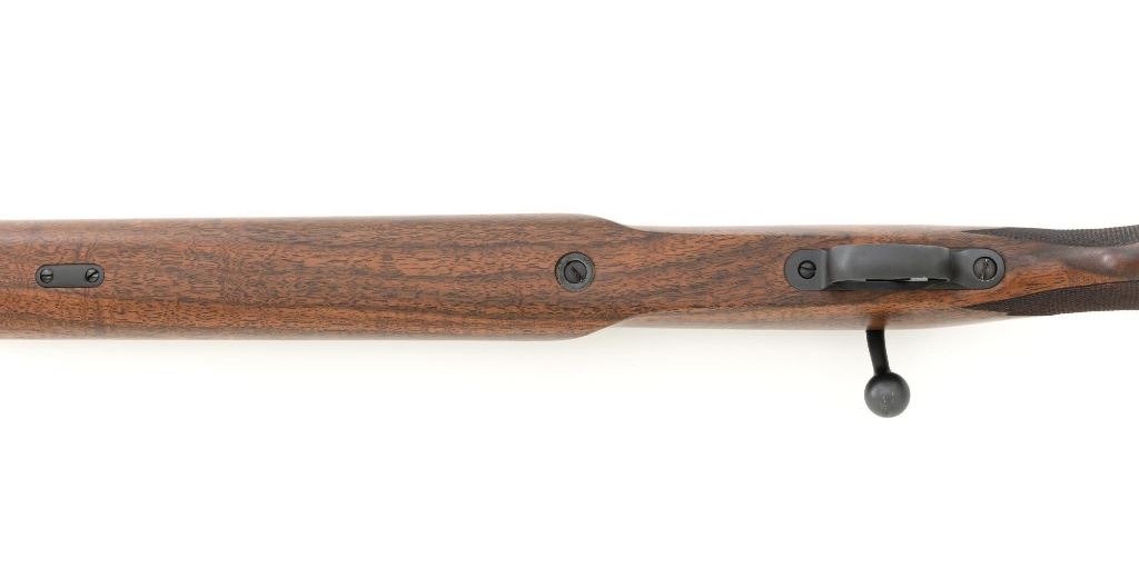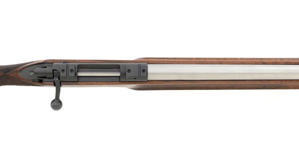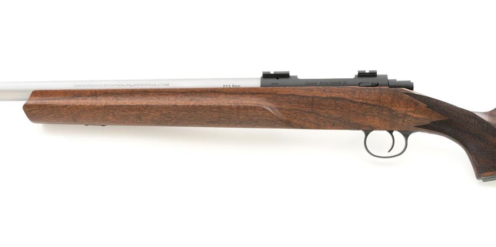 Cooper of Montana Model 21 Varminter Single Shot Bolt Action Rifle, #8298, .223 Rem. cal., 24" factory ported heavy barrel, satin stainless/blue finish, finely checkered Claro walnut one-piece pistol grip stock with beavertail forend, Fischer style blue steel grip cap, sling swivel studs removed and nicely filled with matte blue plates. Manufactured without sights. Receiver is topped with a two-piece set of Warne bases. Factory markings are clear. Bolt is etched with the matching serial number. Rifle is in excellent overall condition, showing little use. Stock has a few minor storage marks and attractive figure in the buttstock, which ends with a solid rubber Pachmayr recoil pad, providing a 13.75" LOP. Action is very smooth with a crisp trigger pull. Bore is mirror bright with excellent rifling. Est.: $1,500-$2,500. (Modern)