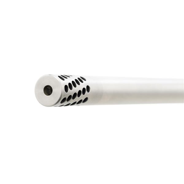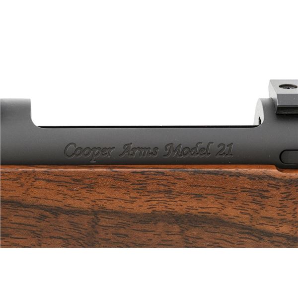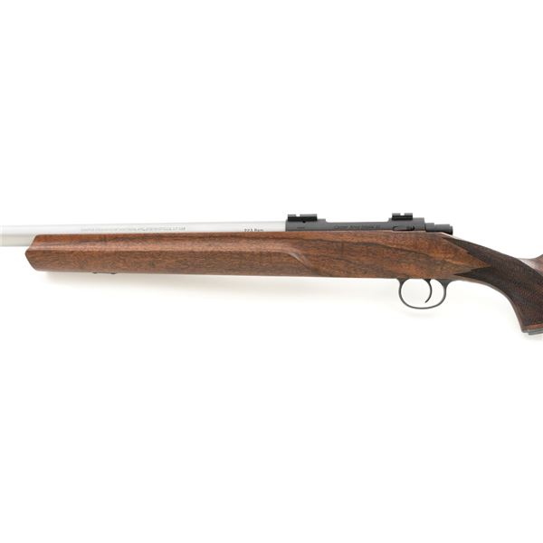 Cooper of Montana Model 21 Varminter Single Shot Bolt Action Rifle, #8298, .223 Rem. cal., 24" factory ported heavy barrel, satin stainless/blue finish, finely checkered Claro walnut one-piece pistol grip stock with beavertail forend, Fischer style blue steel grip cap, sling swivel studs removed and nicely filled with matte blue plates. Manufactured without sights. Receiver is topped with a two-piece set of Warne bases. Factory markings are clear. Bolt is etched with the matching serial number. Rifle is in excellent overall condition, showing little use. Stock has a few minor storage marks and attractive figure in the buttstock, which ends with a solid rubber Pachmayr recoil pad, providing a 13.75" LOP. Action is very smooth with a crisp trigger pull. Bore is mirror bright with excellent rifling. Est.: $1,500-$2,500. (Modern)